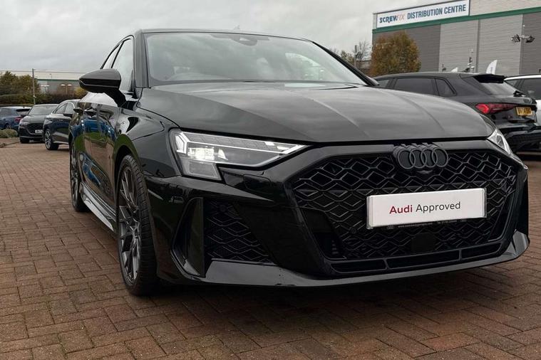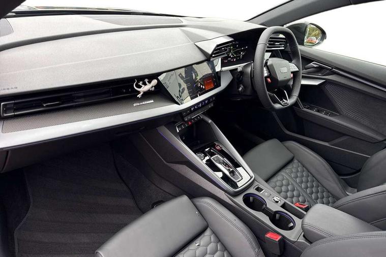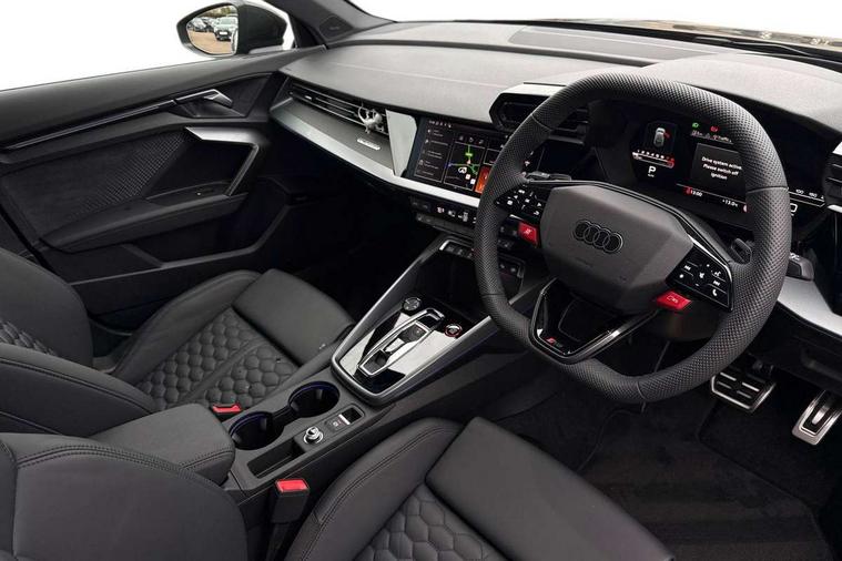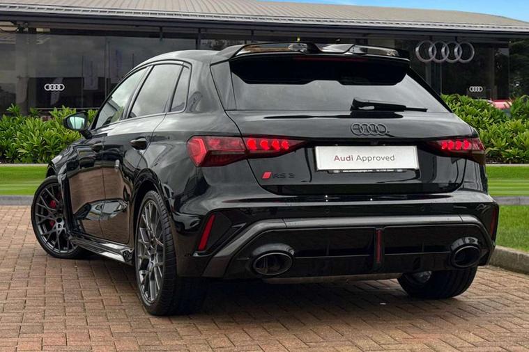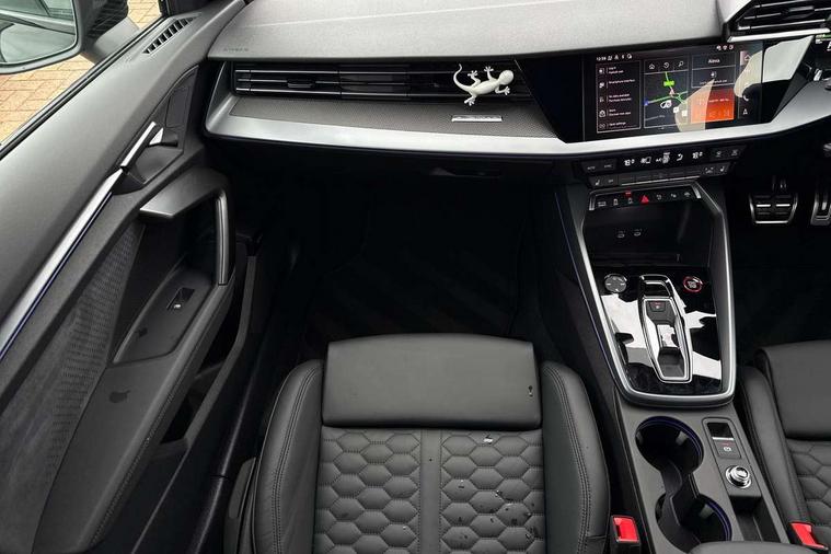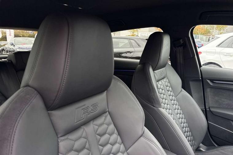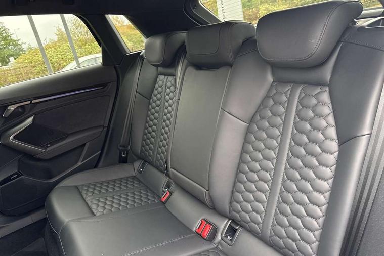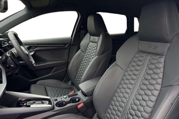 Adjustable speed limiter, Audi drive select comfort, auto, dynamic and efficiency, Audi smartphone interface with app store includes wireless Apple carplay, Android auto and Amazon alexa integration, Audi virtual cockpit plus with RS specific design and 12.3" display with additional graphic display options, Automatic start/stop system with recuperation, Bluetooth interface, Camera based traffic sign recognition, Collision avoidance assistant, Distraction and Fatigue warning, e-Call (emergency call), Lane departure warning system, MMI Navigation Plus with high resolution 10.1" colour touch screen display, Park Assist with parking system Plus, Progressive steering, RS specific driving modes - RS Individual, RS Performance and RS Torque rear, Voice control system with natural language interaction, Quattro permanent four wheel drive, Audi Phonebox light with wireless charging, DAB Digital radio, USB ports with charging function in the rear, All weather light, Audi beam LED projection of RS logo on ground as you exit, Audi darkened matrix LED headlights with dynamic light sequencing and dynamic indicator, Auto dimming frameless rear view mirror, Automatic dynamic range control, Carbon door mirror housings, Carbon fibre engine cover, Dipped beam, main beam, position light and turning light, Dynamic RS specific light sequencing of the coming home and leaving home function, Electrically adjustable/heated/folding/auto dimming door mirrors with integrated LED indications + kerb view function for passenger side, Exterior model badging, Front electric windows, Headlight cleaning system, Heat insulating glass windscreen, Intersection light, LED 3rd brake light, LED brake lights, LED rear lights with dynamic light sequencing and dynamic indicator, LED rear number plate lights, LED reverse light, LED tail lights, Light and rain sensors, Manoeuvring light, Motorway light, Privacy glass - dark tinted rear window, rear door and side windows, Rear electric windows, Rear side wing doors, Rear wiper, Roof edge spoiler in carbon, RS dual branch exhaust system with two chrome plated oval tailpipe trims, Static Cornering lights, Visually upgraded RS specific daytime running light choice of 4 digital signature in chequered flag design within the headlight, 12V socket and storage compartment in front centre console, 3 seat bench in 2nd row, 3 Spoke flat top and bottomed black leather multi function steering and gear shift paddles, 3-zone deluxe automatic air conditioning, 40/20/40 split folding rear seat bench, Black cloth headlining, Black front and rear floor mats, Front and rear headrests, Front centre armrest, Front door sill trims with RS 3 logo, Front sports seats RS embossed logo, Heated front seats, Height and reach adjustable steering wheel, Manual boot compartment lid, Manually adjustable front seats, Rear centre armrest with cupholder, Seat side bolsters, Single front passenger seat, Stainless steel pedals and front footrest in black, Vanadium look - Interior door handles, Door trim, power latching, Air vents, window controls, mirror adjust, rear door lock, Selector lever in centre console, Black Styling plus package - RS3, Extended ambient lighting package Pro with Multi-coloured contour lighting of instrument panel - RS3, RS exterior features pack in carbon and gloss black - RS3, RS sport suspension pack - RS3, Storage package - RS3 Sportback, Technology package without speed limiter - RS3, 3x3 point rear seat belts, Driver and front passenger airbag with passenger airbag deactivation, Electronic Stabilisation Control (ESC) including ABS, ASR and EDL, First aid kit with warning triangle and 2 safety vests, Hill hold assist, Pre-sense front with pedestrian and cyclist detection, RS steel brakes, Seatbelt monitoring, Tyre pressure loss indicator, Anti theft alarm, Anti-theft wheel bolts, Electronically operated child locks, Immobiliser, Remote central locking with safelock, Black dashboard, Inlays in carbon atlas structure, 19" 10 cross spoke silk matt grey alloy wheels, Tyre repair kit,