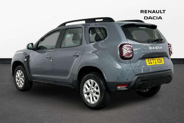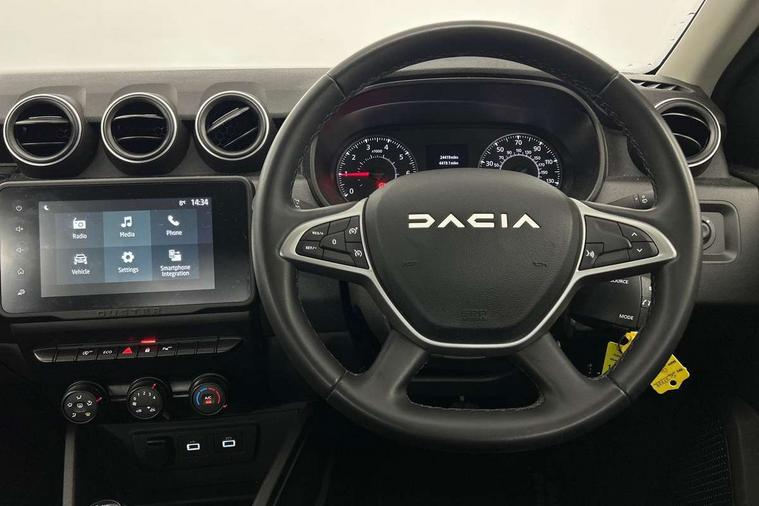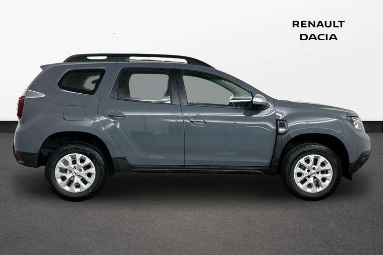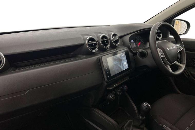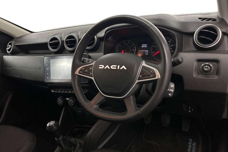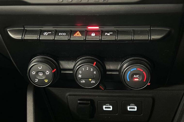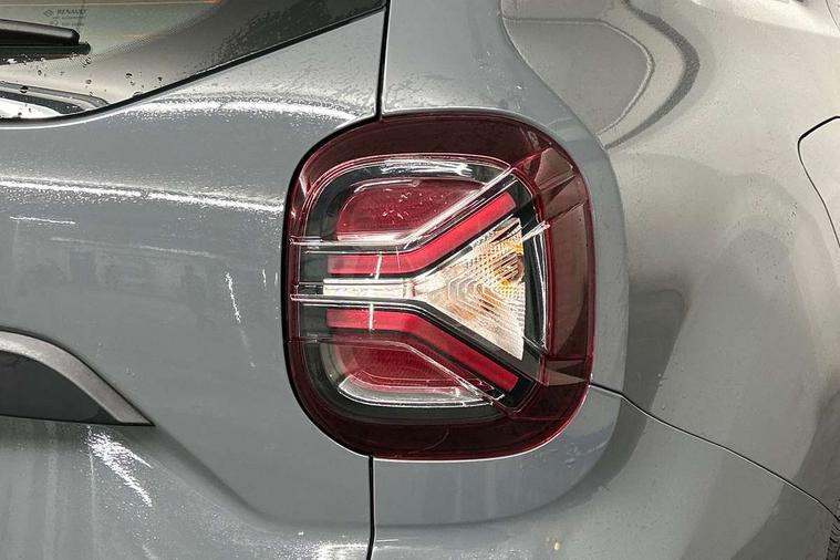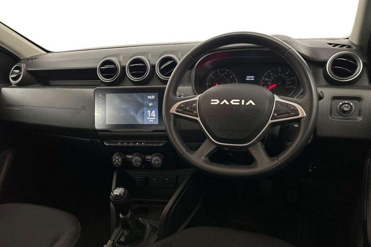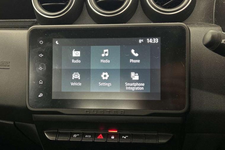 Cruise control and speed limiter, eCall emergency system, Eco mode, Electric power assisted steering, On board computer, odometer, trip computer, average fuel consumption, average speed, service indicator, outside temperature gauge, Rear parking sensors, Rev counter, Reversing camera, Stop/start system, 8" Media display with smartphone replication, 2 usb sockets and 6 speakers, Dacia plug and radio/MP3/USB/bluetooth/DAB/steering wheel control, 3 speed windscreen wipers, Black longitudinal roof bars with Duster inscription, Black side sills, Black/satin chrome tailgate trim with Duster inscription in black background and lettering, Body coloured door handles, Chrome front grille with hot stamping, Chrome logo surround on steering wheel, Daytime running lights, Drivers window one touch up/down, Dusk sensor, Electric adjustable/heated door mirrors, Electric front windows, Electric rear windows, Front and rear body coloured bumpers, Front door sill protection strip, Front fog lights, Heated rear window, High level third rear brake light, Rain sensor, Rear side wing doors, Rear spoiler, Rear wash/wipe, Satin chrome door mirrors, Tinted windows, Underbody protection skid plates, Y shaped LED headlights with rear LED lights, 3 rear height adjustable headrests, 3 seat bench in 2nd row, 60/40 split folding rear seat, Backlighted steering wheel buttons, Boot light, Driver seat lumbar adjustment, Fabric decorative insert on door panels, Fabric upholstery, Front head restraints, Front passenger reading light, Gear shift indicator, Height adjustable driver seat, Height adjustable front and rear headrests, Height and depth adjustable steering wheel, High centre console with driver armrest, Isofix points for child seats in both outer rear seats, Manual air conditioning, Map pocket on front seat backs, Passenger sunvisor with vanity mirror, Rear passenger reading light, Satin chrome interior door handles, Satin chrome lower steering wheel insert, Single front passenger seat, Soft feel leather steering wheel, 3x3 point rear seatbelts, ABS and Emergency brake assist, ASR traction control with Electronic stability control, Child locks on rear doors, Door open visual and audible warning, Driver airbag, Driver and passenger seatbelt not fastened - visual and audible warning, EBD - Electronic brakeforce distribution, Front passenger airbag, Front passenger airbag deactivation, Front seatbelt pretensioners, Front side airbags, Height adjustable front seatbelts, Hill start assist, Tyre pressure monitor, Remote central locking, Thatcham approved engine immobiliser, Charcoal grey central console surround, Matt black central console fascia, Piano black decorative insert on front door panels, Satin chrome air vent surround, Satin chrome instrument dial surrounds, 16" alloy wheels,