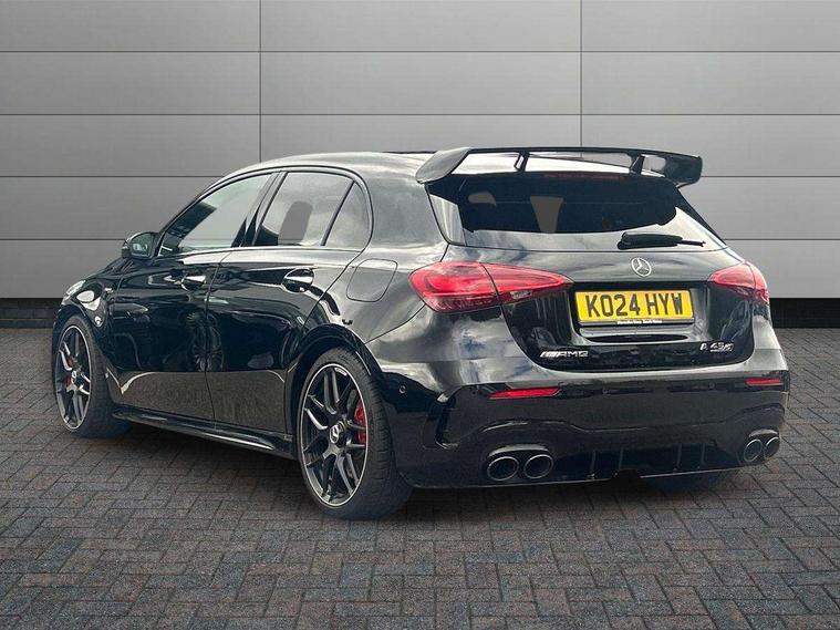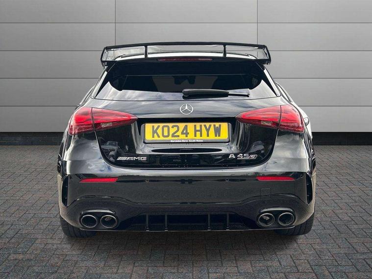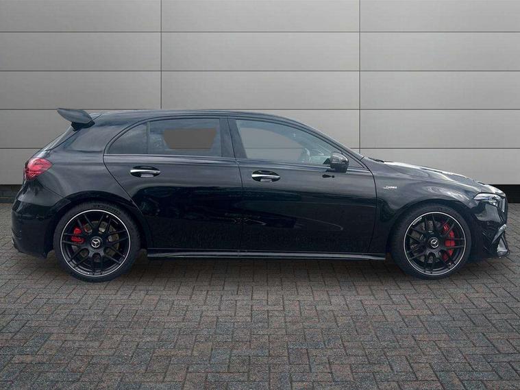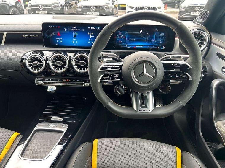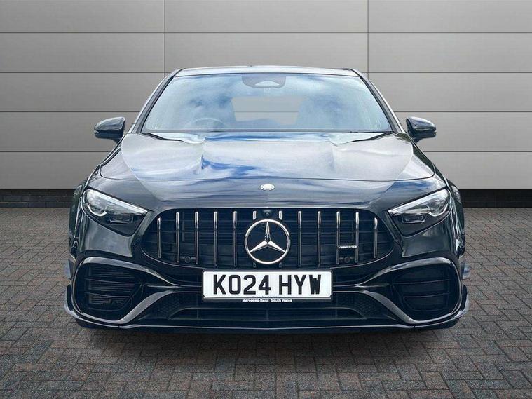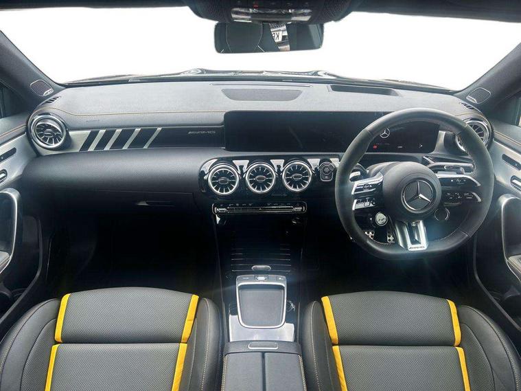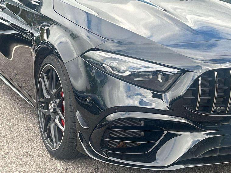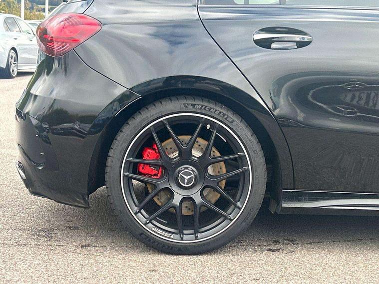 10.25 inch touchscreen central media display with AMG specific, AMG start up logo, visualisation of the AMG drive programs, vehicle and engine data, 10.25" Digital instrument cluster display screen, AMG DYNAMIC SELECT with drive modes(Slippery, Comfort, Sport, Sport+, Individual and Race) incl drift mode via steering wheel shift paddles+Race Start, AMG menu with sporty additional information - Gear indicator with yellow M symbol manual mode, Warm Up menu and Set Up menu, AMG speed sensitive steering with two sets of steering characteristics, Attention assist, Brake pad wear indicator warning light, Car wash mode, Direct steering, Dual bluetooth interfaces, ECO start/stop function, Engine start/stop button, Fluid level warning indicator for fuel, oil, coolant and washer fluid, Fluorescent jacket for driver, Hard-disk navigation, Head up Display, Hey Mercedes Voice activation, Lamp failure indicator, MBUX augmented reality for navigation, MBUX Interior assistant, Mercedes me connect including emergency call system, accident recovery, breakdown and maintenance management, Mercedes me remote services, Outside temperature gauge, Owners manual in English, Pre-installation of private car share, Preinstallation for Mercedes Benz link, Remote boot closing, Service indicator (ASSYST), Smartphone integration with Apple CarPlay and Android auto, Speed sensitive power steering, Tailgate, Traffic sign assist, Trip computer in multifunction display with current consumption indicator, Wireless charging, AMG performance 4MATIC+ with torque control, AMG suspension including AMG specific axles and sporty spring/damper setup, Suspension with adaptive damping system, Burmester surround sound system (590W) with Dolby atmos, speakers - 1 center+4 doors+2 in C pillars, tweeter, subwoofer, DSP amp, burmester lettering, DAB Digital radio, MBUX multimedia system, 4 Electric Front and Rear windows, Adaptive brake lights, AMG A45 S bodystyling -rear apron, four vertical fins, side sill panels, roof spoiler lip, specific front apron, diffuser look and S label on boot lid, AMG real performance exhaust sound system, AMG specific radiator grille in high gloss chrome with AMG lettering, Beltline strips in High gloss Black, Body colour bumpers, Body colour door handles with chrome inserts, Body colour side skirt, Electric adjustable and heated door mirrors with integrated LED side indicators, Headlamp assist automatic headlamp activation, Heat insulating dark tinted rear and rear side windows, Heated glass rear windscreen + timer control, LED daytime running lights, LED High level third brake light, LED tail lamp, Multibeam LED headlamps with adaptive highbeam assist and cornering function, Panoramic sliding sunroof, Privacy glass, Radio aerial, Rain sensing windscreen wipers with two sensitivity settings, Rear fog lights, Rear side wing doors, Rear windscreen wiper, Surround lighting with logo projection, Two round twin tailpipe trim elements each measuring 90 mm in diameter and AMG lettering plus ribbing on the inside of the pipe, Valve control dependent on drive program, Wider wheel arches for AMG wheels, Window line trim strip in black, 3 seat bench in 2nd row, 3 Spoke flattened lower section sporty design AMG Performance steering wheel in nappa leather/microcut microfibre, 40:20:40 split folding rear seats, Air conditioning - Two zone thermotronic luxury automatic climate control with display, AMG brushed stainless steel sports pedals with rubber studs, AMG centre console finished with trim in silver chrome, AMG floor mats, AMG performance seats, AMG sporty centre console with raised front section and integral control switched for manual transmission mode, AMG steering wheel buttons, Automatic child seat recognition sensor, Black air vents with surround in silver chrome, Black roof lining, Electrically adjustable front memory seats including lumbar support and backrest inclination, Front centre armrest with stowage, Front seat head restraints, Heated front seats, Height/reach adjustable steering column, Illuminated AMG front door sills with changeable cover, Interior lighting - 64 colour Ambient lighting, Interior mirror with reading lamps in black and frameless, Rear armrest with 2 cupholders, Rear head restraints, Seat occupancy sensor for front passenger seat, Silver coloured aluminium gear shift paddles on steering wheel, Single front passenger seat, Stowage compartment in centre console with retractable cover, Sunvisors with illuminated vanity mirrors, Twin front cupholders, Aerodynamic pack - A Class, AMG Driver's pack - A Class, AMG night pack - A Class, AMG performance high-end seat pack - A Class, Light and sight pack - A Class, Mirror package - A Class, Multi-contour seat pack - A Class, Parking pack with 360 degree camera - A Class, Seat comfort pack - A Class, USB pack plus - A Class, 3 rear 3 point seatbelts, 3 stage electronic stability programme, ABS with Brake Assist, Active bonnet, Adaptive brake assist with hold function and hill start assist, AMG high performance brake system with red painted brake callipers and black AMG lettering at the front, ventilated and perforated brake discs, Black seatbelts, Bonnet with power domes, Childproof locks manually operated for rear doors and electrically operated for rear power windows, Crash responsive emergency lighting, Driver and passenger head and side airbags, Drivers knee airbag, Dual stage driver/passenger airbags, Electronic parking brake, ESP curve dynamic assist, ESP with ASR, Exit warning, Front and rear seatbelt reminder, ISOFIX and top tether child seat fixing points in two outer rear seats, Tyre pressure monitoring system, Warning triangle and first aid kit, Window airbags, Alarm system/interior protection/immobiliser, Guard 360 degree vehicle protection, Keyless entry lock/unlock, Keyless Go, Remote central locking and crash sensor with emergency opening function, Aluminium AMG design black/silver interior trim, 19" AMG cross spoke forged wheels 