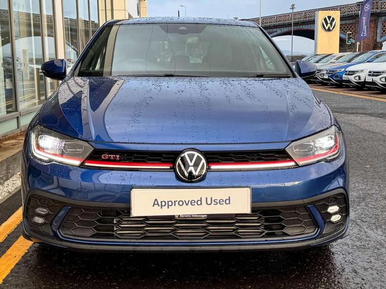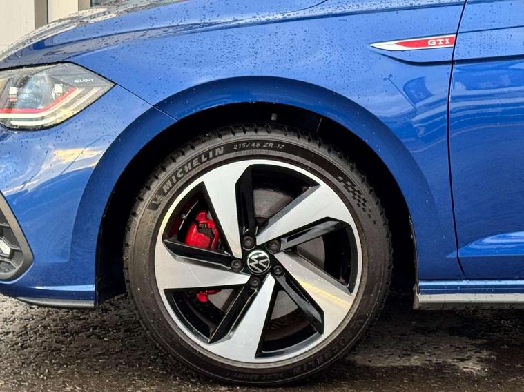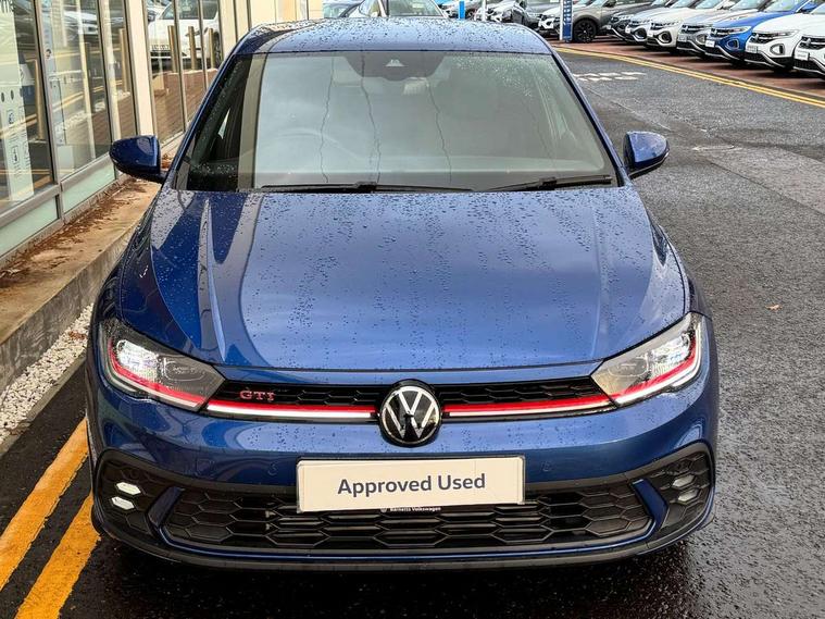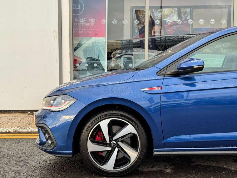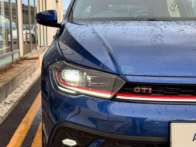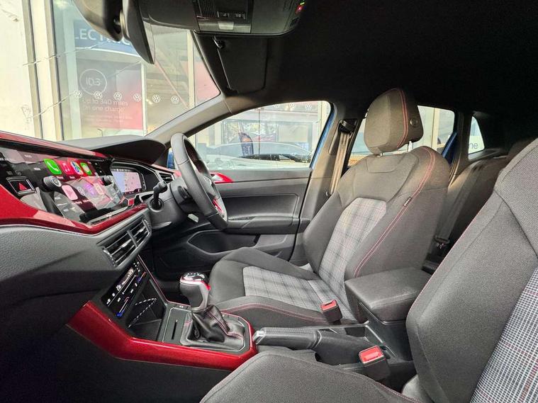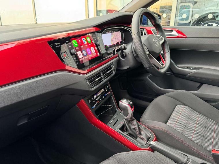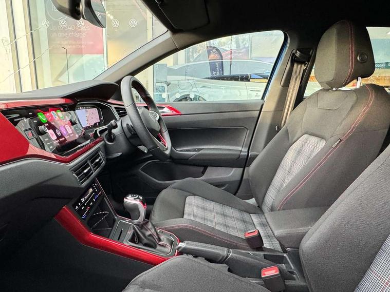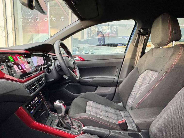 Adaptive cruise control with follow-to-stop and speed limiter, Advanced driver attention and drowsiness monitor, Bluetooth mobile phone interface, Digital Cockpit Pro with 10.25" Display, Dynamic road sign display, Eco mode, Emergency call service, Multifunction camera, Power assisted speed sensitive steering, Preparation for We connect and We connect plus, Speedo and rev counter, electronic odometer, trip, service interval display and fuel gauge, Travel Assist - Lane keeping system and traffic jam assist, Travel assist including emergency assist, Trip computer, Warning signal and warning light for front and rear seatbelts not fastened, Washer fluid level indicator, Wireless app connect, Adaptive chassis control, Front wheel drive, Heavy duty rear axle, Rear shock absorpion sports version, Sports select suspension lowered by 15mm, Start-stop system with battery regeneration (recuperation - energy recovery during braking), DAB Digital radio, Diversity antenna for FM reception, Front and rear 6 speakers, Body colour bumpers, Body colour door handles, Electric front windows, Front scuff plates in aluminium with GTI logo, Heat insulating glass windscreen, Power folding adjustable/heated exterior mirrors and front passenger exterior mirror lowering function, Rain sensor, Rear electric windows, Rear fog light, Rear side wing doors, Rear windscreen washer and wiper with interval delay, Sport bumpers with air intakes with honeycomb structure, Third brake light, Twin chrome exhaust tailpipes, 12V power socket in centre console, 2 USB-C ports in the front, 2 USB-C charging sockets on the center console in the rear, 3 rear head restraints, 60/40 split folding rear seat and rear seat bench not split, Air care climatronic air conditoning system with active combination filter and 2-zone temperature control, Black roof lining, Carpet mats, front and rear, Chrome plated radiator grille inserts, air vent surrounds and light switch surrounds, Door and side trim panel, Driver and front passenger seat height adjustment, Driver/passenger sunvisors with illuminated vanity mirrors, Front centre armrest, Front footwell illumination, Front seat backrest storage pockets, GTI sports gearshift knob in aluminium leather, Handbrake lever handle in leather, Headliner in recycled material, Isofix child seat preparation easy-fit (for two outer rear seats, and front passenger seat) compatible with I-size, LED interior light with switch off delay and dimmer, 2 reading lights front and rear, Luggage compartment cover, Luggage compartment floor, Luggage compartment lighting, Lumbar adjustment for front seats, Single front passenger seat, Stainless steel pedals, Standard pedal cluster, Three spoke leather wrapped multifunction sports steering wheel with shifting paddles, IQ LED matrix headlights pack - Polo, Light and sight pack - Polo GTI, 3 point height adj front seatbelts + pretensioners, 3x3 point rear seatbelts, ABS, Driver and front passenger airbag with front passenger airbag deactivation, Drivers and front passengers safety optimised head restraints, ESC (Electronic stability control) + EDL (Electronic Differntial lock) and ASR (Traction control), Extended and predictive pedestrian/ cyclist protection, Front and rear disc brakes with red brake calipers, Front curtain and side airbags with center airbag, Hill hold control, Manual child lock in rear doors, Two tone horn, Tyre pressure loss indicator, Alarm with interior protection, Anti-theft alarm system with interior monitoring, backup horn, and towing protection, Anti-theft wheel bolts, Electronic engine immobiliser, Chrome applications on rotary light, mirror adjustment, window regulator switches, outlet with frame in black, Low rolling resistance tyres,