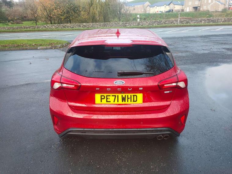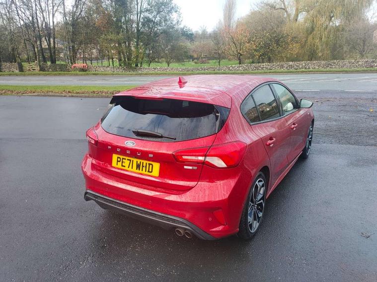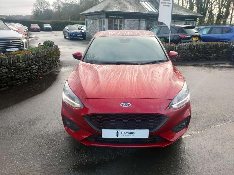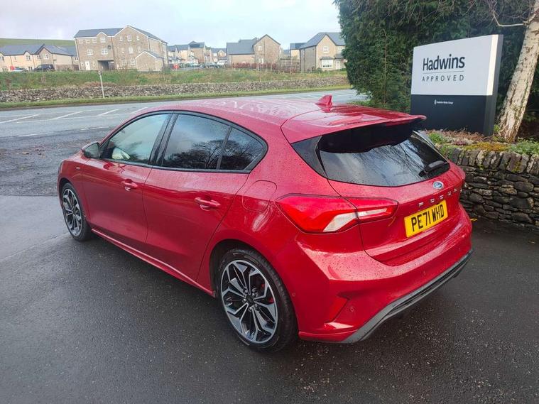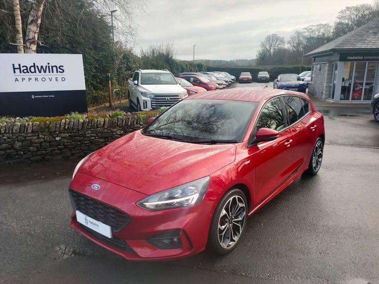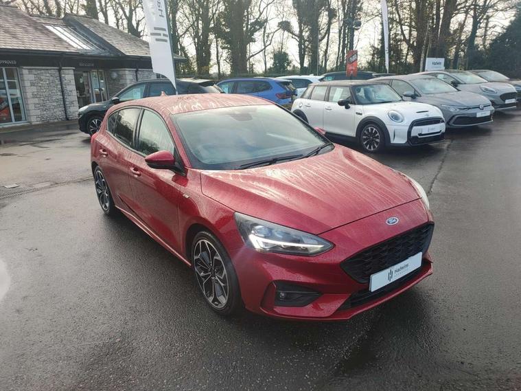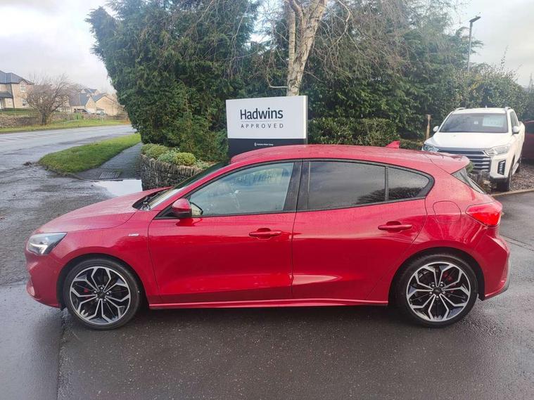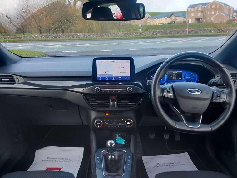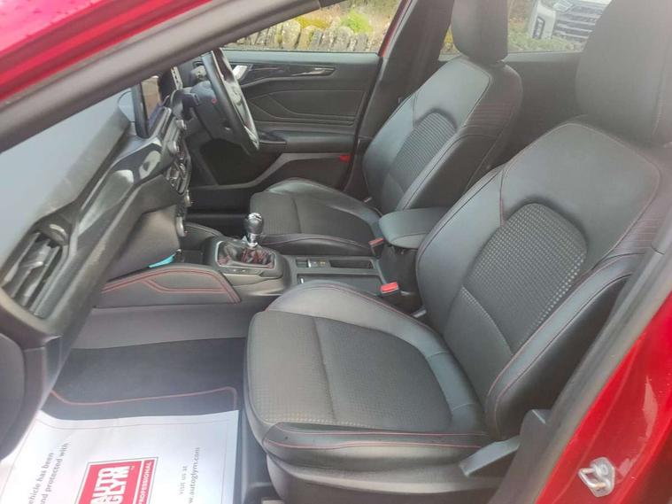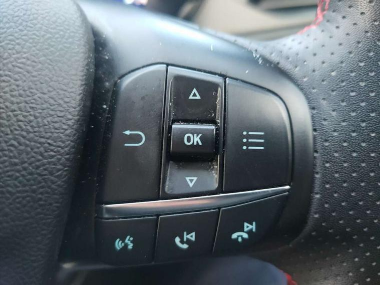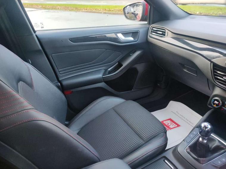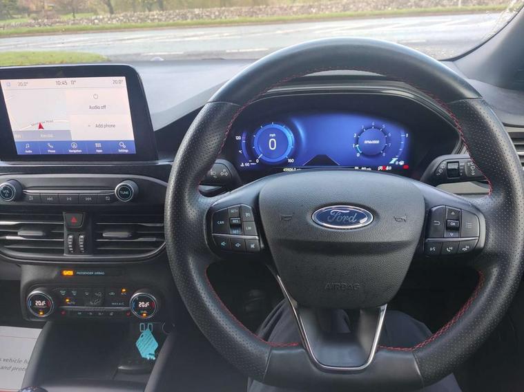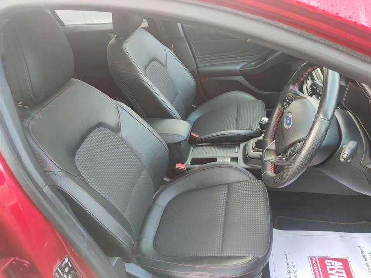 12.3" Digital instrument cluster, Bluetooth system, Digital clock, E-call, Easy fuel capless refuelling system, Eco mode, Ford SYNC 3 navigation with 8" TFT touchscreen, DAB radio and app link Android auto/Apple carplay, Intelligent speed assist, Lane keeping system - lane keeping alert and lane keeping aid, PAS, Selectable drive mode, Trip computer, Sports tuned suspension, 2 USB ports, Aux input, Auto dimming rear view mirror, Auto headlamps (on/off), Automatic rain sensing wipers, Body colour large rear spoiler, Body coloured bumpers, Body coloured door handles, Body coloured electrically operated and heated door mirrors with side indicators, Electrically operated front and rear windows with one touch opening and closing, Front variable intermittent wipers with electric wash, Heated rear window, LED daytime running lamp, Polished twin tailpipe, Power folding door mirrors with puddle lights, Quickclear heated windscreen, Rear privacy glass, Rear side wing doors, ST-Line upper and lower grille with full body styling kit and wing badges, Tailgate wash/wipe, Third brake light, Unique door and instrument panel inserts, 3 seat bench in 2nd row, 3 spoke flat bottomed Sensico steering wheel with red stitching, 6 way power adjustable driver seat, Aluminium gear knob, Dark headliner, Driver's lumbar support, Dual zone electronic air temperature control, Front and rear floor mats with red stitching, Heated driver and front passenger seats, Heating for Sensico steering wheel, Height adjustable front headrests, Isofix child seat preparation, Reach + rake adjustable steering column, Rear centre headrest, Sensico premium upholstery, Single front passenger seat, Soft console knee pads with red stitching, 3x3 point rear seatbelts, ABS+Electronic Brake force Distribution, Auto hold function, Driver airbag, Electronic parking brake, Electronic stability control, Front and rear seatbelt reminder, Front inertia reel height adjustable seatbelts with pre-tensioners, Front passenger airbag, Front side airbags, Hill start assist, Passenger airbag deactivate switch, Post collision braking, Pre collision assist with autonomous emergency braking and pedestrian/cyclist detection, Remote/power child rear door locks, Side curtain airbags, Three rear inertia reel lap/diagonal seatbelts, Tyre pressure monitoring system, Ford keyfree system with Keyless entry and keyless start/sleep mode key fob, MyKey system, Remote central locking & engine immobiliser, Thatcham category 1 alarm, 18" 5x2 spoke gloss black machined finish alloy wheels, Mini steel spare wheel,
