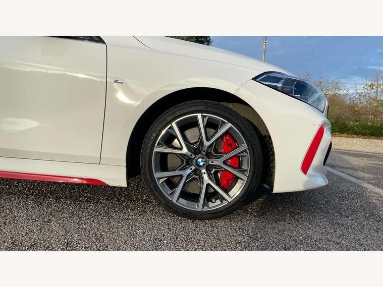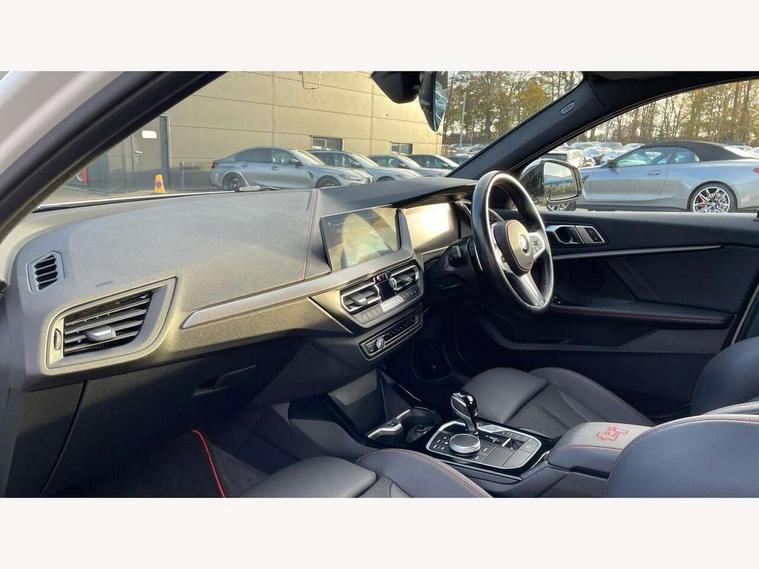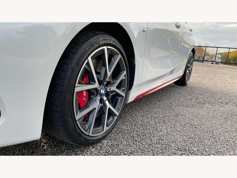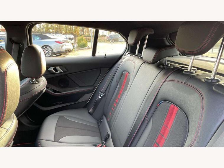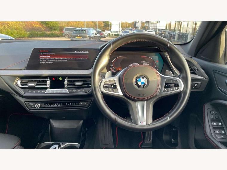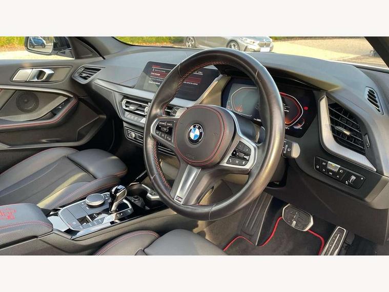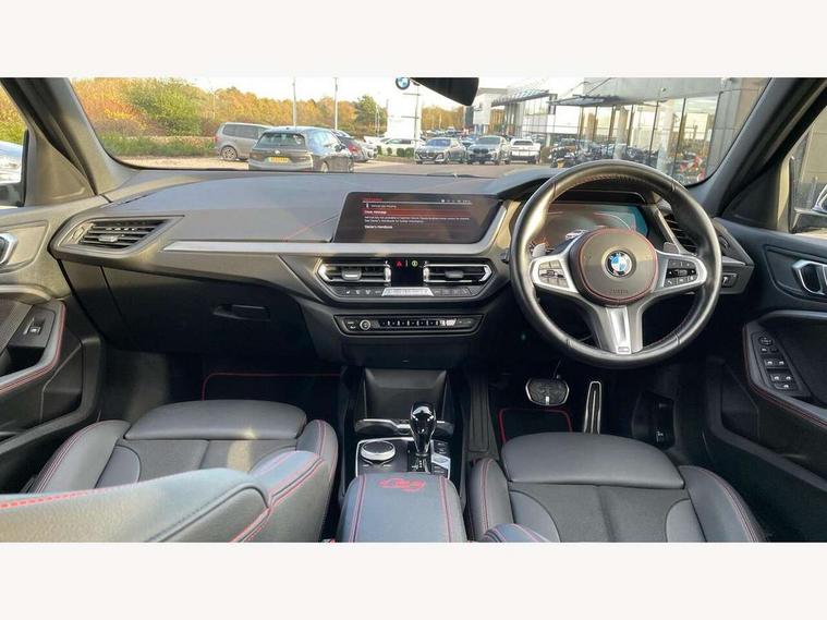 Active guard plus, Attentiveness assist, BMW ConnectedDrive online services, BMW Teleservices, Check Control warning system for monitoring of lights and door/luggage compartment open warning, Cruise control with speed limiter, Eco pro mode, Electric power steering with Servotronic steering optimised at all speed ranges, Front axle single joint with specific axle kinematics to minimise drive influences on steering + provide increased rigidity agile driving behaviour, Integrated owners handbook, Lane departure warning system, Oil sensor for level and grade, On board computer, Optimum shift indicator, Personal Profile, Pull away assistant, Rigidly mounted rear subframe - Multi link construction with separate spring / damper configuration and excellent driving characteristics, Speed limit Info including no-overtaking indicator, Aluminium lightweight construction, Anti roll bar front and rear, Balancer shaft, Double VANOS twin scroll turbocharging system, Drive Performance Control, Eight speed sport automatic transmission with gearshift paddle switches, Electronic differential lock, High precision injection, Larger fuel tank capacity (50 litres), M sport suspension with M128i xDrive specific settings, Petrol Particulate Filter, Twin tube gas filled shock absorbers with degressive characteristic curve, VALVETRONIC engine management, DAB Digital radio, Auto dimming rear view mirror, Automatic headlight beam throw control, Automatic windscreen wipers and automatic headlight, Black chrome tailpipe finishers, BMW individual high gloss shadow line with extended content, Body colour door handles, Body colour mirror caps, Body colour roof trims, Chrome 'M' logo side designation, Chrome kidney grille frame with Satin Aluminium struts, Direction indicator side lights in exterior mirrors, Electrically adjustable exterior mirror with mirror adjustment switch on drivers armrest and aspheric on driver side, convex on passenger side, Fading support, Folding side mirrors with auto dimming/folding wing mirrors with auto dimming, Follow me home headlights, Front and rear bumper system with replaceable deformation elements, Front and rear electric windows with open and close fingertip control, anti trap facility and comfort closing, Front door sill finishers in black plastic with M designation in metallic look, Green tinted heat protection glazing, High gloss shadowline window frame, Recess cover mirror frames and B/C pillar embelisher trim, High level third brake light, Integrated front windscreen with washer jets, Kidney frame and struts in high gloss black extended, LED daytime running lights, LED eyebrow turn indicators, LED front fog lights, Lightweight engineering, Matt black air guide grilles, Matt black wheel arch trim, Model designation on electric bootlid, Nearside reverse light in rear light cluster, Preparation for high beam assistant, Rear fog lights, Rear side wing doors, Rear window wiper, Shark fin antenna, Trailer stabilisation logic, Visible VIN plate, Welcome lighting, 12V power socket in front centre console with blanking plug, 3 rear seat head restraints, 3 seat bench in 2nd row, Anthracite headlining, Black boot net with lashing eyes, Cargo function on 2nd seat row, Child seat ISOFIX attachment for two outer rear seats and front passenger seat with anchorage points, Conditioned based service, Driver and front passenger backrest net on rear, Driver and front passenger seat heating, Driver side folding compartment in instrument panel, Folding rear clothes hook, Four grab handles integrated in roof lining, Front and rear door pockets with bottle holders, Front and rear side armrest integrated into door trim, Front armrest, Front sports seats, Glove compartment, Height adjustable front head restraints, Luggage compartment for bag hooks on left and right, foldable luggage compartment liner and four lashing eyelets, Manual adjust steering wheel, Multi-function controls for steering wheel, Single front passenger seat, Storage compartment in centre console, Storage compartment in luggage compartment, Stowage of the parcel shelf in luggage compartment trim, Sun visors with vanity mirrors and insert tab, Three spoke M sport design multi function leather steering wheel in unique red stitching, Two front centre console cupholders, Two zone automatic air conditioning, Type C two USB ports in rear centre console, Additional interior lighting pack - 1 Series, BMW live cockpit professional pack- 1 Series, Connected pack professional - 1 Series, Interior lights pack - 1 Series, M Sport exterior styling aerodynamics pack - 1 Series, 2 tone horn, 3 point seatbelts on all seats, front pyrotechnic belt tensioners, stopper and belt force limiters, rear coded belt buckles, Airbags - Front driver/passenger, front and rear curtain head protection, front side, manual deactivation of front passenger airbag, Anti lock braking system (ABS) with brake assist, BMW emergency call, Brake drying, Braking readiness, Child proof locking system in rear door, City braking function, Comfort modes, Cornering brake control, Crash sensor activating of airbags, Unlocking doors, hazard warning lights, fuel cut off, interior lighting+activation of safety battery terminal clamp, Driver and front passenger seat belt security check, Dynamic stability control + (DSC+), Dynamic Traction Control - DTC, Electrically operated hand brake including automatic hold function, Front and rear disc brakes, M Sport brakes with red calipers, M Sport seatbelts, Seatbelt warning, Side impact protection, Tyre pressure monitoring system, Warning triangle and first aid kit, Central locking switch for all doors, fuel filler cap and luggage compartment, Deadlocking function system to all doors, Drive away locking system on all doors and luggage compartment with de-activated in iDrive settings, Locking wheel bolts, Remote control with integrated key with High-gloss Black inlay and M designation and 1 button for open/ close lock, window, open luggage compartme