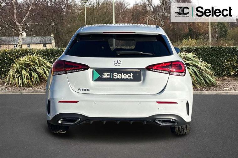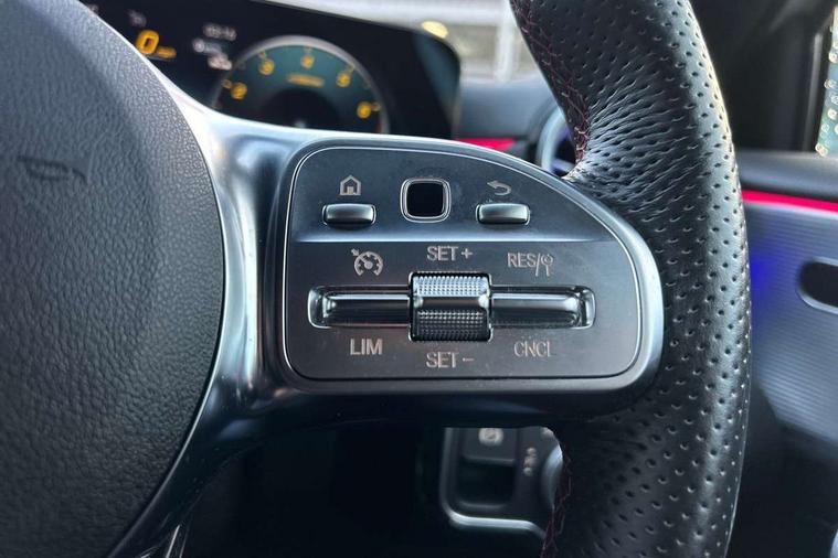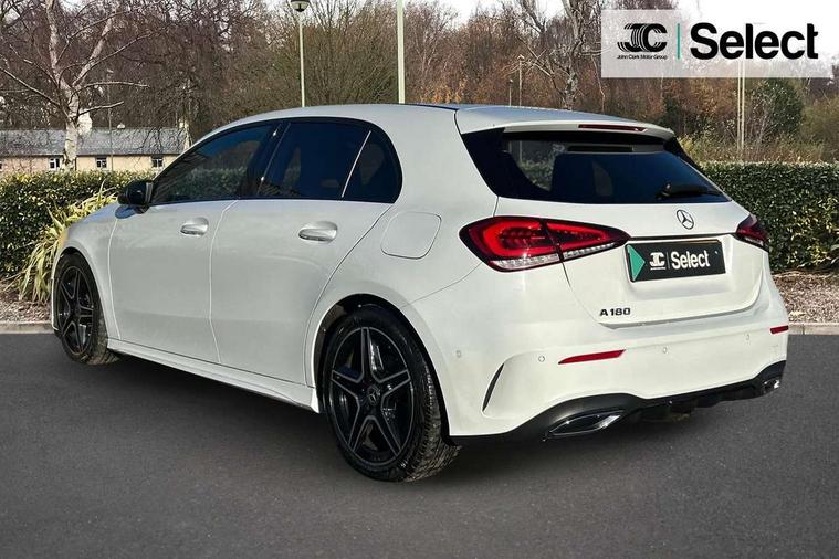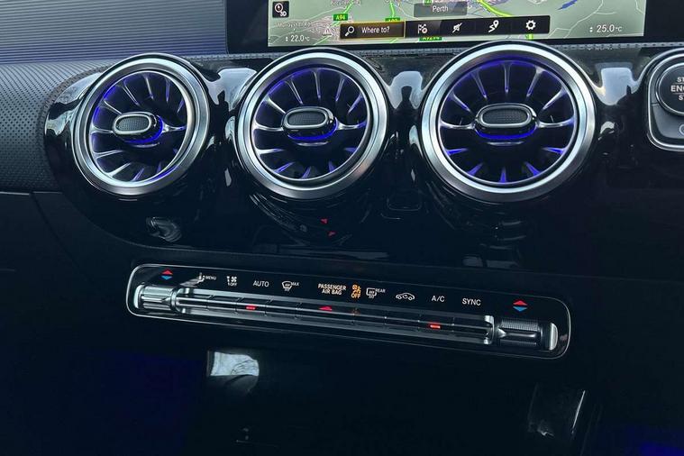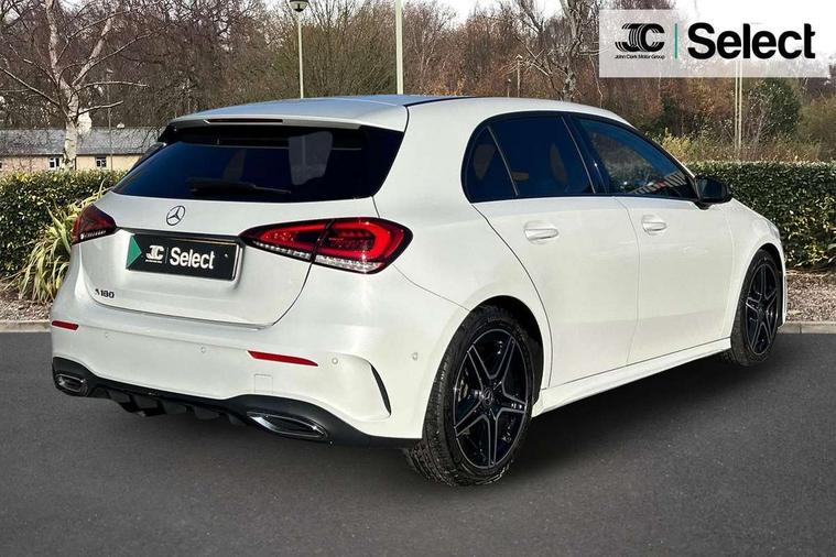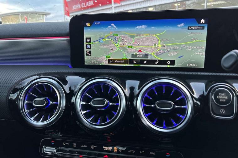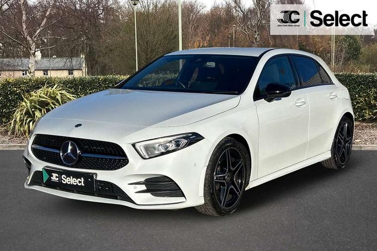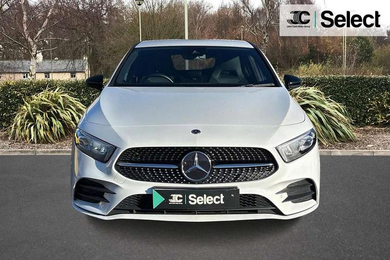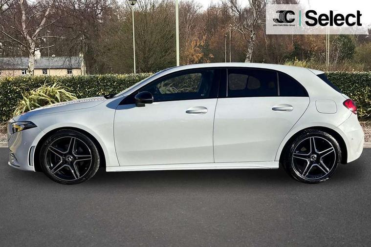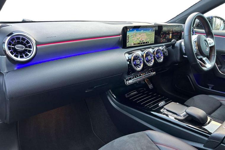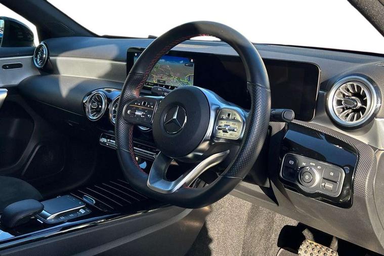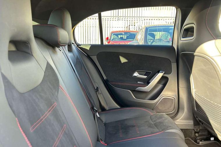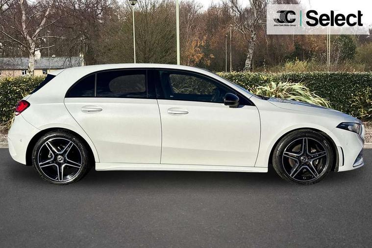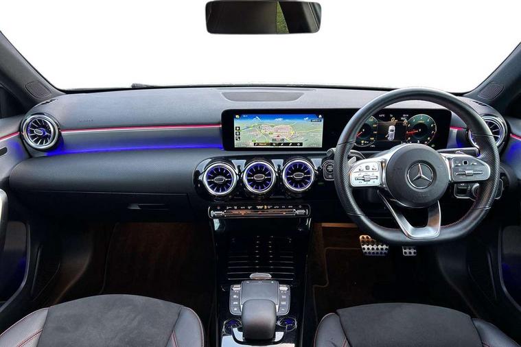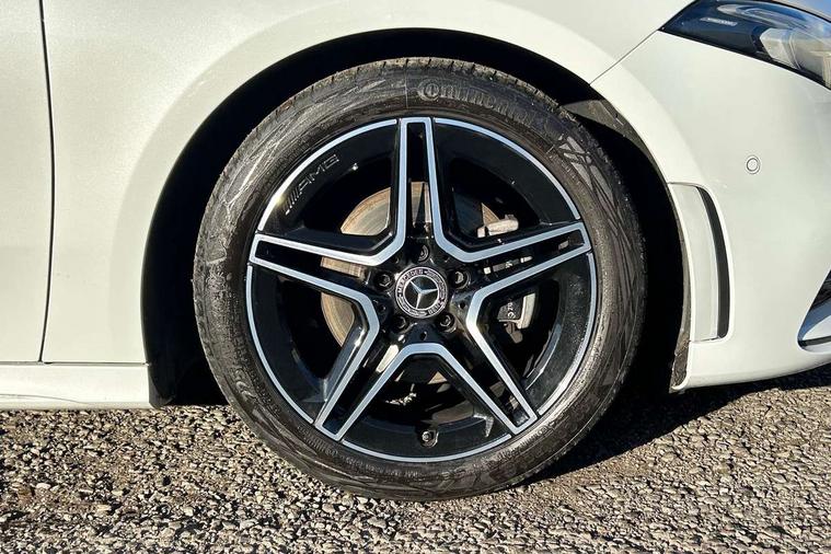10.25" Digital instrument cluster display screen, 10.25" media display, 180 degree rear view camera with parking guidelines, Active parking assist with visual and audible warning of detected obstacles, Attention assist, Brake pad wear indicator warning light, Car wash mode, Cruise control + speed limiter, Direct steering, Dual bluetooth interfaces, DYNAMIC SELECT with a choice of driving modes (ECO, Comfort, Sport and Individual), ECO start/stop function, Fluid level warning indicator for fuel, oil, coolant and washer fluid, Hard-disk navigation, Hey Mercedes Voice activation, Lamp failure indicator, Lane keeping system, Mercedes me connect including emergency call system, accident recovery, breakdown and maintenance management, Mercedes me remote services, Outside temperature gauge, Owners manual in English, Pre-installation for private car sharing, Preinstallation for Mercedes Benz link, Service indicator (ASSYST), Smartphone integration with Apple CarPlay and Android auto, Speed limit assist, Speed sensitive power steering, Trip computer, Ultrasonic sensors positioned in the front and rear bumpers, Lowered comfort suspension, Rear axle torsion beam, 2 USB ports (type C) in rear stowage compartment and one in front of center console, 6 speakers, DAB Digital radio, MBUX multimedia system with DAB digital radio and touchpad including satellite navigation, Mercedes-Benz sound system - 100W, 4 Electric Front and Rear windows, Adaptive brake lights, AMG bodystyling - Front apron with splitter in chrome, rear apron with chrome trim and chrome visible trim elements in tailpipe, Automatic headlights, Black weather strip, Body colour bumpers, Body colour door handles with chrome inserts, Body colour side skirt, Electric adjustable and heated door mirrors with integrated LED side indicators, Exclusive diamond radiator grille, Exhaust system - Twin visible tailpipes in polished stainless steel, Headlamp assist automatic headlamp activation, Heated glass rear windscreen + timer control, LED High level third brake light, LED high performance headlamps with integrated LED daytime running lights, LED tail lamp, Privacy glass, Radio aerial, Rain sensing windscreen wipers with two sensitivity settings, Rear fog lights, Rear side wing doors, Rear wiper, 3 seat bench in 2nd row, 3 Spoke flat bottom leather multi function steering wheel with perforated leather in grip area, 40:20:40 split folding rear seats, Artico man-made leather/Microfibre Dinamica upholstery with red contrast stitching, Auto Mercedes-Benz child seat recognition sensor, Black air vents with surround in silver chrome, Black roof lining, Brushed stainless steel sports pedals with rubber studs, Controller on centre console with chrome surround, Floor mats with AMG lettering, Front centre armrest with storage compartment, Front seat backs luggage nets, Galvanished gear shift paddles on steering wheel, Heated front seats, Height/reach adjustable steering column, Illuminated Mercedes Benz lettering front door sills with changeable cover, Interior lighting - 64 colour Ambient lighting, Interior mirror with reading lamps in black and frameless, Manual height adjustable front seats, Rear head restraints, Seat occupancy sensor for front passenger seat, Single front passenger seat, Sports seats with integrated headrests, Stowage compartment in centre console with retractable cover, Sunvisors with illuminated vanity mirrors, Touchpad on center console, Twin front cupholders, Two zone thermotronic luxury automatic climate control, Light and sight pack - A Class, Mirror package - A Class, Night pack - A Class Saloon/Hatchback, Seat comfort pack - A Class, 3 rear 3 point seatbelts, ABS with Brake Assist, Active bonnet, Active brake assist includes forward collision warning system with autonomous braking, Adaptive brake assist with hold function and hill start assist, Black seatbelts, Childproof locks manually operated for rear doors and electrically operated for rear power windows, Crash responsive emergency lighting, Driver and passenger head and side airbags, Drivers knee airbag, Dual stage driver/passenger airbags, Electronic parking brake, ESP curve dynamic assist, ESP with ASR, Front and rear seatbelt reminder, Front brake callipers with Mercedes Benz lettering, ISOFIX and top tether child seat fixing points in two outer rear seats, Tyre pressure monitoring system, Warning triangle and first aid kit, Window airbags, Alarm system/interior protection/immobiliser, Keyless Go, Remote central locking and crash sensor with emergency opening function, Urban guard vehicle protection system with immobiliser and interior protection, Matrix look light longitudinal grain aluminium trim element, 18" AMG 5 twin spoke light alloy wheels aerodynamically optimised painted in black with highsheen finish, Summer tyres, Tirefit sealant kit,