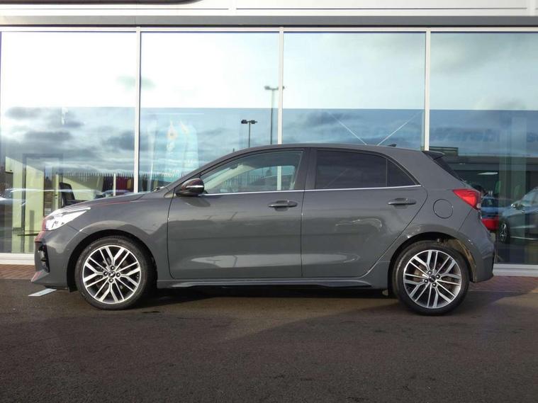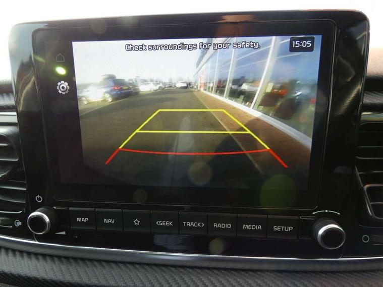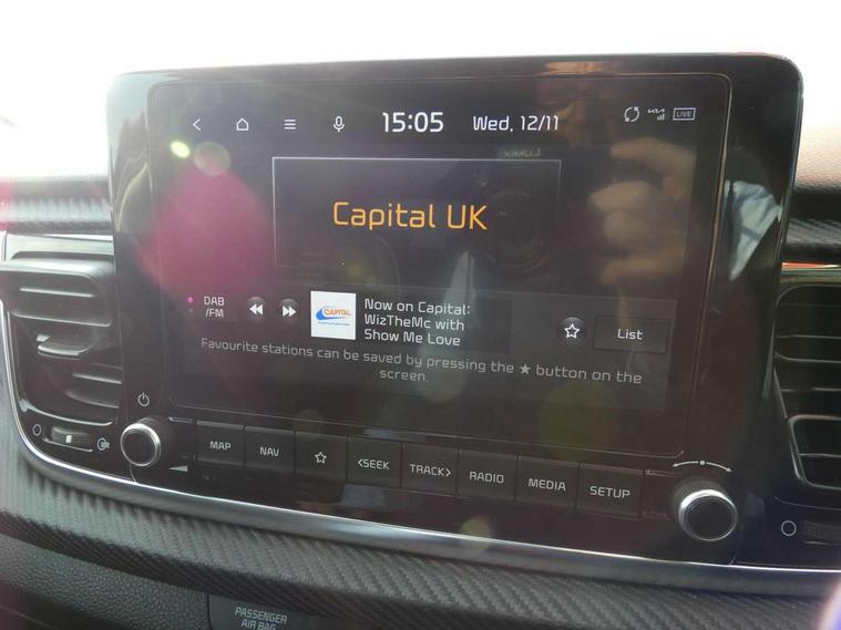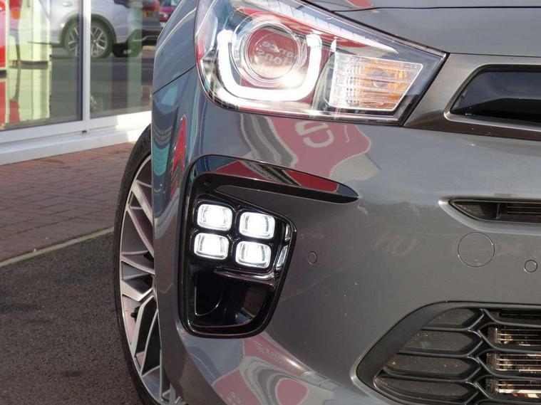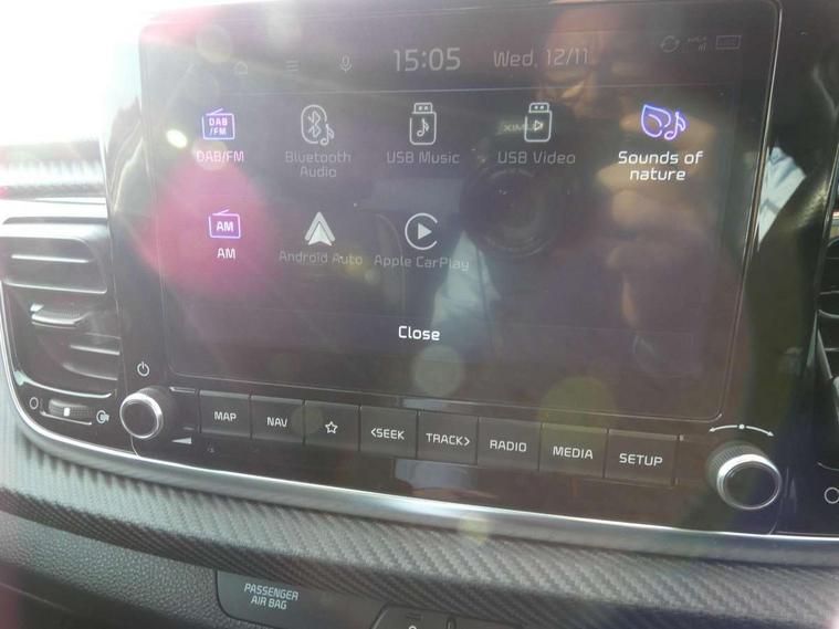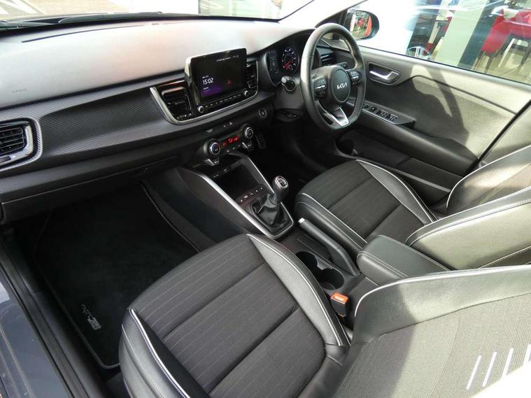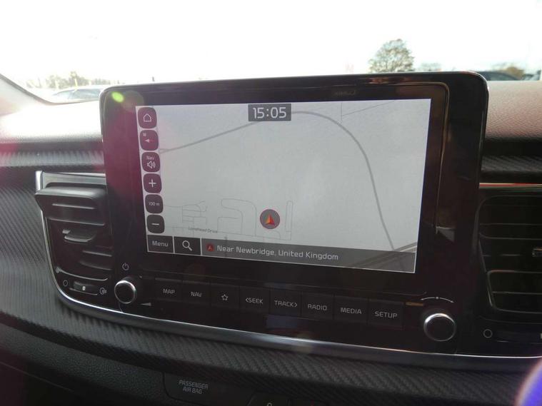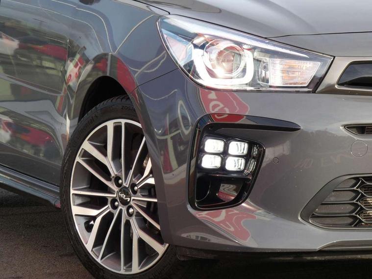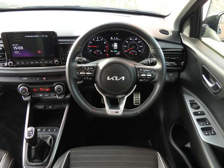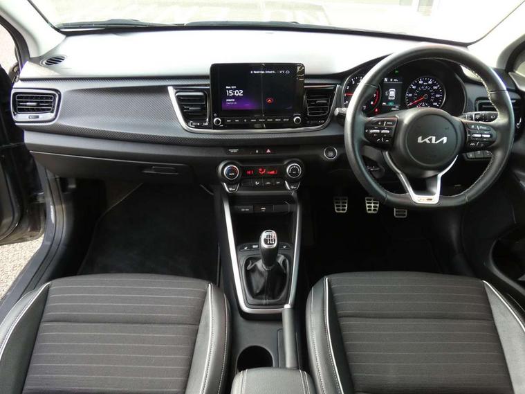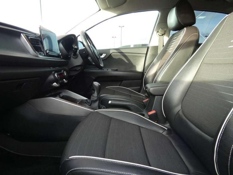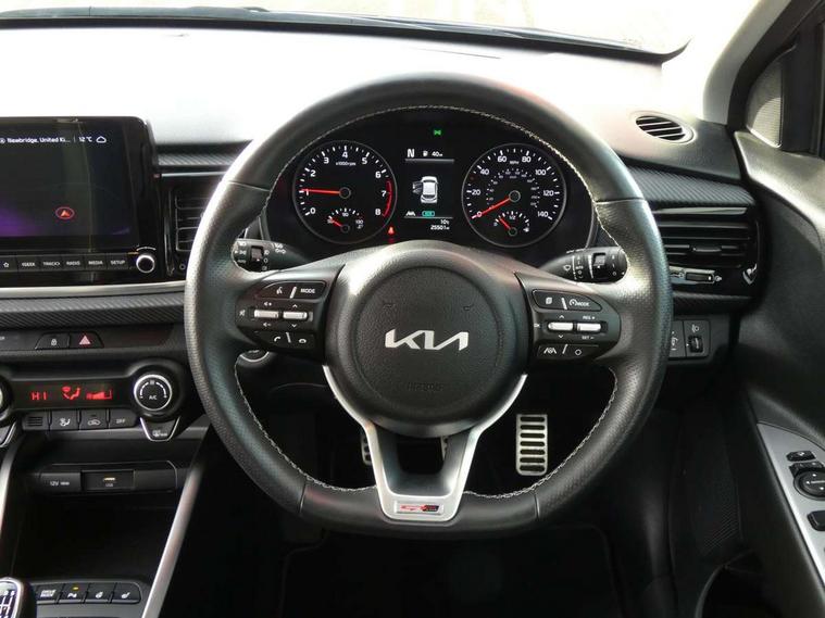 8" touchscreen navigation, Apple car play/Android Auto, Blind spot collision warning, Cruise control + speed limiter, Digital clock, Drive mode selector, Electric power steering, Emergency call service, Emergency stop signalling system, Front parking sensor, Gear selection indicator, Kia Connect (UVO), Manual speed limit assist (MLSA), Outside temperature display, Rear parking sensor, Reversing camera system with dynamic guidelines (Integrated into centre fascia screen), Tachometer, Tailgate, Trip computer, Voice control system, Windscreen washer level indicator, Intelligent Stop and Go, 6 speakers, Bluetooth connectivity including audio streaming, DAB Digital radio, Front USB port for media connection, Rear USB port, Steering wheel mounted audio controls, Aeroblade-type front wipers, Auto dimming rear view mirror, Automatic defog system, Automatic lighting control, Bi-function projection headlights, Body colour door handles, Chrome side window trim, Cornering light, Electric adjustable/heated/folding door mirrors, Front electric windows with driver's auto up/down function, Gloss black and dark chrome surround radiator grille, Headlamp levelling, Heated rear window, High gloss black door mirrors, High Gloss Black rear spoiler, LED "Ice-Cube" Front Fog Lights, LED daytime running lights, LED indicators in door mirrors, LED rear fog light, LED third brake light, Privacy glass (Rear Windows and Tailgate), Rain sensing front wipers, Rear electric windows, Rear side wing doors, Rear wash/wipe, Speed variable front wipers, Sports front bumper, Sports rear bumper, Tinted glass, Twin exhaust pipes, Welcome home function, 3 passenger assist grips, 3 seat bench in 2nd row, 60/40 split/folding 2nd row of seats, All round height adjustable headrests, Automatic air conditioning, Centre Console with Storage Box and Sliding Armrest, Cloth/faux leather upholstery with grey stitching, Dash illumination dimmer switch, Driver's seat height adjuster, Driver/passenger sunvisors and illuminated vanity mirrors, Front and rear door map pockets with bottle holder, Front passenger seatback pockets, Front USB charger port and 12V socket, Heated front seats, Heated steering wheel, ISOFIX top tethers and lower anchor points, Leather D cut steering wheel, Leather trimmed gearshift, Load area light, Luggage area parcel shelf, Luggage hooks, Metal pedals, Overhead console with sunglasses holder, Satin chrome interior door handles, Single front passenger seat, Tilt/telescopic adjustable steering wheel, Advanced driving assistance pack - Rio, 3-point front seatbelts, 3x3 point rear seatbelts, ABS with Electronic Brakeforce Distribution (EBD) and Brake Assist System (BAS), Automatic unlocking of doors in case of impact, Cornering brake control (CBC) and Straight line stability (SLS), Electronic stability control (ESC) and vehicle stability management (VSM), Front seatbelt pretensioners + load limiters, Height adjustable front seatbelt anchors, Hill start assist control (HAC), Passenger airbag deactivate switch, Rear child proof door locks, Seatbelt warning, Traction control, Twin curtain airbags, Twin front airbags, Twin front side airbags, Tyre pressure monitoring system, Anti theft alarm, Deadlocking system, Engine immobiliser, Locking wheel nuts, Smart key with engine start/stop button, Speed sensitive auto door locking, Visible vehicle identification number, Carbon Fascia Trim, 17" Alloy wheels, Tyre mobility system,