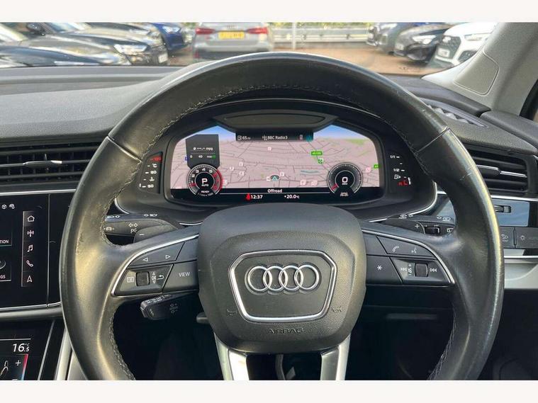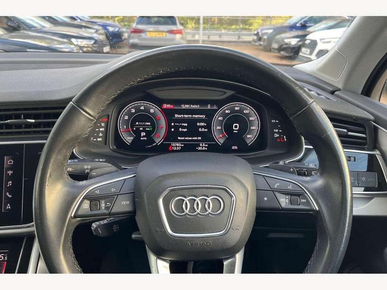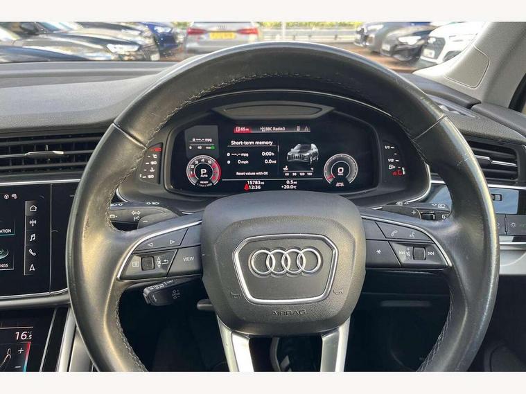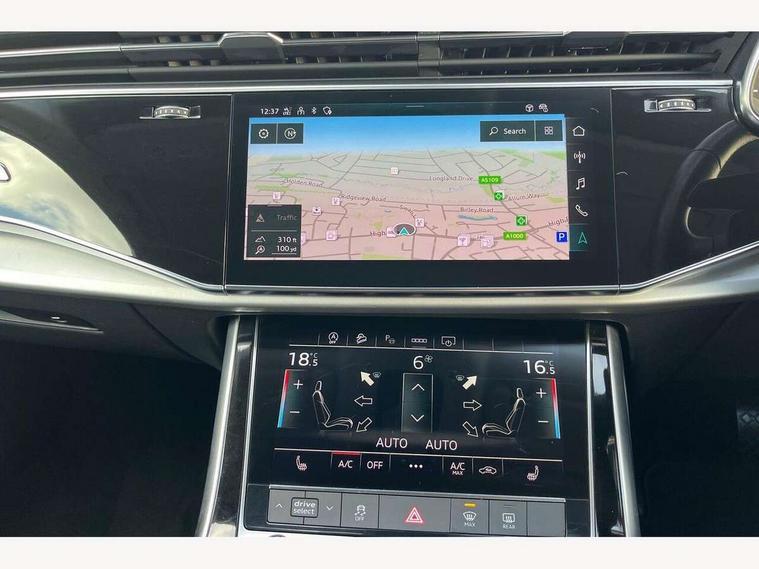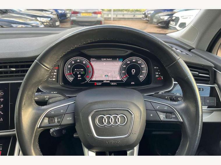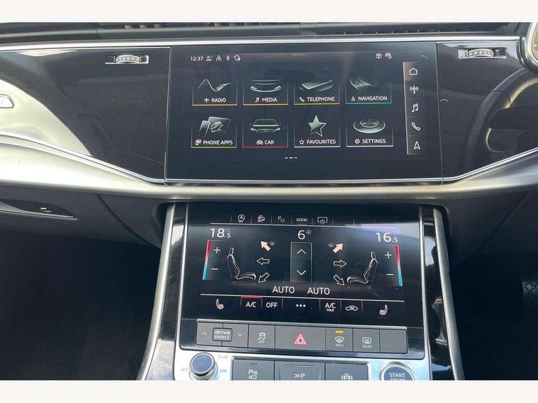 Audi connect safety and service (e-call), Audi drive select (Auto, Comfort, Dynamic, Efficiency, Individual, Off-road and All road), Audi phone box with wireless charging, Audi virtual cockpit - 12.3" high-resolution LCD display with fully customisable instrument cluster, Camera based traffic sign recognition, Electromechanical steering, MMI navigation plus with MMI touch screens includes 10.1" and 8.6" screens with haptic feedback, Natural voice recognition, Parking system plus - front + rear sensors, Power operated tailgate, Rear view camera, Smartphone interface includes wireless Apple carplay/Android Auto, Start/stop system, 48V Mild hybrid technology, 85 litre fuel tank, Adaptive air suspension, Quattro all wheel drive with self locking centre differential, Audi music interface - front 2 USB-C ports with charger and data functions, Audi sound system with 6 channel amplifier, 180 watt amplifying capacity and 10 loudspeakers including subwoofer, DAB digital radio module, Aluminium roof rails, Aluminium window trim, Audi matrix LED headlights with dynamic front and rear indicators, Auto dimming frameless rear view mirror, Body coloured door mirrors, Bumpers in contrast paint scandium grey finish includes door trim and wheel arch trim strips, inlays in door strip contain quattro embossing, Electrically adj heated/folding + automatically dimming exterior mirrors with memory + automatic kerb side function for passenger side exterior mirror, Heat insulating glass in windshield, Integrated LED indications in door mirrors, LED daytime running lights, LED rear tail lights, 2 zone automatic climate control, 4 way adjustable front seat lumbar support, 7 seat layout with ISOFIX points for the front passenger seat and rear passenger seat, Comfort front centre armrest, Electrically adjustable front seats with memory function for driver's side, Fabric headlining trim, Folding rear seats, Front head restraints, Front/rear floor mats, Heated front seats, LED interior ambient lighting, Luggage compartment cover, Rear head restraints, Sunvisors with illuminated vanity mirrors, Twin leather upholstery, 3 point seatbelts on all rear seats, Audi pre sense front, Driver and front passenger, front side and curtain airbags, Electromechanical parking brake, Electronic Stabilisation Control (ESC) including ABS, ASR and EDL, Extended pedestrian protection measures, Hill hold assist, Seatbelt monitoring, Tyre pressure loss indicator, Warning triangle and first aid kit, Anti theft alarm, Anti-theft wheel bolts and wheel loosening detection, Keyless go with remote central locking, Silver grey interior inlays, Tool kit, Tyre repair kit,
