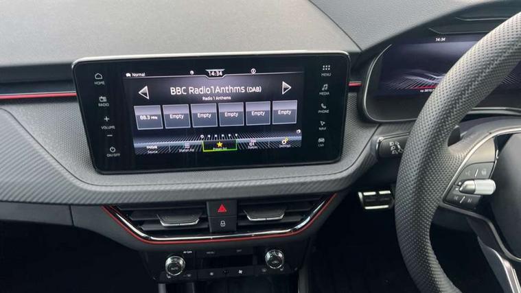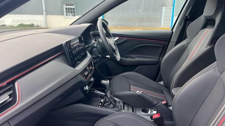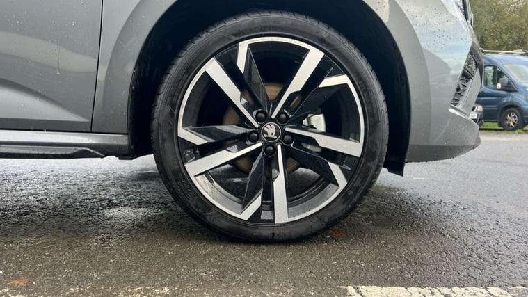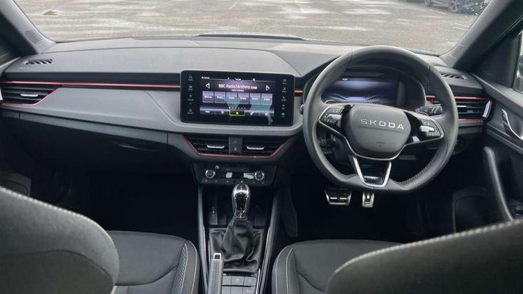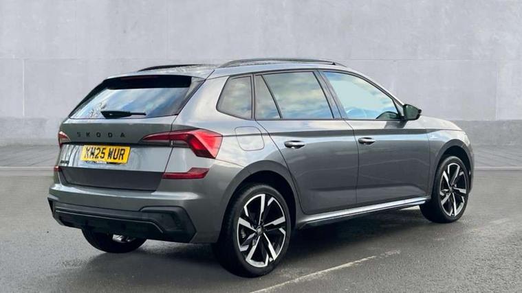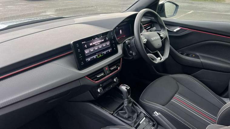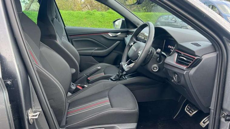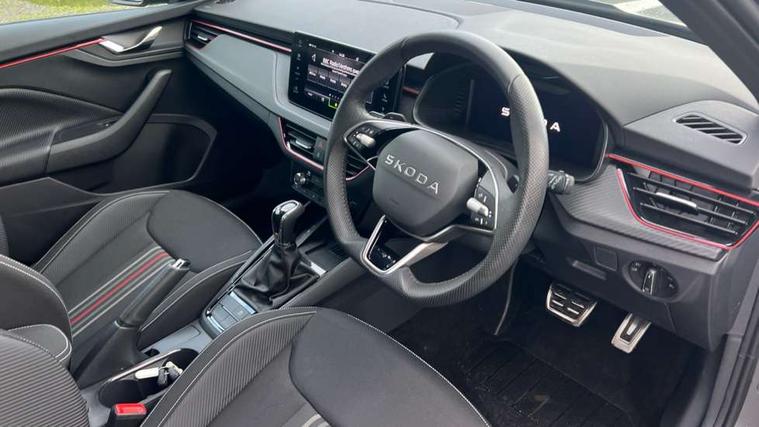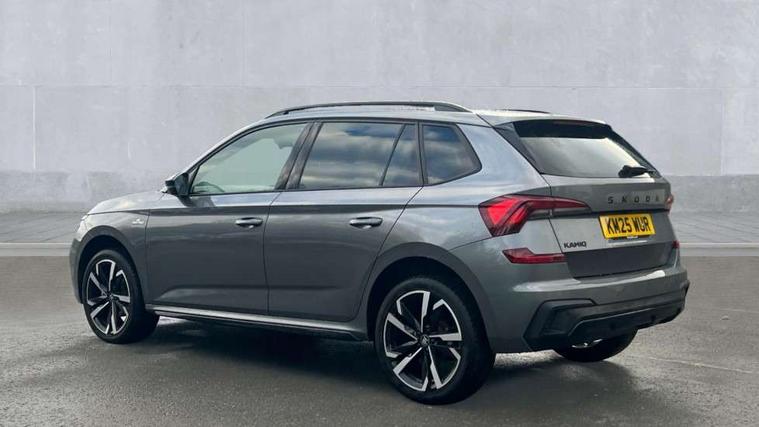 Advanced driver attention and drowsiness monitor, Bluetooth system, E-call, Front assist system, PAS, Rear parking sensors, Rear view camera, Service indicator, Speed limiter, Traffic sign recognition, Virtual cockpit with 10.25" display, Voice control system, Wireless smartlink, 4 USB C ports, 8 Speakers, 9.2" Skoda navigation display, DAB Digital radio, Auto dimming rear view mirror, Automatic headlight control with coming home and leaving home feature, Black door mirrors, Black radiator grille, Black rear diffuser, Black roof spoiler, Body colour bumpers, Body colour door handles, Boot lettering in black, Extended tailgate glass, Fixed panoramic sunroof with black roof rails, Front and rear electric windows, Heated rear window, LED daytime running lights, LED high beam, LED low beam, LED third brake light, Light sensors, Monte carlo plaque, Privacy glass, Rear side wing doors, Rear wiper, Ticket holder inside windscreen, 12V socket in luggage compartment, 3 seat bench in 2nd row, Aluminium pedals, Ambient lighting in white/red, Art leather carbon decor inserts, Art leather carbon door inserts, Black roof lining, Cargo elements, Chrome inner door handles, Driver and passenger sun visors with vanity mirror, Dual zone climate control, Front and rear roof lights, Front centre armrest, Front head restraints, Glove compartment with illumination, Height adjustable driver seat, Height adjustable front passenger seat, Ice scraper, Inner circulation control with pollen filter, ISOFIX on front passenger seat, Isofix preparation for back seats, Leather gearknob and handbrake lever, Manual lumbar support for front seats, Monte Carlo cloth upholstery, Net package and top tether hooks in boot space, Net under rear shelf, Pocket on the back of both front seats include mobile phone pockets, Rake/reach adjustable steering wheel, Reading lights, Rear centre armrests, Red hotstamping, Single front passenger seat, Sports seats, Textile floor mats, Third rear headrest, Top tether for front passenger seat, Umbrella in driver's door, Light and view plus package - Kamiq, 3x3 point rear seatbelts, Airbags - driver and front passenger, Disc brakes, ESP, Extended and predictive pedestrian/cyclist protection, Front passenger airbag deactivation switch, Front side airbags with curtain airbags, Hill hold control, Manual leather parking brake, Manual rear child locks, One tone horn, Seatbelt reminder for driver an co-driver, Traction control, Tyre pressure monitor, Anti-theft alarm system with interior monitoring, backup horn, towing protection and remote central locking with SAFE system, Anti-theft wheel bolts, Electronic engine immobilizer, 18" Ursa black diamond cut alloy wheels,