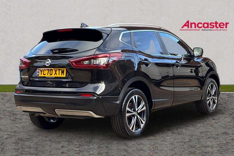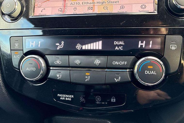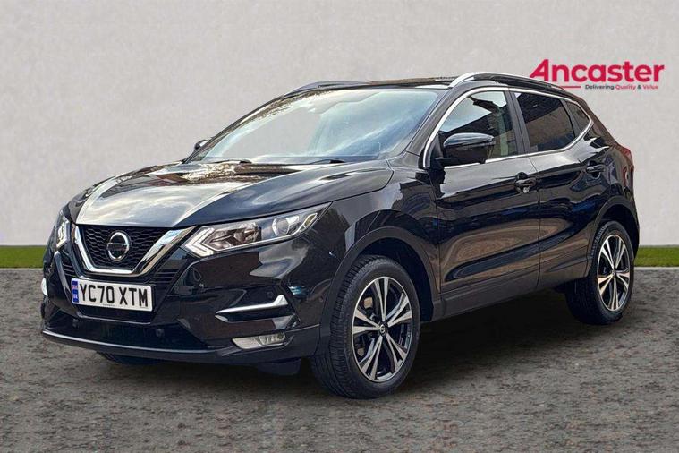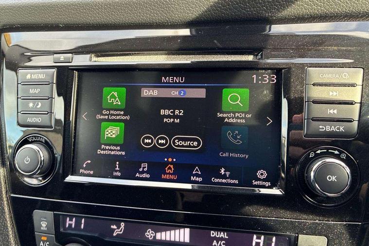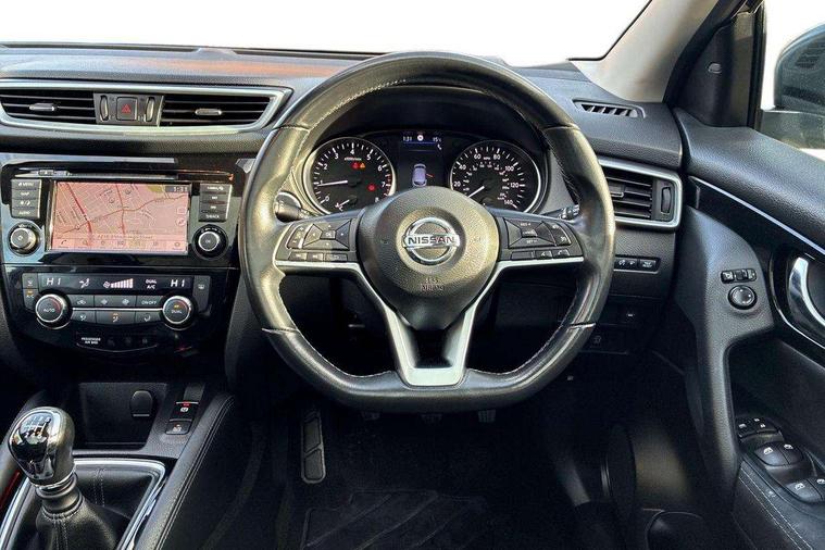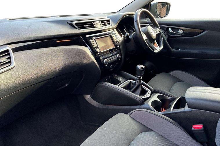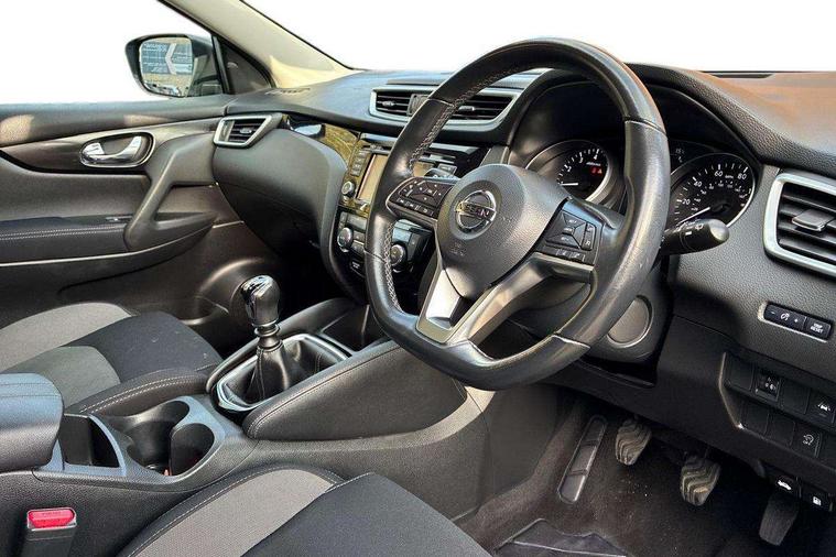 Advanced drive assist display 5'' TFT coloured screen, Android Auto, Apple CarPlay preparation, Bluetooth connectivity, Electric speed sensitive power steering, Front parking sensors, Intelligent around view monitor, Intelligent parking assist, Lane departure warning system, Nissan connect evo 7" touchscreen navigation and entertainment system, Normal or sport selectable steering, Outside temperature sensor, Push button starter, Rear parking sensors, Rear view camera, Service interval indicator, Smartphone integration, Stop/start system, Tomtom connected services, Traffic sign recognition, Trip computer, Voice control system, 6 speakers, AM/FM radio, CD audio system, Aux-in socket, DAB Digital radio, Rear USB connection, Steering wheel mounted audio controls, USB port, Anti dazzle rear view mirror, Auto wipers, Body colour bumpers, Body coloured door handles, Body coloured door mirrors, Chrome window surround, Daytime running lights dip function when turn signal applied, Electric folding door mirrors, Electric front and rear windows with one touch illuminated window controls, Electric front/rear windows, Electrically adjustable door mirrors, Front fog lights, Halogen headlights, Heated door mirrors, High beam assist, Intelligent auto headlights, LED indicators in door mirrors, Matt silver roof rails, One touch 4x auto windows with illuminated switches, Privacy glass, Rear roof spoiler, Rear wiper with reverse link, Shark fin antenna, Signature LED daytime running lights, Underbody vortex generators, 2 X front 12v power sockets, 3 height adjustable rear headrests, 60/40 split folding rear seat, Ambient lighting, Ambient lighting in centre console, Boot lighting, Centre console storage box/armrest, Chrome interior door handles, Cloth upholstery, Configurable luggage board system, Driver's seat manual height adjust, Dual zone climate control, Front and rear door pockets with bottle holders, Front and rear seat belt pre-tensioners with load limiters, Height adjustable front headrests, ISOFIX restraints on outer rear seats x2, Leather D shaped steering wheel, Leather gear lever, Leather knee pad, Manual height adjustable front passenger seat, Manual lumbar support on driver seat, Parcel shelf stow function under luggage board, Pollen filter, Rear armrest with 2 cupholders, Synthetic leather wrapped door handle with contrasting stitching, Tilt/telescopic adjustable steering wheel, Safety shield plus pack - Qashqai, 6 airbags - Driver, front passenger, curtain and side airbags, ABS, ESP, EBD and brake assist, Auto hold function, Child locks on rear doors, Electronic parking brake, Front and rear seat belt warning, Front passenger airbag deactivation, Height adjustable front seatbelts, Hill start assist, Intelligent emergency braking with pedestrian recognition, Three 3 point rear seatbelts, Tyre pressure monitoring system, Anti-theft immobiliser, Intelligent Key, Remote central locking, Thatcham Cat.1 alarm, Glossy black dash trim, Tyre puncture repair kit,