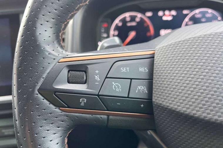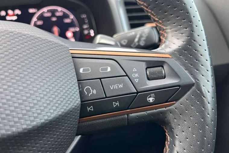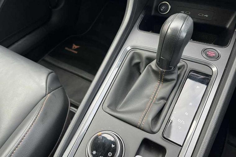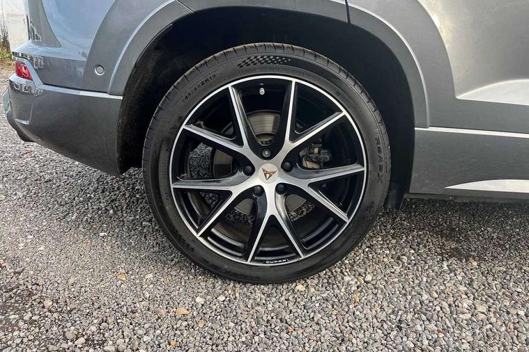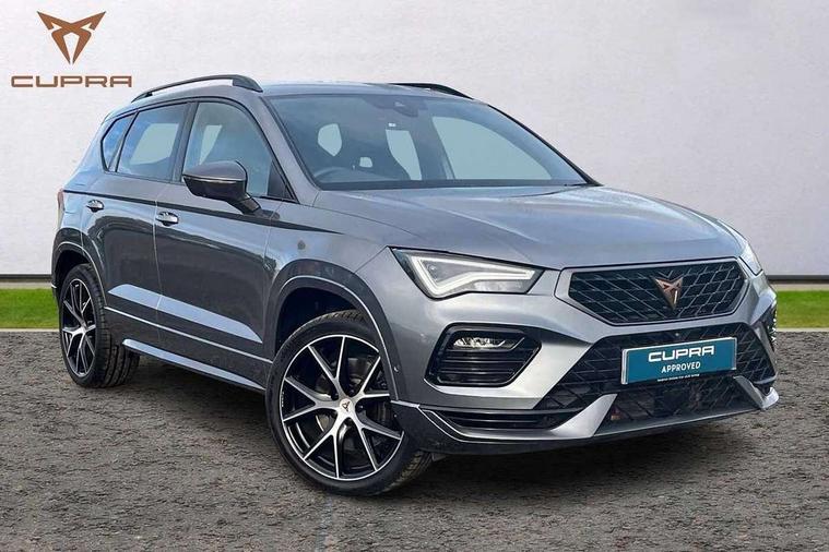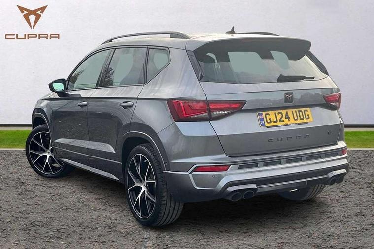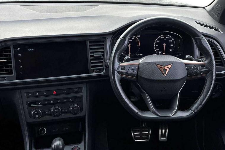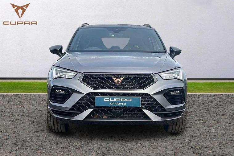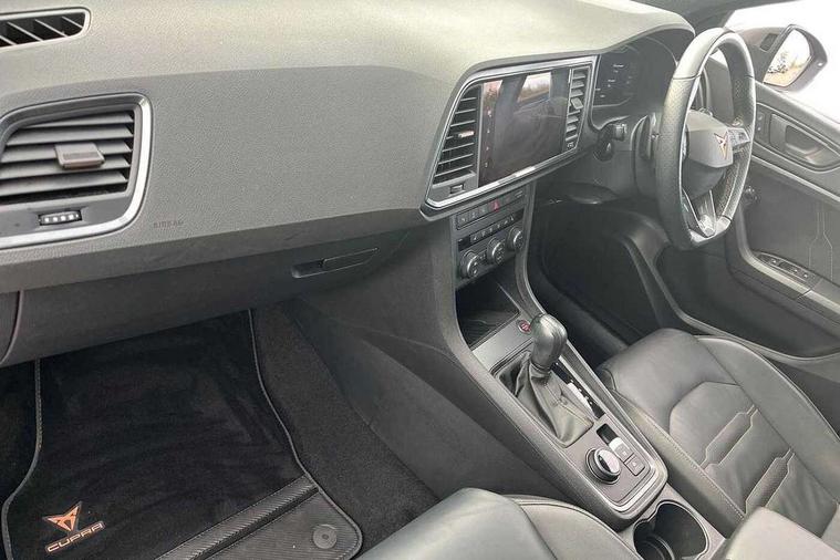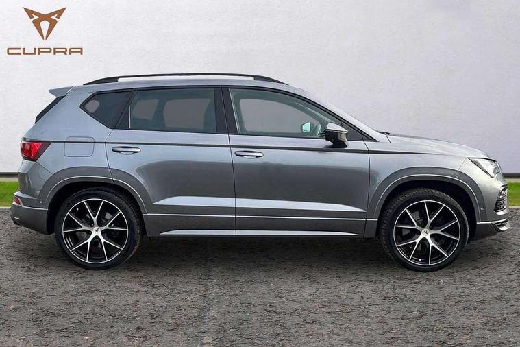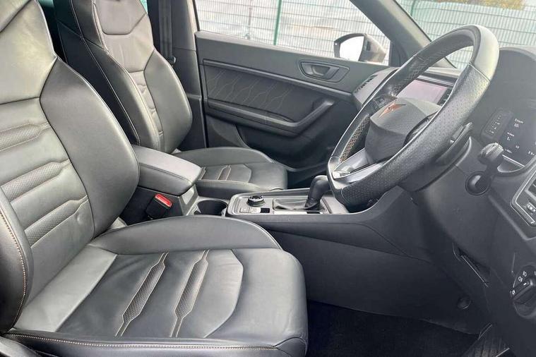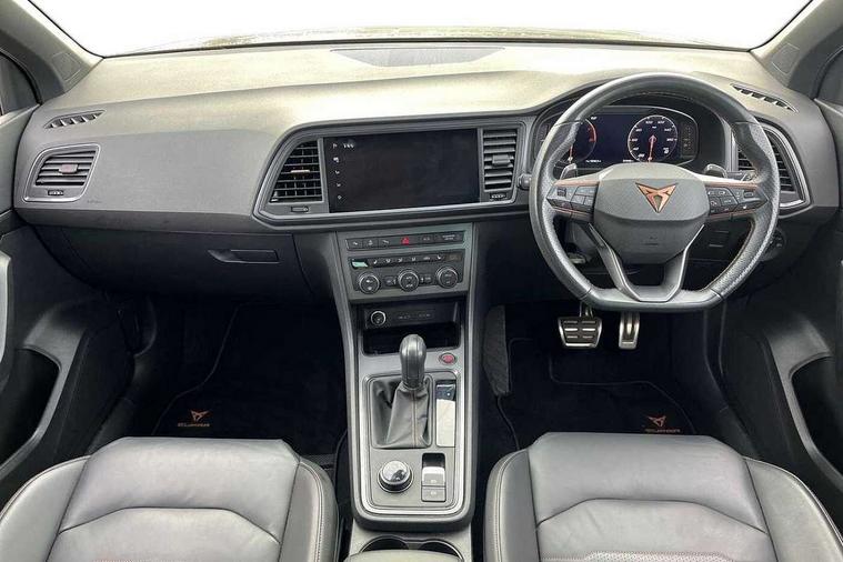 CUPRA drive profile -Normal, Sport, CUPRA and Individual modes, steering/throttle response, gearshift mode, sound actuator and dynamic chassis control, Digital cockpit, E-call, Electric tailgate with virtual pedal, Front and rear view camera, Outside temperature gauge, Progressive power assisted steering, Self parking functionality (includes front and rear parking sensors), Top view camera, Trip computer, Wireless full link smartphone integration, Wireless phone charger, CUPRA sport suspension, Steering wheel mounted audio/phone controls, Body colour bumpers with dark aluminium diffusor, Body coloured wheel arch surrounds, Dark tinted rear windows, Daytime running lights, Door mirrors with welcome CUPRA light silhouette, Dynamic headlight range control with self adjusting whilst driving, Electric adjustable/heated/folding door mirrors, Front and rear electric windows, Front grille frame in chrome, Full LED headlamps with lens and LED front fog lamps with cornering function, Gloss black door mirrors, Gloss black roof rails, Gloss black side mouldings, Gloss black side window trim, Illuminated aluminium front door sill, LED rear tail lights with dynamic indicators, Rear fog lights, Rear side wing doors, Rear spoiler, Rear wash/wipe, Specific CUPRA design front bumper, Third brake light, Visible twin black exhaust pipes in both sides with dark aluminium diffuser, 12V socket in front, 3 seat bench in 2nd row, 60/40 split folding rear seat, Aluminium pedals, Black roof lining, Cupra steering wheel emblem, Dual zone climate control, Electric driver seat with memory function, Front and rear head restraints, Front centre armrest, Front seat back storage pockets, Heated front seats, Heated steering wheel, Height adjustable driver and passenger seat with lumbar adjustment, ISOFIX points in outer rear seats with top tether anchorage points, Leather sport bucket seats, Leather steering wheel and gear knob, Multicoloured ambient lighting with LED interior illumination, Pedal cluster, Rear armrest and easy back seat release mechanism from boot, Single front passenger seat, Sports steering wheel, Steering wheel mounted gearshift paddles, Storage compartment in roof console for sunglass, Storage compartment under driver's seat, Convenience pack - Ateca, Interior lighting pack - Ateca, Navigation system plus pack with DAB - Ateca, Safe and driving pack with High beam control - Ateca, 3x3 point rear seatbelts, ABS, Traction control system (TCS), Electronic stability control (ESC) and Electronic differential lock system (XDS), Airbags - Driver and front passenger airbag with deactivation, front side, two curtain and driver's knee airbags, Black brake callipers with CUPRA logo, Electric parking brake with auto hold function, Front and rear seatbelt reminder, Front assist with autonomous emergency braking, Hill hold control, Manual rear child locks, Single tone horn, Tiredness recognition system, Tyre pressure monitoring system, Alarm, Keyless entry, Locking wheel bolts,
