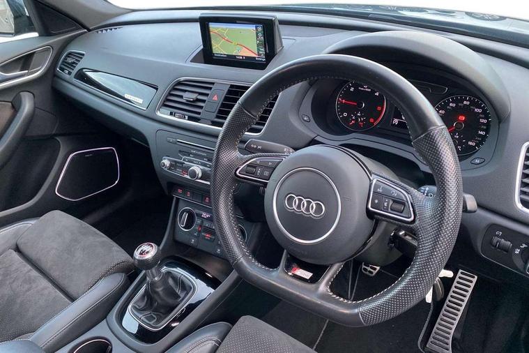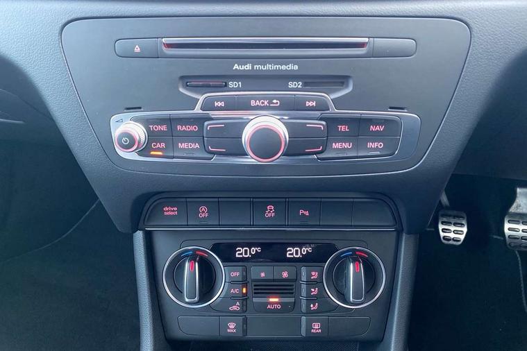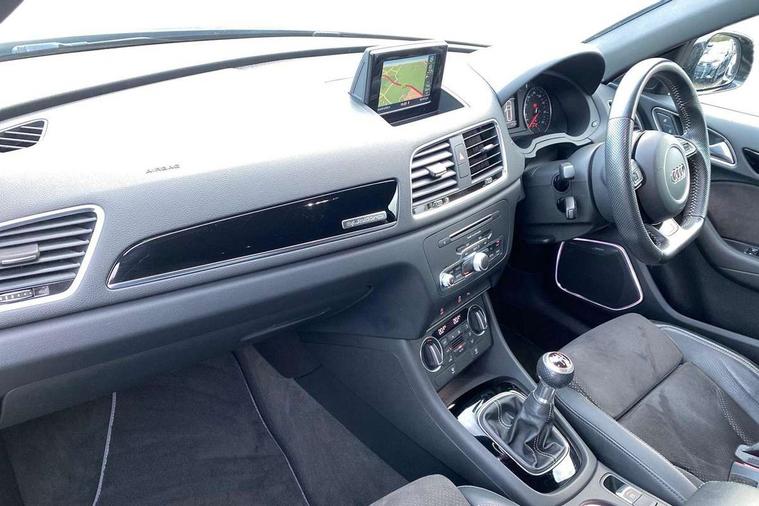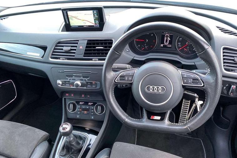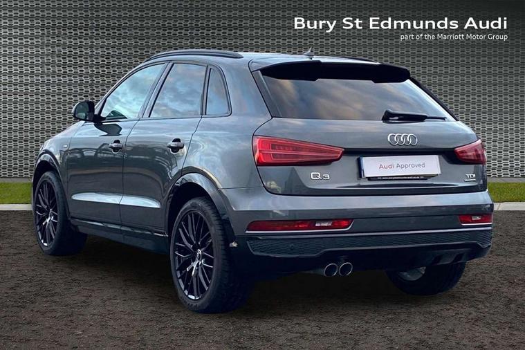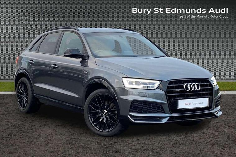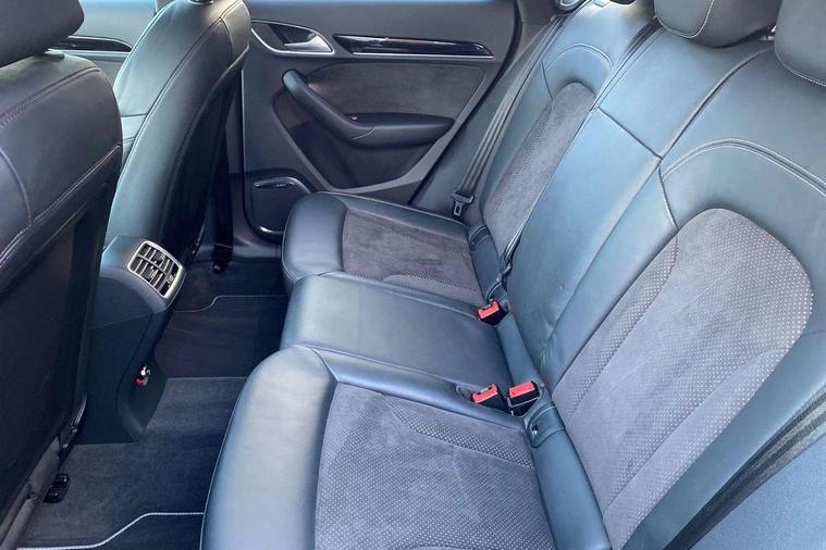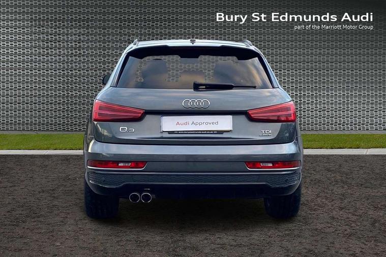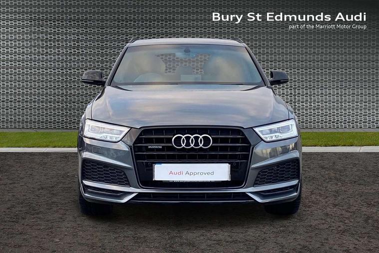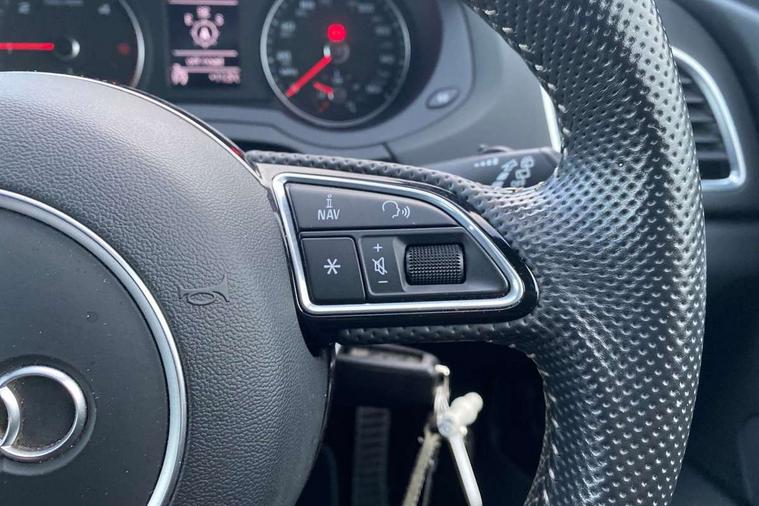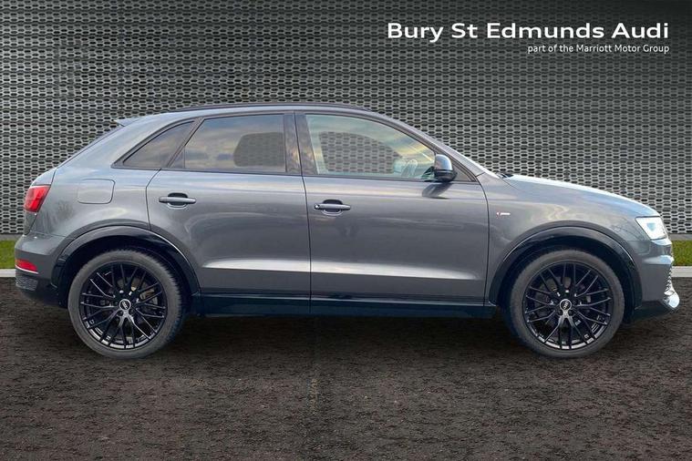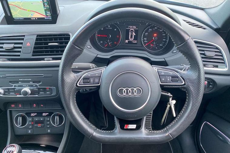 6.5" colour display screen, Audi drive select, Cruise control, Electro-mechanical PAS, Low washer fluid indicator, MMI - Multi Media Interface control system, On board computer, Remote electric boot opening/closing, Service interval indicator, Voice control system, Diesel particulate filter, Sports suspension, Audi music interface, BOSE sound system, DAB digital radio module, Acoustic windscreen, Aluminium window surround, Auto dimming rear view mirror, Black exhaust tailpipes, Black high gloss door mirrors, Black roof rails, Body coloured bumpers, Chrome fog light surround, Chrome grille, Coming home function, Door mirror integrated indicators, Front and rear electric windows, Front fog lights, Front lip spoiler, Heated windscreen washer jets, High Gloss Black Contrast Bumpers, High Gloss Black rear spoiler, LED daytime running lights, LED headlights with headlight washers, LED rear lights, Light and rain sensor for auto activation of lights and windscreen wipers, Loading sill protector in stainless steel, Privacy glass, Rear diffuser with platinum insert, Rear wiper, S Line body styling, Sunband for windscreen, 12V socket in rear centre console, 3 spoke flat bottom multi-function perforated leather steering wheel with contrast stitching, Aluminium door sill trims, Aluminium gear knob, Aluminium pedals, Black cloth headlining, Dual zone climate control, Electric front lumbar adjustment, Front and rear headrests, Front and rear velour floor mats, Front centre armrest with storage compartment and angle adjustment, Front sports seats, Height/reach adjust steering wheel, ISOFIX on front passenger and rear outer seats, Jack and tool kit, Retractable luggage cover, Reversible boot floor, Split fold rear seat, Storage compartment and 12V socket, Under floor storage in luggage area, Audi Exclusive black styling pack - Q3, LED interior light pack - Q3, 3x3 point rear seatbelts, ABS+Electronic Brake force Distribution, Curtain airbags, Driver and passenger airbags, Driver and passenger side airbags, EDL + ASR, Electrically operated child locks on rear doors, Electromechanical parking brake, ESP, First aid kit, Front passenger airbag deactivation, Head airbags, Seatbelt warning light, Tyre pressure monitoring system, Warning triangle, Locking wheel bolts, Remote central locking, Thatcham category 1 alarm + immobiliser, Piano black finish inlay, Space saver spare wheel,