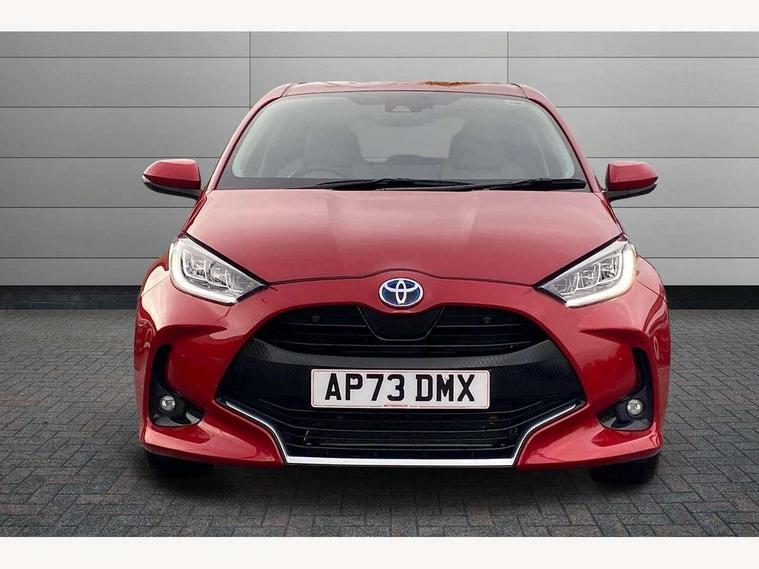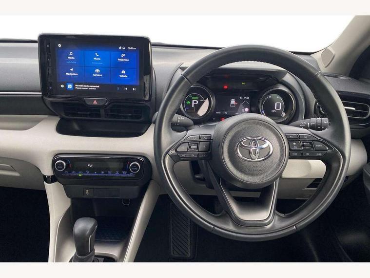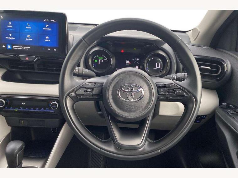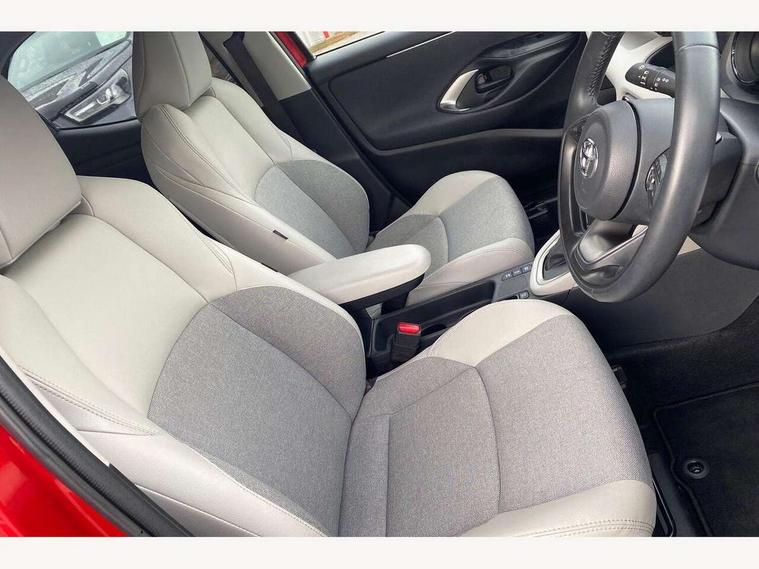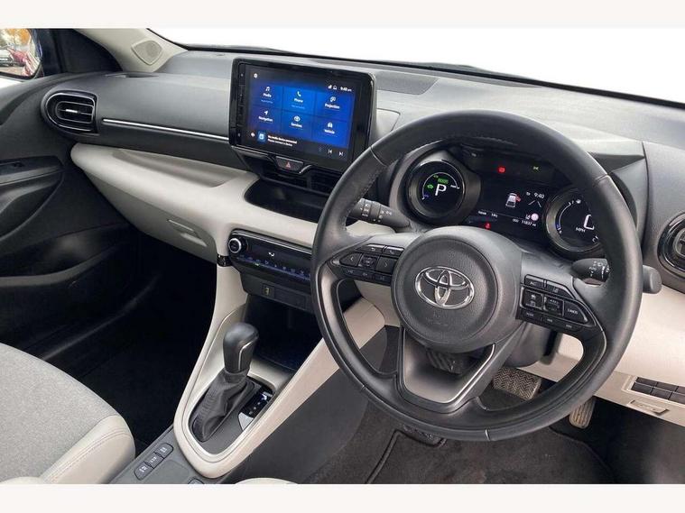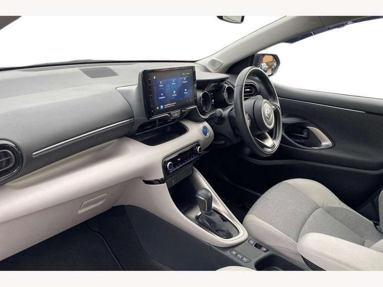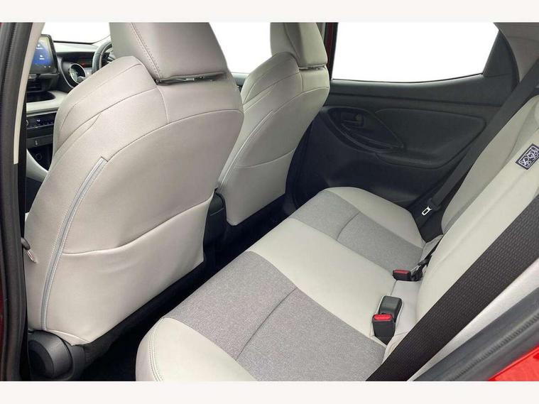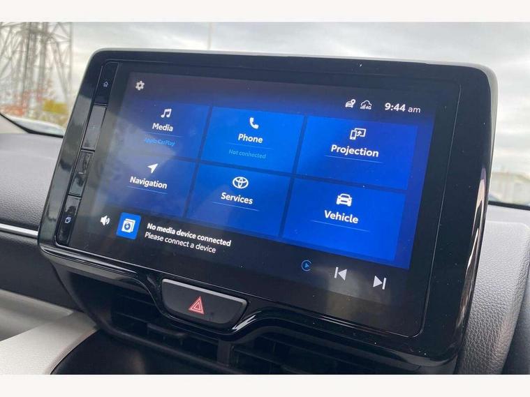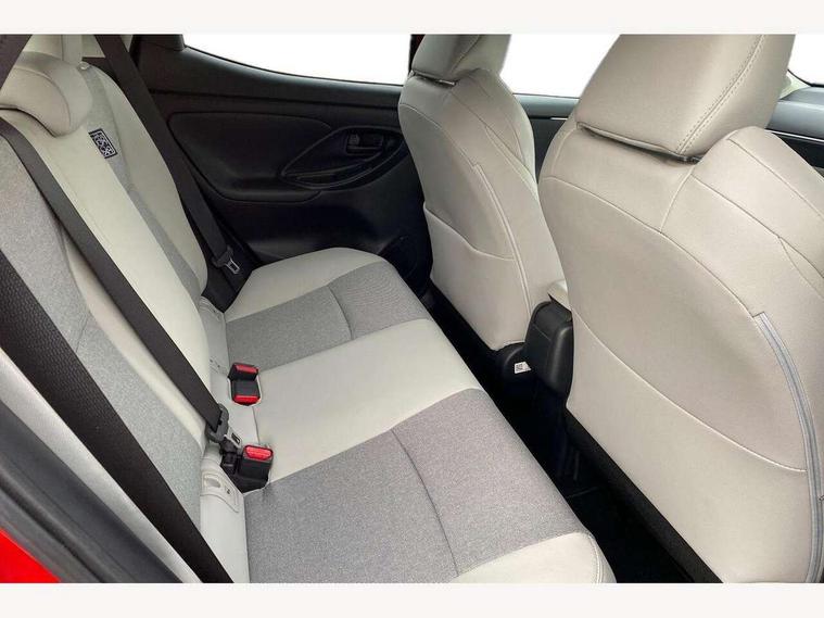 Adaptive cruise control, Adjustable speed limit with speed warning, Blind spot monitoring, Bluetooth connectivity, Colour binocular inspired displays with digital speedometer, E-call, Electric power steering, Hybrid energy display, Multi information display switches on steering wheel, Reversing camera, Smartphone integration with Apple CarPlay and Android auto, Tailgate, Touch 2 navigation system, Voice recognition, Vehicle Stability Control (VSC), 6 speakers, 9" HD multimedia display touch screen with Toyota smart connect, USB connection, Acoustic windscreen glass, Auto windscreen wipers, Automatic headlights, Automatically retractable door mirrors, Body coloured door mirrors, Electric adjustable heated door mirrors, Follow me home headlights, Front auto power windows with anti jam protection, Full LED rear lights, LED daytime running lights, LED front fog lights, LED front light guide, LED Headlights, LED High mounted stop lamp, LED Indicators, LED rear light guide, Manual headlight levelling, Painted chequered front grille, Rain sensor, Rear auto power windows with anti jam protection, Rear privacy glass, Rear side wing doors, Rear spoiler, Rear wiper, Satin lower front grille, Shark fin antenna, Turning signal integrated indicators in door mirrors, Variable front intermittent wipers, 3 adjustable rear headrests, 3 seat bench in 2nd row, 3 spoke leather steering wheel, 60/40 split folding rear seat, Active headrests, Adjustable boot height, Coat hooks in rear grab handles, Cup holders (2 front & door), Data Communication Module (DCM) connected services, Dual zone automatic air conditioning, Fabric seat with partial synthetic leather upholstery, Front armrest, Front sport seats, Glovebox, Grey roof lining, Height adjustable driver's seat, Height adjustable passenger seat, Isofix seat fixing, Leather gearshift, Map pockets on the backs of the front seats, Pollen filter, Shopping bag hooks, Single front passenger seat, Tilt/telescopic steering column, Parking pack - Yaris, 3 point seatbelts on all rear seats, ABS+EBD+Brake assist, Electronic parking brake, Emergency brake light system (EBS), Front passenger airbag on/off switch, Front seatbelt reminder, Hill start assist control (HAC), Rear child proof door locks, Rear seat belt reminder, Supplemental Restraint System (SRS) 8 airbags: Driver & passenger's airbags, dual side curtain airbags, side impact airbags, front centre airbag, Toyota Safety Sense 2, Precollison + Night time Pedestrian & Cyclist Detection, Lane Trace Assist, Auto High Beam, Intelligent ACC & Road Sign Assist, Tyre pressure warning system, 2x Master key, Alarm/immobiliser, Keyless smart entry with push button start, Remote AC via MyT, Remote locking via MyT, Remote powered central double locking doors, Satin chrome interior styling, Soft touch instrument panel, Space saver spare wheel,