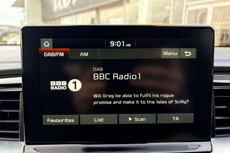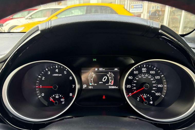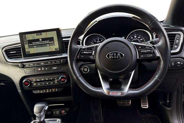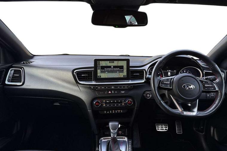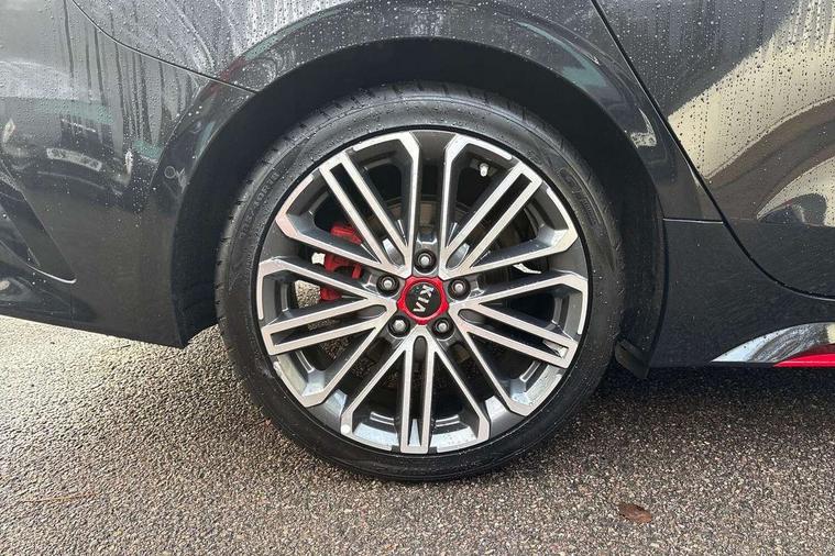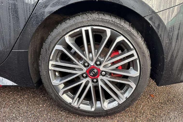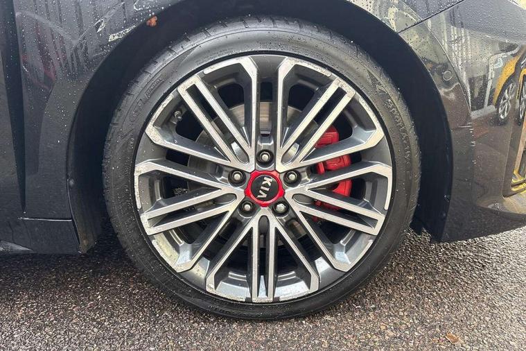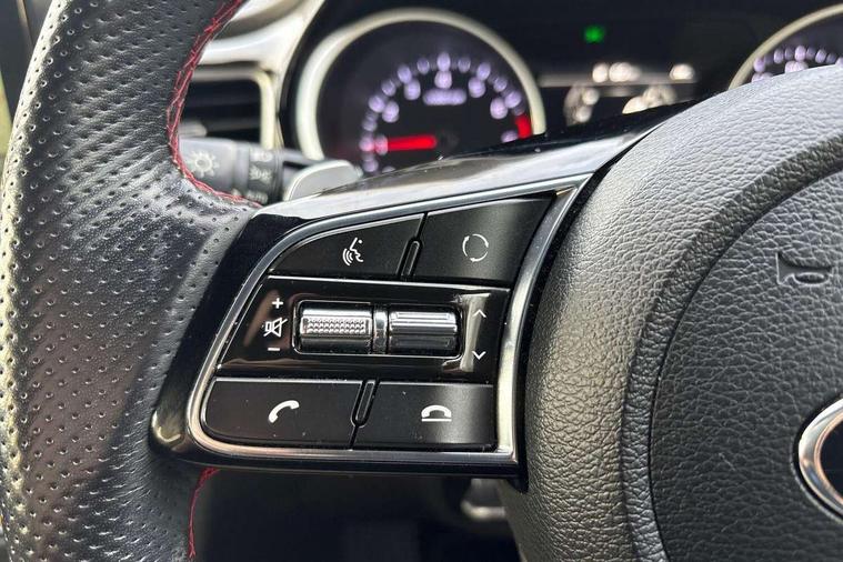 4.2" supervision cluster colour display with GT performance mode, 8" touchscreen satellite navigation with European mapping and traffic messaging channel, Apple car play/Android Auto, Bluetooth with Voice Recognition & Music Streaming, Cruise control + speed limiter, Drive mode selector, Driver attention warning, Emergency stop signalling system, Kia connected services featuring TomTom live, Lane keep assist, Motor driven power steering, Rear parking sensor, Reversing camera with dynamic guide lines, Smart park assist system (SPAS) with parallel/perpendicular/reverse with front/rear parking sensors, Trip computer, Intelligent Stop and Go, 6 speaker audio system, DAB Radio with MP3, Illuminated USB & aux ports, Steering wheel mounted controls, USB & AUX Ports for Connection of a Media Device, USB Fast Charger in Front Centre Console, Air intake with red accent lower lip, All-round Electric Windows with Front Auto Up & Down Function, Auto dimming rear view mirror, Automatic defog system, Automatic headlights, Body colour bumpers, Body colour exterior door handles, Body coloured rear roof spoiler with high gloss black trim, Chrome window surround, Electric adjustable/heated/folding door mirrors with LED Indicators and Kerbside Lights, Exterior front door handle illumination, Front fog lights, Front wiper de-icer, Headlamp levelling, Heated rear window with timer, High beam assistant, High gloss black and chrome with red insert radiator grille, High gloss black door mirrors, High gloss red side sill mouldings, LED Bi-Function headlights, LED daytime running lights, LED High-mounted Brake Light, LED rear fog light, LED rear lights, Privacy glass (rear side windows and rear screen), Projection headlights, Puddle lights, Rain sensing front wipers, Rear bumper with diffuser trim and dual exhaust, Rear wash/wipe, Wide view drivers door mirror, Windscreen Washer Level Warning, 2 x 12V Power sockets (Front centre console), 3 x passenger assist grips, 60/40 split folding rear seat, All-round height adjustable headrests, Black headlining, Centre console storage and sliding armrest, Cupholders in centre console, Cupholders in rear armrest, Dash illumination dimmer switch, Driver & Front Passenger Sunvisors with Vanity Mirror Illumination & Ticket Holder, Driver + front passenger electric lumbar support, Driver's seat height adjuster, Dual Height Luggage Area Floor, Dual zone automatic air conditioning, Faux leather door centre trim with red stitching, Front and rear door storage, Front map light with sunglasses case, Front Passenger Seat Height Adjuster, Front seat and rear pockets, Gear shift indicator, Heated front seats, Heated steering wheel, Illuminated ignition key hole, Interior door lock/unlock function, ISOFIX Child seat top tethers and anchor fixings, Leather D-Cut steering wheel with red stitching, Leather gearshift, Load area cover, Luggage area light, Luggage area parcel shelf, Luggage hooks, Paddle shifter, Part leather/faux suede upholstery, Premium centre console with sliding cupholder cover, Rear Air Ventilation, Rear centre armrest, Rear coat hooks, Satin chrome interior door handles, Stainless steel pedals, Tilt/telescopic adjustable steering wheel, ABS with Electronic Brakeforce Distribution (EBD) and Brake Assist System (BAS), All round 3-point seatbelts, Dual front side airbags, Dual horn, Electric parking brake, Electronic stability control (ESC) and vehicle stability management (VSM), Front passenger airbag deactivation, Height adjustable front seatbelts, Hill start assist control (HAC), Impact sensing auto door unlocking, Rear door child safety locks, Seatbelt reminder warning, Traction control, Twin curtain airbags, Twin front airbags, Tyre pressure monitoring system, Alarm system, Engine Immobiliser & Deadlocks, Engine Start/Stop Button with Smart Entry System, Locking wheel nuts, Speed sensitive auto door locking, Black high gloss front console tray garnish & door trim, Satin Chrome Fascia Trim, 18" Alloy wheels with red centre cap, Tyre mobility system,