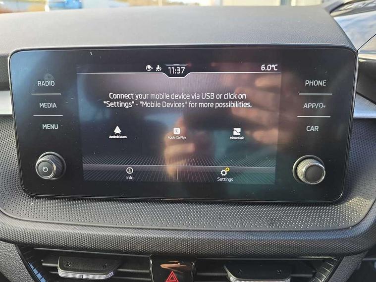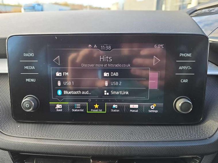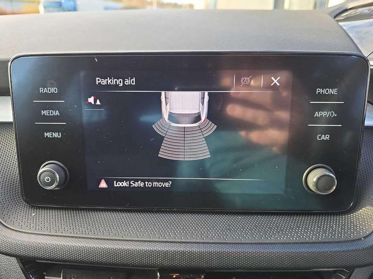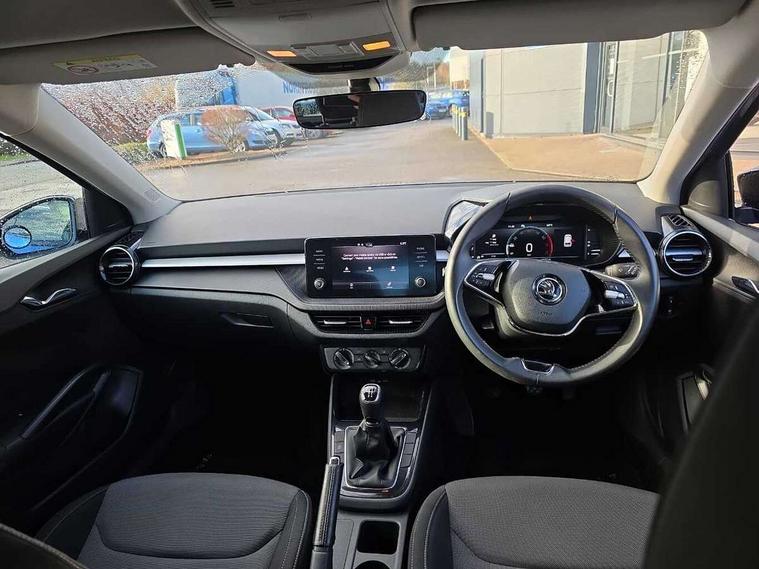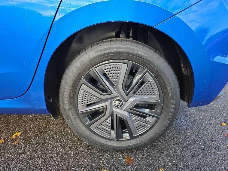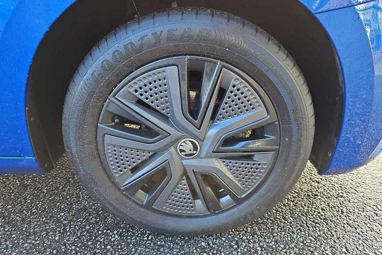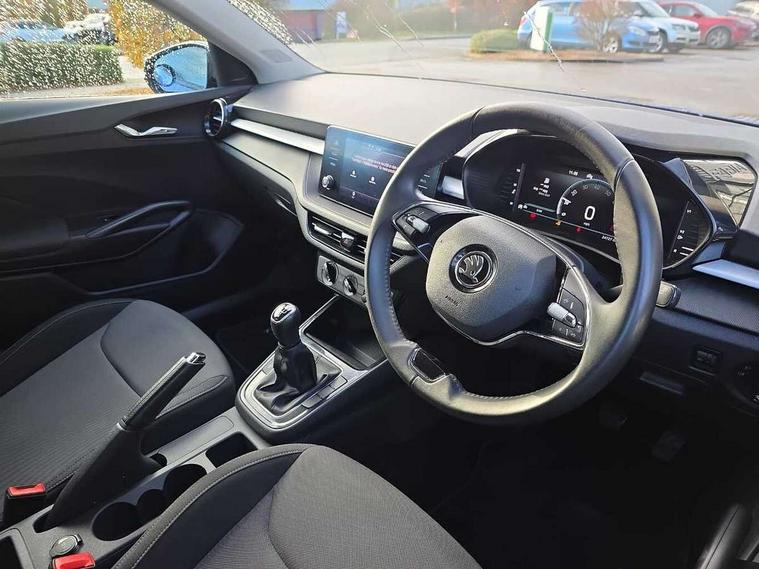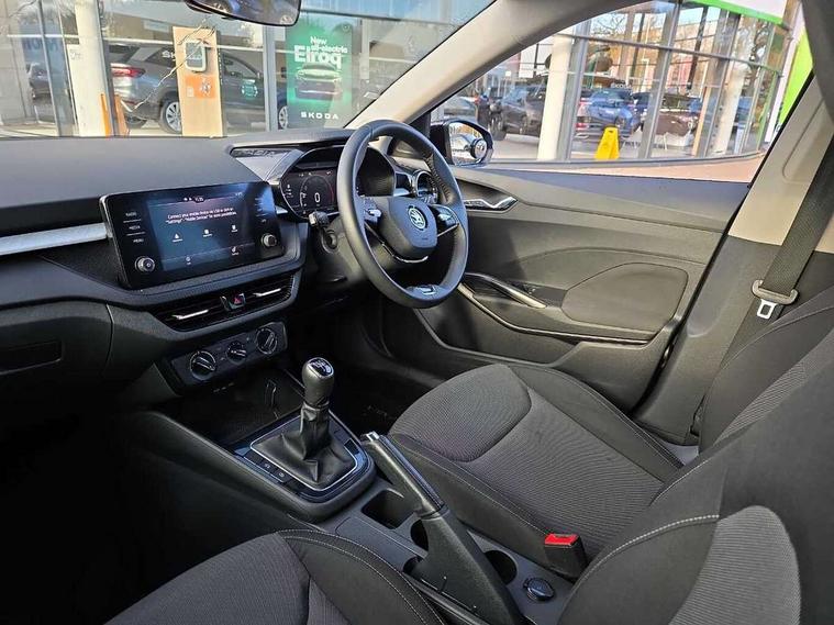 Bluetooth connection, Driver alert system - DAS, Electromechanical power steering, Exterior temperature gauge, Lane assist including road edge detection, Service interval indicator, Virtual cockpit with 10.25" colour display, 2x USB-C in the front (for data transmission and charging), 6 Speakers (4 in front and 2 in rear), Auxiliary socket for external MP3 player, Bolero radio with 8" colour display, DAB digital radio reception, Basic LED Headlights, Body coloured bumpers, Dimming rear view mirror with black frame, Door mirror integrated indicators, Electrically adjustable and heated door mirrors, Electrically adjustable front windows with function auto up/down, Front fog lights, Front window wiper intermittent control, Headlight range control - Automatic, Ice scraper in fuel cap, LED daytime running lights with coming and leaving home feature, Mechanical adjustable rear windows, Privacy glass, Rain sensor, Rear LED fog light, Rear side wing doors, Rear window wiper with washing nozzles, Roof mounted spoiler, SKODA tailgate lettering in chrome, Third brake light, 2 reading lights in front and 2 reading lights in rear, 3 rear headrests, Backrest split and folding, Central console with fixed cup holder and storage box, Chrome handbrake release button, Fabric upholstery, Gearshift knob/handle in leather, Grain satin black interior door handles, Hand brake lever handle in leather, Height adjustable drivers seat, Height adjustable front headrests, Height adjustable steering wheel, ISOFIX and TopTether anchorage points to the outer rear seats, ISOFIX and TopTether on the front passenger seat, Luggage compartment lighting, Pollen filter, Rear seat bench unsplit, Single front passenger seat, Storm grey headlining, Sun visors with mirror and airbag label on passenger side, Ticket holder, Umbrella in drivers door, 3-point height adjustable front seats belts with pretensioner and force limiter, Automatic warning lights in case of crash, Driver and passengers airbag with switch off function, e-Call+, ESC including ABS, MSR, ASR, EDS, HBA and XDS, Front and rear seat belt warning, FRONT ASSIST (AEB City and AEB Inter Urban), Front side airbags, Head airbags, One tone horn, Pedestrian protection, Three rear 3-points safety seat belts with pretensioner and force limiter including stop function for outer rear seat belts, Tyre pressure monitoring system, Anti-theft alarm system including immobiliser, interior monitoring, backup horn, and towing protection, Central locking with radio remote control, interior controls, SAFE function and 2 foldable keys, KESSY - Keyless engine start/stop, Anodized cross line upper decorative trim, Colour Edition air vents, Grain satin black central console cover, Grain satin black lower decorative trim, Satin black door and side trim panel in front, Anti-theft wheel bolts protection, Super-low rolling resistance tyres,