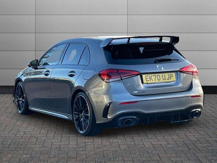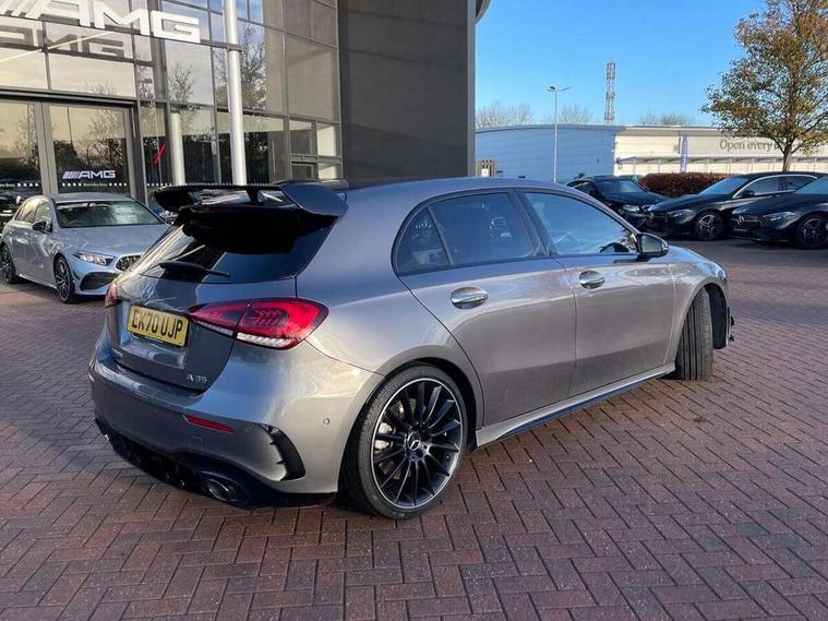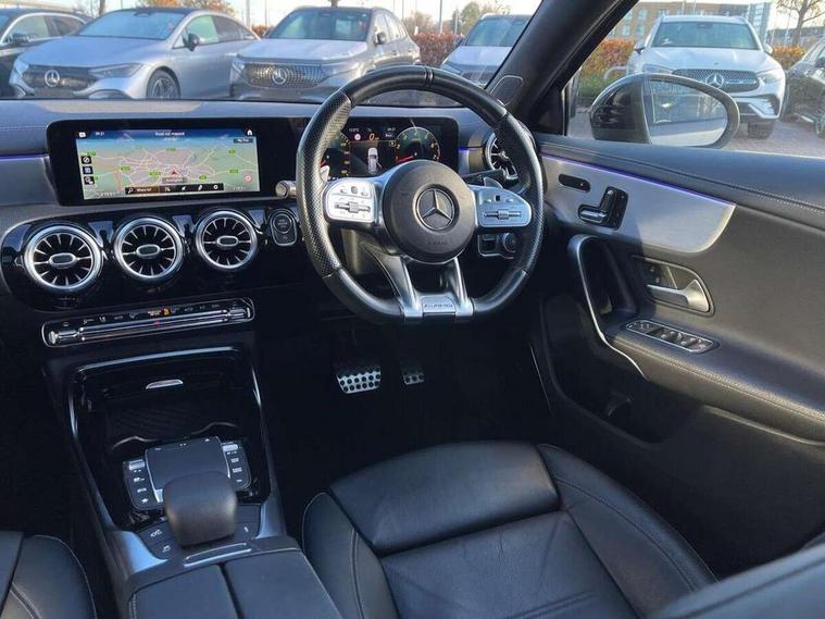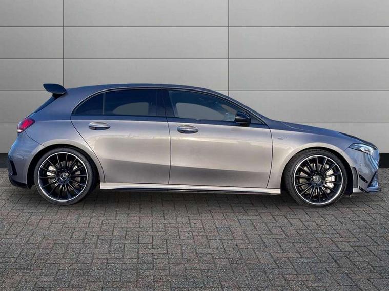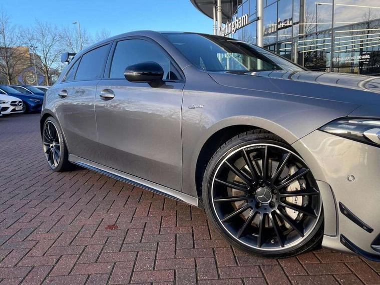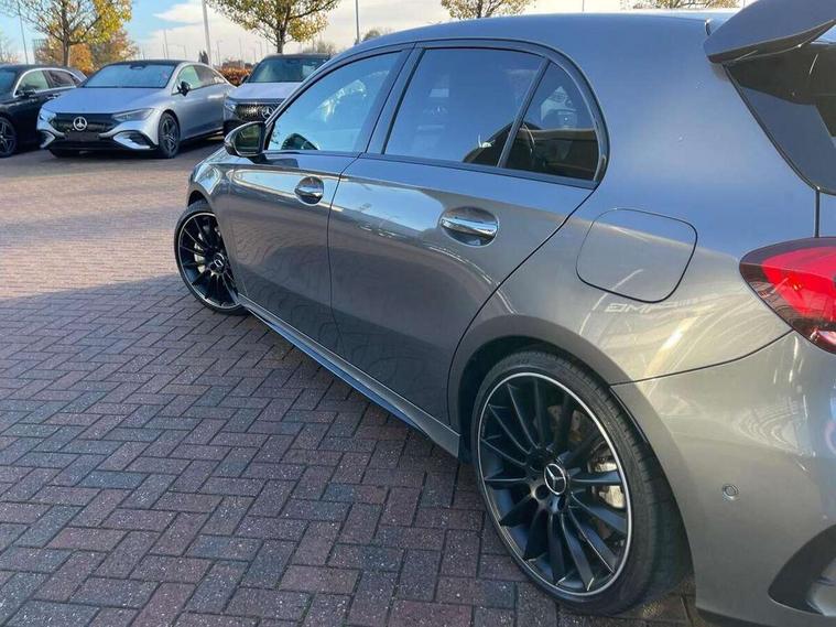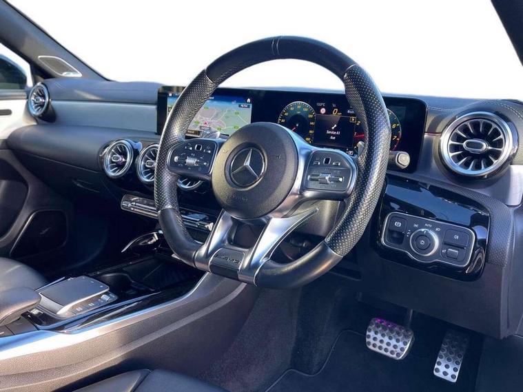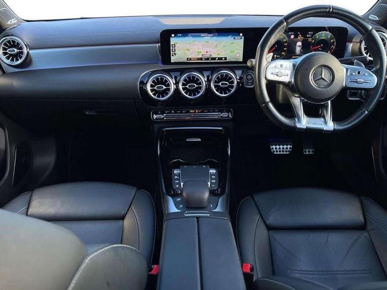 Ultrasonic sensors positioned in the front and rear bumpers, 10.25" Digital instrument cluster display screen, 10.25" media display, 180 degree rear view camera with parking guidelines, Active parking assist with visual and audible warning of detected obstacles, Attention assist, Brake pad wear indicator warning light, Car wash mode, Direct steering, Dual bluetooth interfaces, DYNAMIC SELECT with driving programs (Slippery, Comfort, Sport, Sport+ and Individual), ECO start/stop function, Fluid level warning indicator for fuel, oil, coolant and washer fluid, Hard-disk navigation, Hey Mercedes Voice activation, Lamp failure indicator, MBUX augmented reality for navigation, Mercedes me connect including emergency call system, accident recovery, breakdown management and maintenance, Mercedes me remote services, Outside temperature gauge, Owners manual in English, Pre-installation for car sharing, Preinstallation for Mercedes Benz link, Service indicator (ASSYST), Smartphone integration with Apple CarPlay and Android auto, Traffic sign assist, Trip computer, Wireless charging, Rear axle multi-link, 2 USB ports (type C) in rear stowage compartment and one in front of center console, Burmester surround sound system - 590W, DAB Digital radio, MBUX multimedia system with DAB digital radio and touchpad including satellite navigation, 4 Electric Front and Rear windows, Adaptive brake lights, AMG bodystyling - Front apron with splitter in chrome, rear apron with chrome trim and chrome visible trim elements in tailpipe, AMG Front apron with flics as air deflector elements on the outer air intakes, AMG radiator grille with twin blade lamella and AMG Lettering, AMG Rear apron with specific diffuser look with four vertical fins and two round chrome plated tailpipe trim elements with a diameter of 90 mm, AMG spoiler lip on roof, AMG Sports exhaust system with two round tailpipes attached in rear apron, Black weather strip, Body colour bumpers, Body colour door handles, Body colour side skirt, Electric adjustable and heated door mirrors with integrated LED side indicators, Front wings wheel arches with TURBO 4MATIC lettering, Headlamp assist automatic headlamp activation, Heated glass rear windscreen + timer control, High gloss black beltline, LED high performance headlamps with integrated LED daytime running lights, LED tail lamp, LED third brake light, Multibeam LED with adaptive highbeam assist plus, Panoramic sliding sunroof, Privacy glass, Radio aerial, Rain sensing windscreen wipers with two sensitivity settings, Rear fog lights, Rear wiper, Trim elements on louvres in outer air inlets in silver chrome, Wider wheel arches for AMG wheels, Window line trim strip in high gloss black, 40:20:40 split folding rear seats, AMG Performance steering wheel in nappa leather, Auto Mercedes-Benz child seat recognition sensor, Black air vents with surround in silver chrome, Black roof lining, Brushed stainless steel sports pedals with rubber studs, Controller on centre console with chrome surround, Electrically adjustable front memory seats including lumbar support, Floor mats with stitched edging and AMG lettering, Front centre armrest with storage compartment, Front seat backs luggage nets, Front seat cushion length adjustment, Heated front seats, Height/reach adjustable steering column, Illuminated front door sills with changeable cover, Interior lighting - 64 colour Ambient lighting, Interior mirror with reading lamps in black and frameless, ISOFIX and top tether child seat fixing points in two outer rear seats, Rear armrest with 2 cupholders, Rear head restraints, Seat occupancy sensor for front passenger seat, Silver coloured aluminium gear shift paddles on steering wheel, Sports seats with integrated headrests, Stowage compartment in centre console with retractable cover, Sunvisors with illuminated vanity mirrors, Touchpad on center console, Twin front cupholders, Two zone thermotronic luxury automatic climate control, Aerodynamic pack - A Class, AMG night pack - A Class, Light and sight pack - A Class, Mirror package - A Class, Seat comfort pack - A Class, 3 rear 3 point seatbelts, ABS with Brake Assist, Active bonnet, Adaptive brake assist with hold function and hill start assist, Black seatbelts, Childproof locks manually operated for rear doors and electrically operated for rear power windows, Crash responsive emergency lighting, Driver and passenger head and side airbags, Drivers knee airbag, Dual stage driver/passenger airbags, Electronic parking brake, ESP curve dynamic assist, ESP with ASR, Front and rear seatbelt reminder, Front brake calipers with AMG lettering, Perforated front brake discs, Tyre pressure monitoring system, Warning triangle and first aid kit, Window airbags, Alarm system/interior protection/immobiliser, Keyless entry lock/unlock, Keyless Go, Remote central locking and crash sensor with emergency opening function, Urban guard vehicle protection system with immobiliser and interior protection, Light aluminium with longitudinal grain interior trim, 19" AMG multi-spoke matt black painted light alloy wheels with high sheen finish, Summer tyres, Tirefit sealant kit,