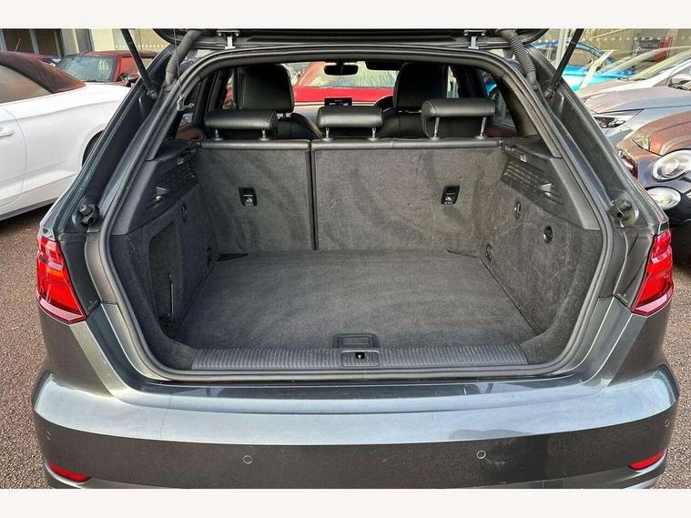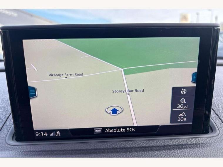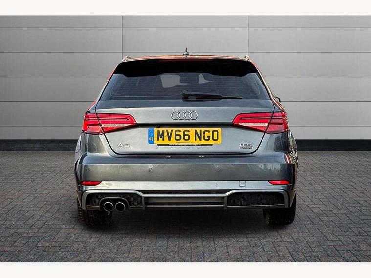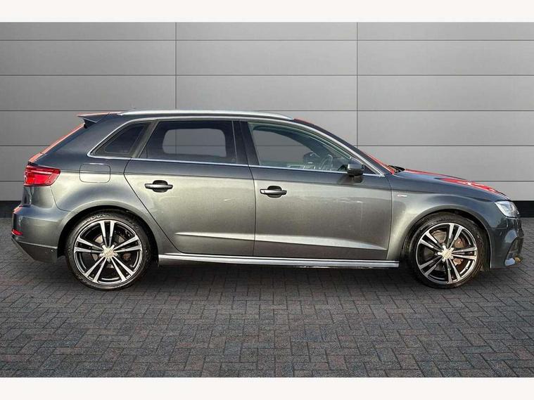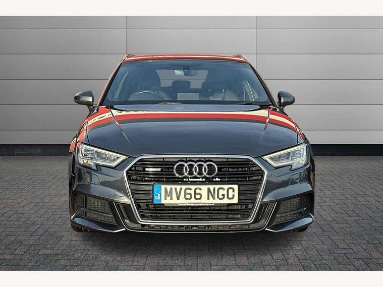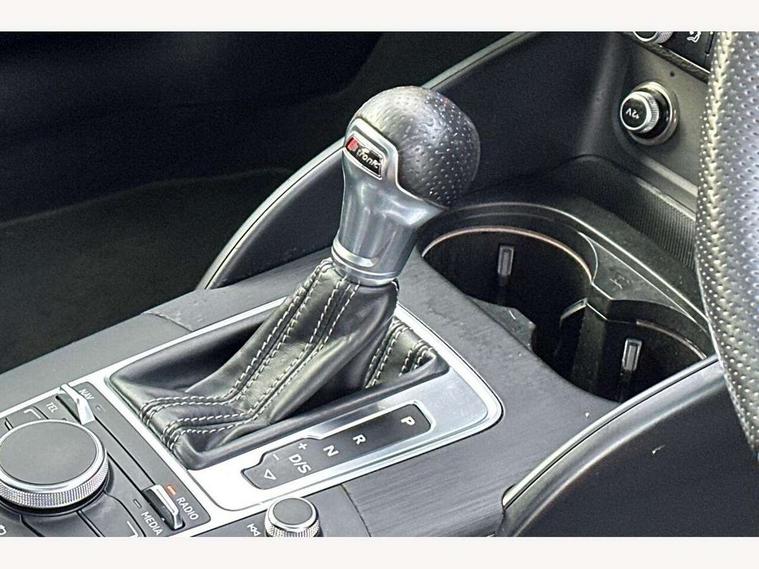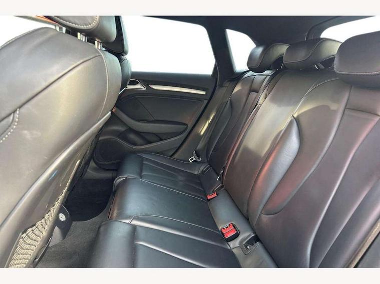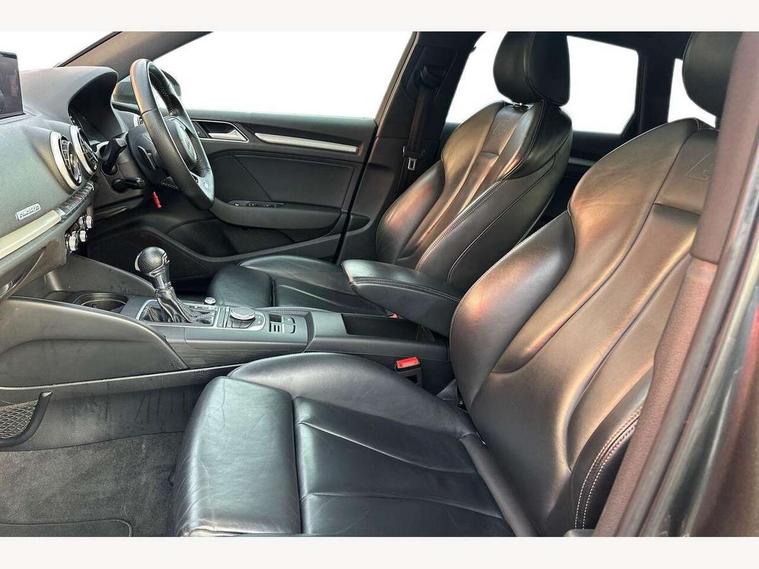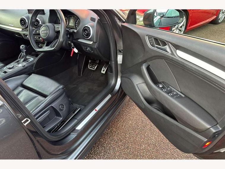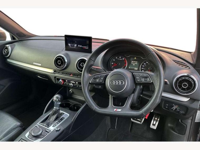 Audi connect, Audi drive select, Audi smartphone interface, Colour driver's information system display, Electro-mechanical PAS, Mobile telephone preparation - bluetooth interface, Service interval indicator, Speed limit display, Voice control system, 2 USB ports, Audi music interface, Auxiliary input socket, DAB Digital radio, Aluminium window trim, Body colour bumpers, Body colour door mirrors with integral indicators, Body colour roof spoiler, Chrome exhaust tailpipes, Electric front windows, Electric operated/heated door mirrors, Electric rear windows, Heated windscreen washer jets, Matt black radiator grille, Rear wiper, S Line body styling, Sport specific side air inlet grille and diffuser insert, 3 adjustable rear headrests, 3 spoke flat bottomed multi-function leather steering wheel, 4 lashing points to secure luggage, Adjustable front armrest, Black cloth headlining, Dual zone electronic climate control, Front and rear interior lights with delay, Front passenger seat isofix location point, Front/rear floor mats, Height/depth adjustable steering column, Illuminated glovebox, Illuminated luggage compartment, Illuminated vanity mirrors, ISOFIX child seat preparation+airbag deactivation, Jack and tool kit, Stainless steel pedals, Steering wheel gearshift paddles, Storage compartment in centre console, Storage compartment under front seats, Storage compartments in doors, Interior light pack - A3 Hatchback/Sportback/Cabriolet, Light and rain sensor pack - A3 Hatchback/Sportback, Storage and luggage pack - A3/RS3, 3 point seatbelts on all seats, ABS/EBD, Active bonnet, Active front headrests, ASR, Curtain airbags, Driver and passenger side airbags, Driver/Front Passenger airbags, Drivers knee airbag, EDL, Electromechanical parking brake, ESC - Electronic Stability Control + traction control, Front passenger airbag deactivation, Manual rear child locks, Multi-Collision braking, Seatbelt warning, Tyre pressure monitor, Warning triangle and first aid kit, Anti-theft wheel bolts, Remote control central locking, Thatcham category 1 alarm + immobiliser, Aluminium air vent surrounds, Aluminium trim elements, Space saver spare wheel,