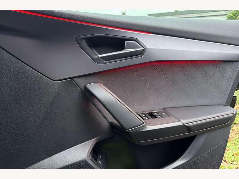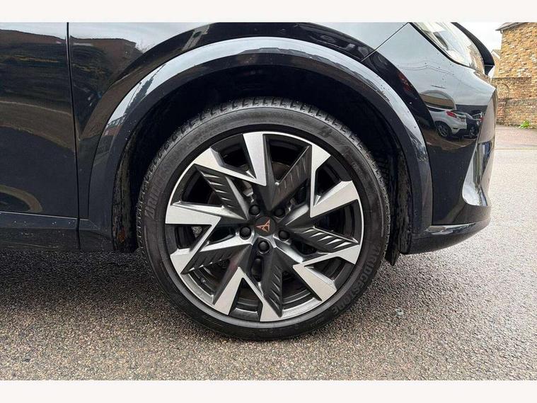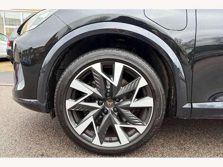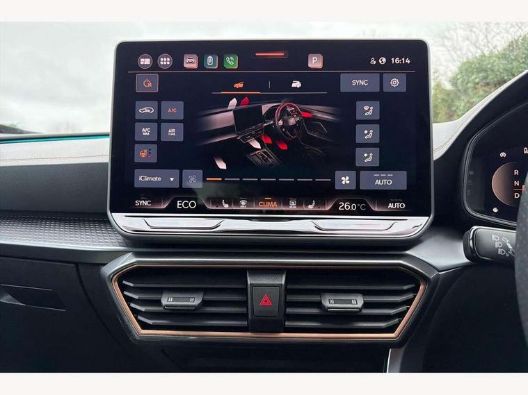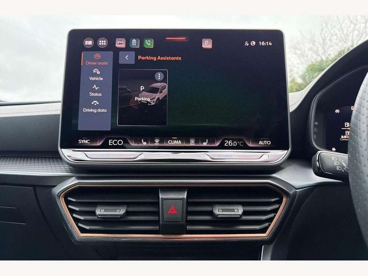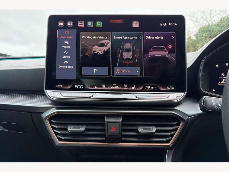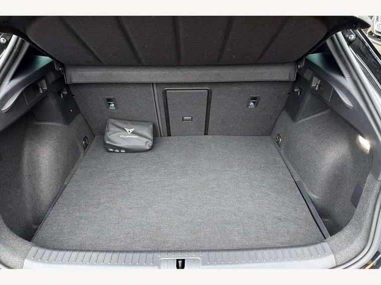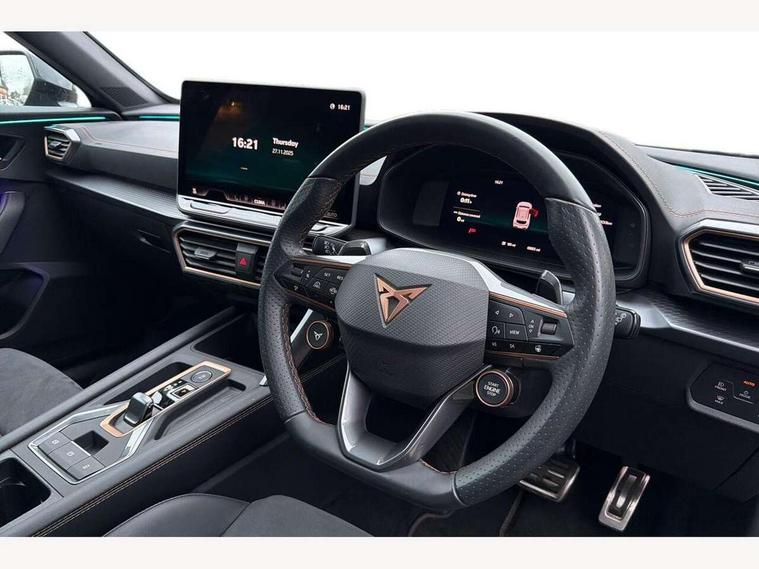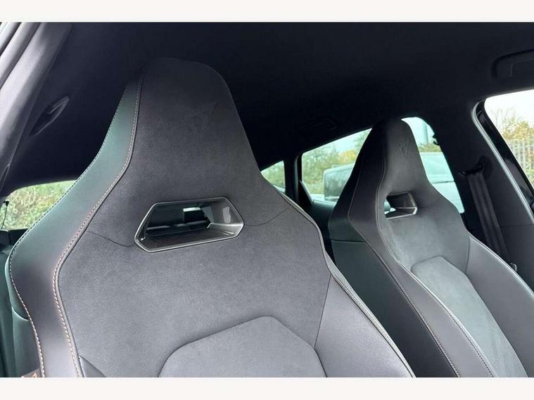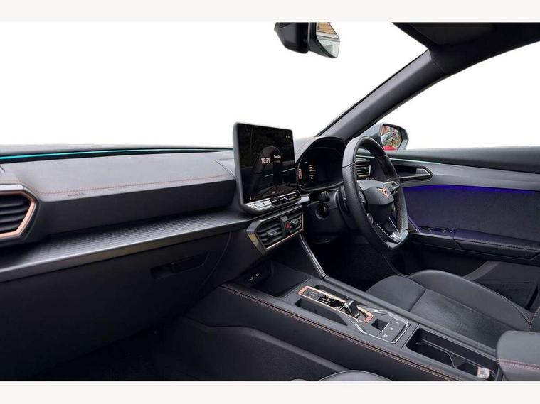10.25" digital cockpit and configurable dashboard, Adaptive cruise control with follow-to-stop and speed limiter, Advanced driver alert system, Dynamic chassis control with driving profile selection (Comfort, Sport, CUPRA, Individual), Dynamic road sign display, Emergency steering support with turn assist, Forward collision warning with automatic braking, Front and rear parking sensors, Full link phone integration, Lane assist, Rear view camera, RPM, trip computer, outside temp gauge, instrument light brightness, low fuel warning light, lights on reminder, gearshift indicator, Service interval indicator, Speed sensitive power steering, Start/stop system with regenerative braking, Virtual pedal and electric tailgate, Voice control system, Wired Android Auto, Wireless apple carplay, Wireless phone charger, 10 amp mode 2 charging cable, 32 amp mode 3 charging cable, Adaptive chassis control with continuous operation, CUPRA sport suspension, Electronic locking differential and dynamic traction support, 2 front and 2 rear USB type C sockets, Media system with navigation, 12.9" touchscreen display, voice control, DAB, steering wheel mounted controls, Auto dimming rear view mirror, Body colour door handles, Body coloured bumpers, Dark grey wing mirror, Daytime running light with automatic headlight control and coming home feature, Door panel ambient lighting, Dynamic headlight range control, Electric front/rear windows, Electrically adjustable heated and folding door mirrors with memory function, Gloss black roof rails and window surrounds, High beam assist, LED 3rd brake light, LED front fog lamps with cornering function, LED Taillights with dynamic indicator, Matrix LED headlights with multifunction camera, Rain sensing wipers, Rear diffuser with copper simulated exhaust pipes, Rear fog lights, Rear side wing doors, Rear wash/wipe, Tinted rear windows, Welcome lights (within exterior mirror housing), 12V socket, 2 front and 2 rear reading lights, 3 seat bench in 2nd row, 60/40 split rear bench seat with armrest and mechanical seat release, Black headlining, Black interior roof lining, Cupra sports pedals, Dust/pollen filter, Electrically adjustable front seats with lumbar support and memory function, Front and rear head restraints, Front centre armrest, Heated front seats, Heated supersports multifunction leather steering wheel with satellite buttons and gear shift paddles, Height/reach adjust steering wheel, Illuminated aluminium doorsteps, Illuminated interior front door sills, Illuminated sunvisor with mirror, Isofix, Leather dashboard, door insert and side trim panel, LED smart wraparound lighting, PVC/Dinamica microfiber upholstery + bucket seats, Satellite steering wheel, Single front passenger seat, Storage pockets on rear of front seats, Three zone climate control with control panel in rear, 3 point seatbelts on all rear seats, ABS, Brake control system - ESC and brake booster, Child proof door locks, Driver and front passenger airbags with front passenger airbag de-activation, Electronic parking brake, Front and rear disc brakes, Front side curtain airbags, Hill hold control, Public e-call, Seat belt reminder for front and rear seats, Tyre pressure monitoring system, Anti theft alarm system, KESSY Advanced - Keyless start, keyless entry with SAFELOCK, Locking wheel bolts, Copper and aluminium interior detailing, 19" Sandstorm machined sport black and silver alloy wheels, Breakdown and tool kit,