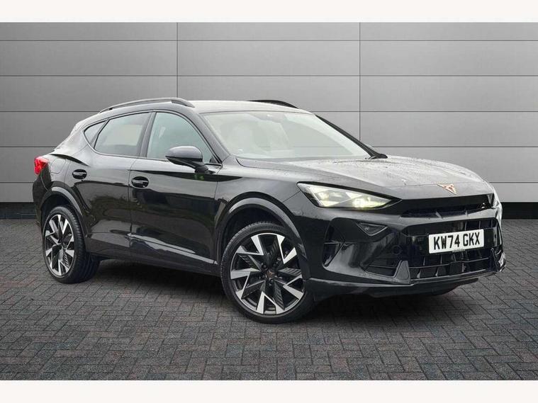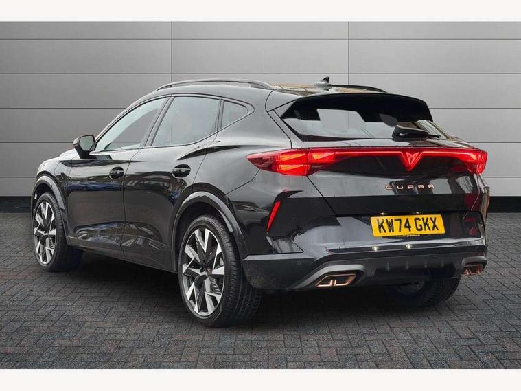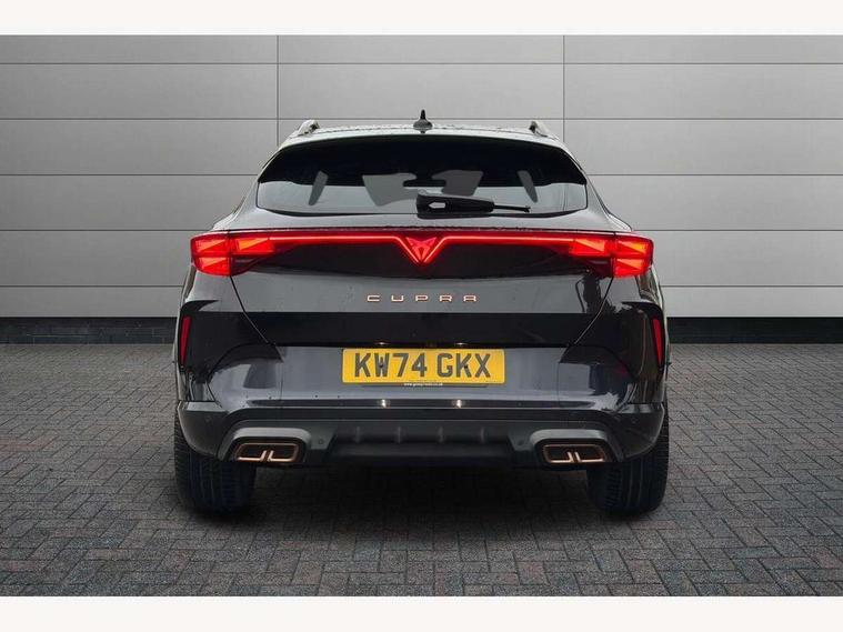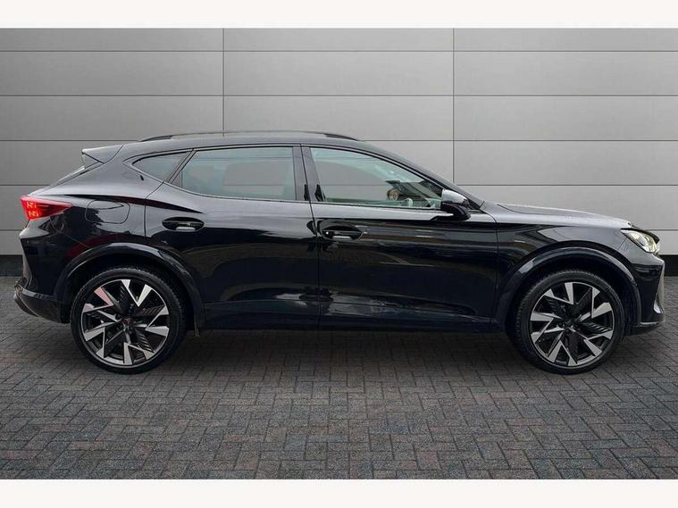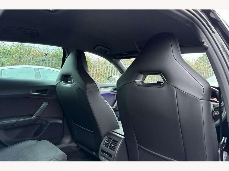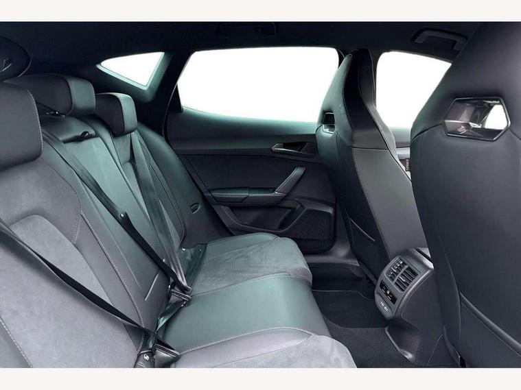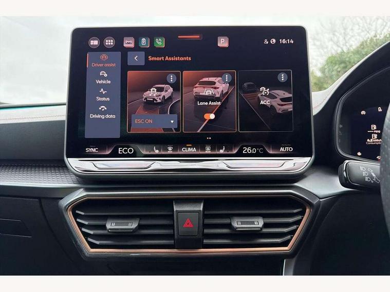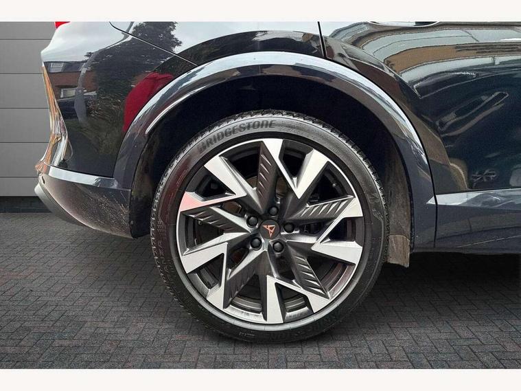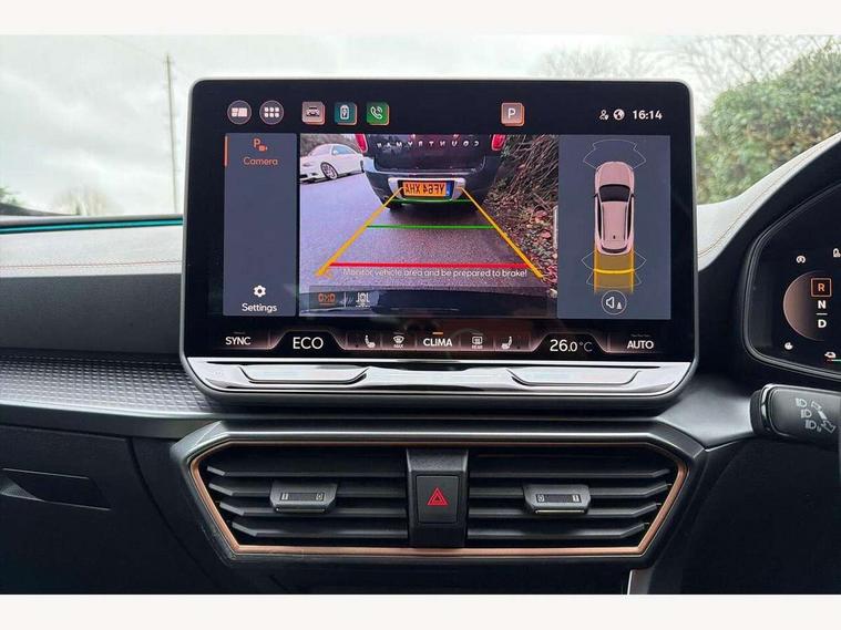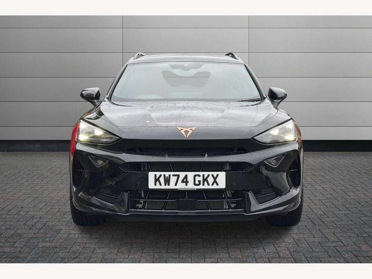 10.25" digital cockpit and configurable dashboard, Adaptive cruise control with follow-to-stop and speed limiter, Advanced driver alert system, Dynamic chassis control with driving profile selection (Comfort, Sport, CUPRA, Individual), Dynamic road sign display, Emergency steering support with turn assist, Forward collision warning with automatic braking, Front and rear parking sensors, Full link phone integration, Lane assist, Rear view camera, RPM, trip computer, outside temp gauge, instrument light brightness, low fuel warning light, lights on reminder, gearshift indicator, Service interval indicator, Speed sensitive power steering, Start/stop system with regenerative braking, Virtual pedal and electric tailgate, Voice control system, Wired Android Auto, Wireless apple carplay, Wireless phone charger, 10 amp mode 2 charging cable, 32 amp mode 3 charging cable, Adaptive chassis control with continuous operation, CUPRA sport suspension, Electronic locking differential and dynamic traction support, 2 front and 2 rear USB type C sockets, Media system with navigation, 12.9" touchscreen display, voice control, DAB, steering wheel mounted controls, Auto dimming rear view mirror, Body colour door handles, Body coloured bumpers, Dark grey wing mirror, Daytime running light with automatic headlight control and coming home feature, Door panel ambient lighting, Dynamic headlight range control, Electric front/rear windows, Electrically adjustable heated and folding door mirrors with memory function, Gloss black roof rails and window surrounds, High beam assist, LED 3rd brake light, LED front fog lamps with cornering function, LED Taillights with dynamic indicator, Matrix LED headlights with multifunction camera, Rain sensing wipers, Rear diffuser with copper simulated exhaust pipes, Rear fog lights, Rear side wing doors, Rear wash/wipe, Tinted rear windows, Welcome lights (within exterior mirror housing), 12V socket, 2 front and 2 rear reading lights, 3 seat bench in 2nd row, 60/40 split rear bench seat with armrest and mechanical seat release, Black headlining, Black interior roof lining, Cupra sports pedals, Dust/pollen filter, Electrically adjustable front seats with lumbar support and memory function, Front and rear head restraints, Front centre armrest, Heated front seats, Heated supersports multifunction leather steering wheel with satellite buttons and gear shift paddles, Height/reach adjust steering wheel, Illuminated aluminium doorsteps, Illuminated interior front door sills, Illuminated sunvisor with mirror, Isofix, Leather dashboard, door insert and side trim panel, LED smart wraparound lighting, PVC/Dinamica microfiber upholstery + bucket seats, Satellite steering wheel, Single front passenger seat, Storage pockets on rear of front seats, Three zone climate control with control panel in rear, 3 point seatbelts on all rear seats, ABS, Brake control system - ESC and brake booster, Child proof door locks, Driver and front passenger airbags with front passenger airbag de-activation, Electronic parking brake, Front and rear disc brakes, Front side curtain airbags, Hill hold control, Public e-call, Seat belt reminder for front and rear seats, Tyre pressure monitoring system, Anti theft alarm system, KESSY Advanced - Keyless start, keyless entry with SAFELOCK, Locking wheel bolts, Copper and aluminium interior detailing, 19" Sandstorm machined sport black and silver alloy wheels, Breakdown and tool kit,