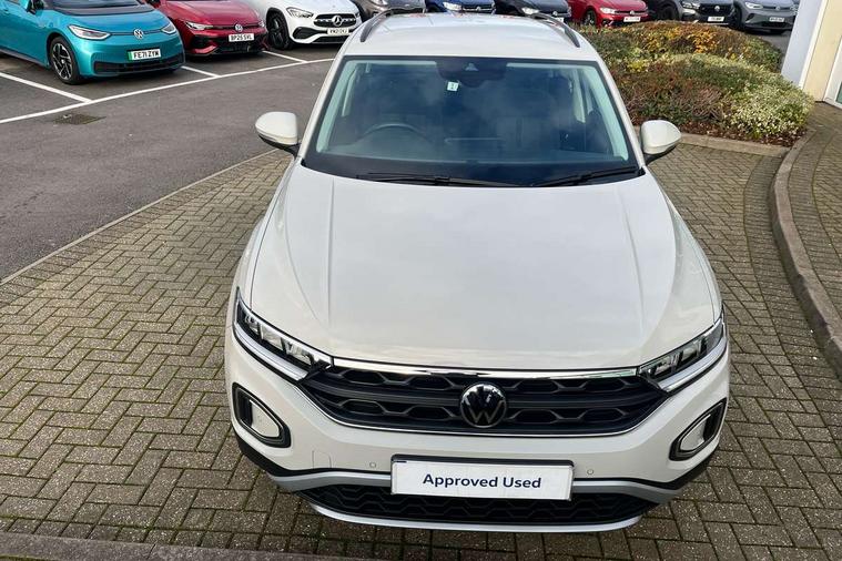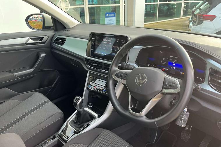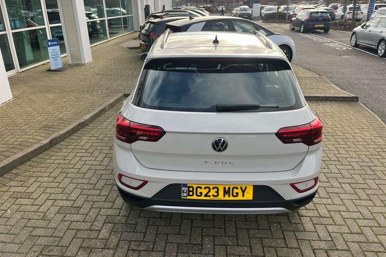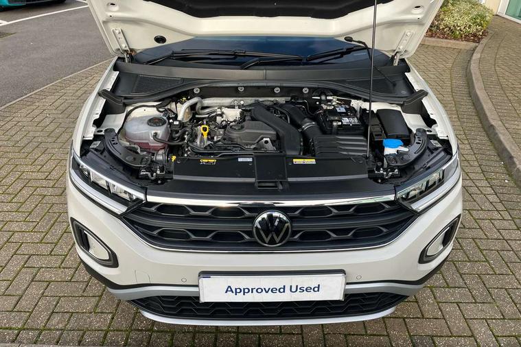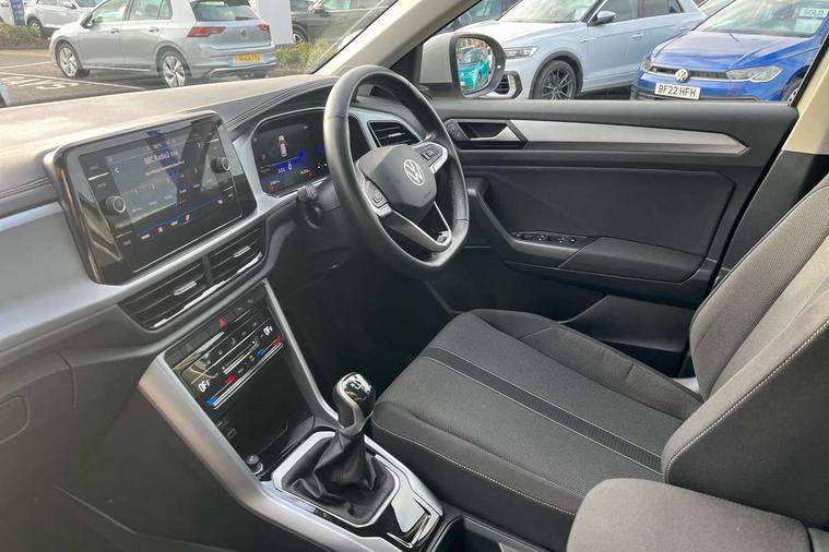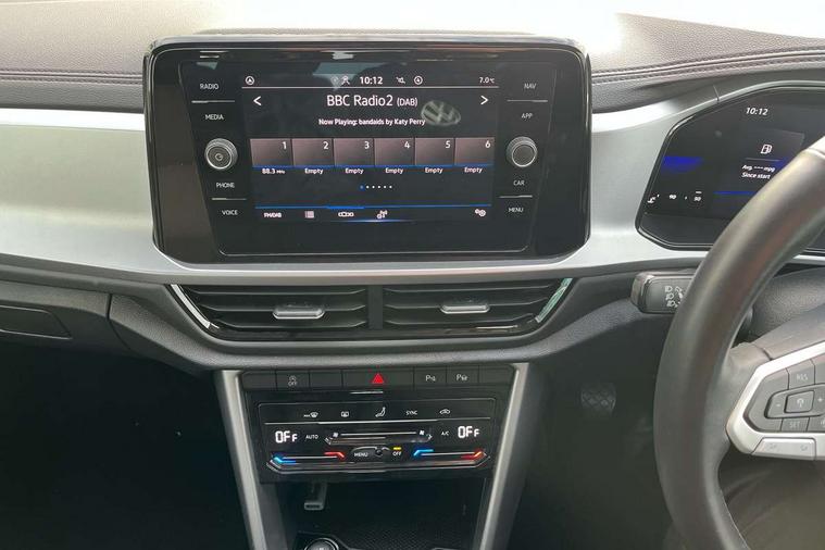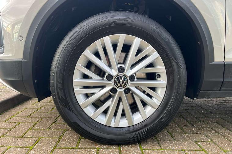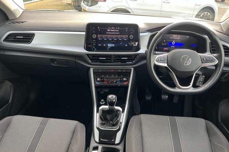 Bluetooth mobile phone interface, Driver alert system with fatigue detection, Driver tips and journey analysis, Emergency call service, Lane keeping system Lane Assist, Modified key software - reduce switch off time for key status change to Long no motion, Online services, Park assist including front and rear parking sensors, Power assisted speed sensitive steering, Service interval indicator, Tailgate/trunk lid release from outside, Think blue trainer driver tips and journey analysis, Warning sound and light for front seatbelts unfastened, Wireless app connect, Battery regeneration during braking, Front shock absorption, Rear shock absorption chassis with increased ride height, Start/stop function with battery regeneration, DAB Digital radio, Diversity antenna for FM reception, Front and rear 6 speakers, Music playback - MP3, WMA and AAC files, Premium USB cable in choice of either Apple or Android smartphone compatibility, SD card slot, Simultaneous pairing of 2 compatible mobile devices, Title and cover art display, We Connect and We Connect Plus functionality, 3rd brake light, Auto dimming interior rear view mirror, Automatic hazard lights activation under emergency braking, Automatic headlight control with LED separate daytime running lights with coming/leaving home function, Black roof rails, Body coloured bumpers and radiator grille with chrome trim and front fog lamps with chrome bezel, Body coloured exterior mirror housings and door handles, Extended roof spoiler, Exterior mirrors aspherical on driver side, convex on front passenger side, External USB type C socket and charging sockets, Front windscreen wiper with intermittent wipe and 4 position delay, Heated rear window, LED Headlights, LED rear combination lamps, LED rear number plate lights, LED tail lamp rear comination lamps, Power windows with comfort operation and circuit breaker, Rain sensor, Rear exhaust tailpipe, Rear fog light on one side and reversing lights on both sides, Rear side wing doors, Rear wash/wipe with intermittent wipe setting, Remote electrically foldable door mirrors, puddle lights and reverse activated passenger's door mirror, 12V power socket in centre console, 3 rear head restraints, 3 seat bench in 2nd row, 4 load lashing points in luggage compartment, Air care climatronic air conditoning system with active combination filter and 2-zone temperature control, Ambient lighting with mirror logo projection, Cloth upholstery, Door and side trim panel in cloth, Drawer under drivers seat, Driver/front passenger seat height adjustment, Front centre armrest, Front comfort sports seats, Front cupholders x 2, Front reading light, Instrument lighting, white adjustable panel illumination, Interior light delay, Isofix child seat preparation, Leather gearshift handle, Load-through provision with cup holder when folded down ('Unsplit rear seat bench, split folding backrest, with centre armrest), Luggage compartment lighting, Lumbar support for driver's and front passengers seat, Non-folding front passenger seat backrest, Single front passenger seat, Storage compartment in left and right luggage area, Storage compartment in rear doors, Storage compartments in driver and front passenger doors, Sunvisors with illuminated vanity mirrors, Variable boot floor, height adjustable and removable, Driver assistance pack without proactive passenger protection - T-Roc, 3 point height adj front seatbelts + pretensioners, 3 point seatbelts in outer rear with ECE label, ABS, Child locks on rear doors, Driver and front passenger airbag with front passenger airbag deactivation, Driver and front passenger safety-optimised head restraints, Drivers seatbelt reminder, Electronic parking brake, Electronic Stability Control (ESC) inc EDL (Electronic Differential Lock) and ASR (Traction Control), Front and rear passengers curtain airbag system including front side airbags, Front assist with city emergency braking and pedestrian monitoring, Front disc brakes, Front seat side impact airbags, Hill start assist, Predictive pedestrian protection, Rear disc brakes, Single tone horn, Tyre pressure loss indicator, Volkswagen roadside assistance, Alarm with interior protection, Anti-theft alarm system with interior monitoring, backup horn, and towing protection, Remote central locking with SAFELOCK, radio remote control with 2 remote control folding keys, Pewter matt decorative inserts for intrument panel, centre console and door panels at the front, Trims for alloy wheels,