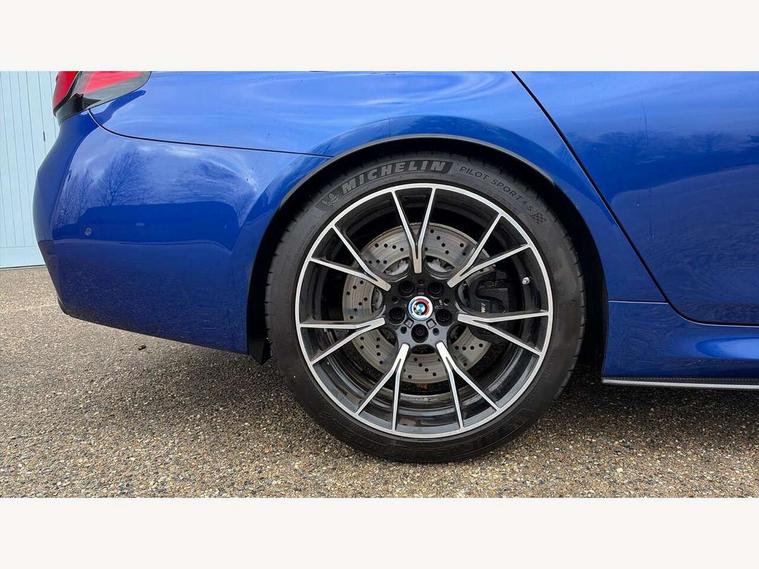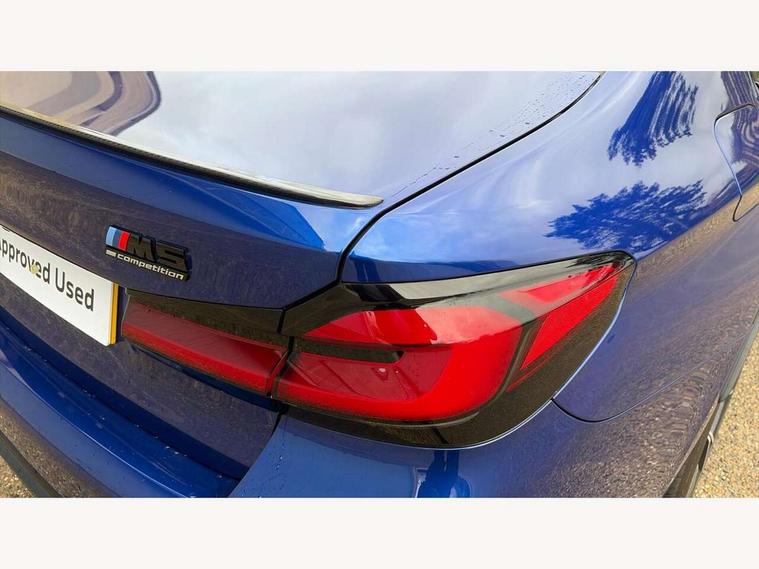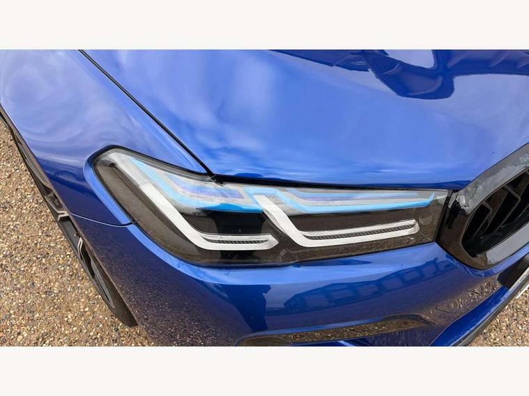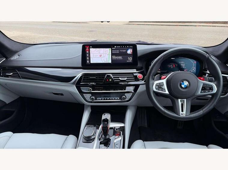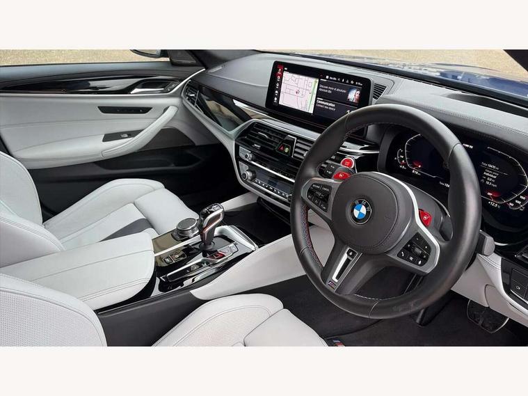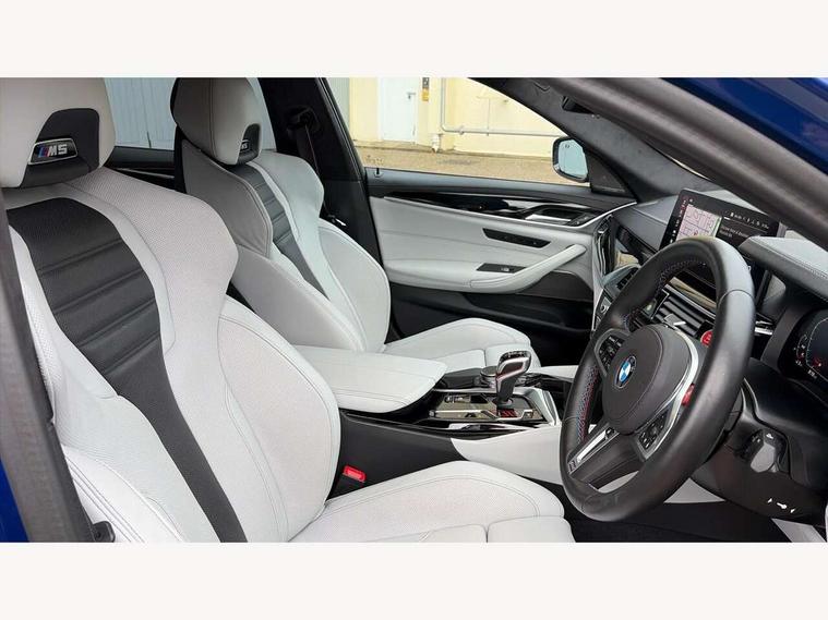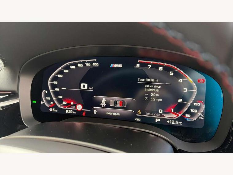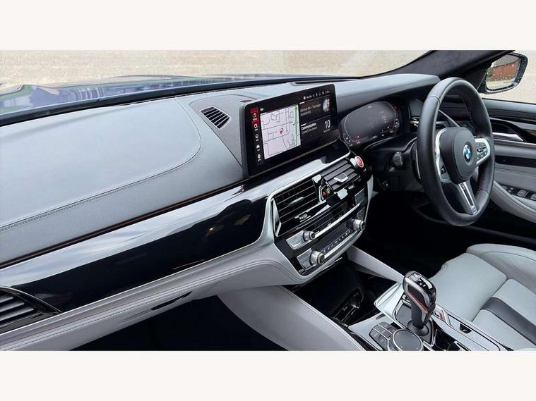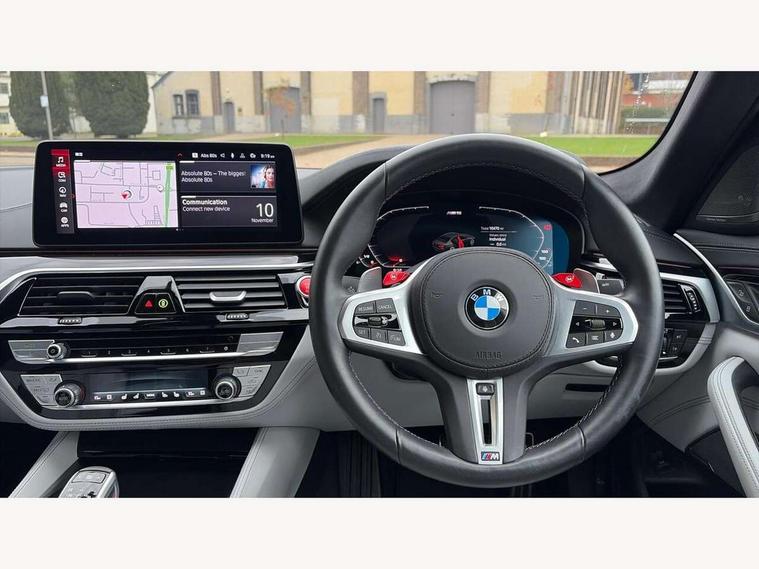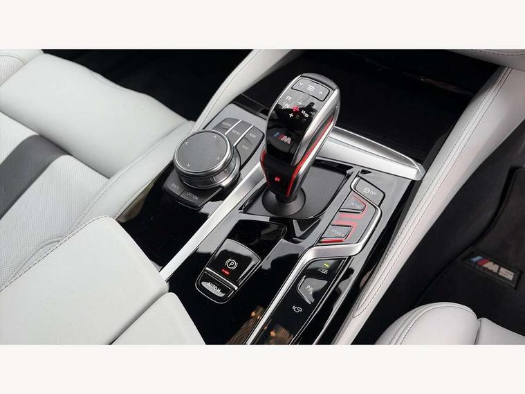 32GB hard disc drive (HDD) memory, Active Guard, BMW ConnectedDrive online services, BMW Drive recorder, BMW gesture control, BMW Head up display, BMW legal emergency call, BMW Live Cockpit Professional sat nav system with 12.3" instrument display and high resolution control display, BMW Teleservices, Brake force display, Comfort access system with smart opener, Electric boot lid - electrically opening/closing rear tailgate, Enhanced bluetooth with wireless charging, iDrive touch controller with shortcut buttons, M Servotronic steering, Oil sensor for level and grade, On board computer (OBC) includes average speed, fuel consumption and range, journey computer, outside temperature display, personal profile functions, On-board diagnosis - OBD, Powered by Operating System 7.0, Service interval indicator, Start/stop button in red, Wi-Fi hotspot, Adaptive suspension with dynamic damping control, Catalytic converter, Double wishbone front axle, Eight speed M Steptronic sport transmission with drivelogic and gearshift paddle switches on steering wheel includes launch control, Engine cover with M designation, High precision direct injection, Integral rear axle, Petrol Particulate Filter, Rear biased M specific xDrive setup, VALVETRONIC with Double VANOS, DAB tuner, Favourite buttons, All round anti-corrosion system, Auto dimming door mirrors, Black exhaust tailpipes, BMW Individual high gloss shadow line includes exterior mirror frame, window frame surround, B pillar finish, air breather in high gloss black, BMW individual lights shadow line, Body coloured bumpers, Body coloured door handles inserts, Carbon fibre roof, Door handle illumination, Dynamic brake lights with LED technology, Electric front and rear windows with fingertip open/close + anti-trap all round and comfort closing function, Follow me home headlight function, Heated windscreen washer jets, High beam assistant, High level LED brake light, Illuminated door sill finishers with M5 designation, Interior rear view electrochromatic mirror with automatic anti dazzle function, LED daytime running lights, M rear spoiler, M specific electrically adjustable/foldable/heated exterior mirrors with integrated direction indicators, M Sport exhaust system, Rain sensor including auto headlights activation, Rear boot, Rear side wing doors, Sun protection glazing, 12V power sockets 2 x rear, 1 x luggage compartment (additional 1 X double USB adaptor with 2A charging current), 3 seat bench in 2nd row, 4 zone control automatic air conditioning, Ambient interior lighting with 11 pre-defined selectable light designs including 6 colours, Armrest - front and rear integrated door trim, centre console includes storage compartment, rear centre includes 2 cupholders, Battery in luggage compartment with jump start facility in engine bay, Black velour front and rear floor mats with M piping, Child seat ISOFIX attachment with rear outer seats includes top tether, Cup holders (2 front and 2 rear), Driver and front passenger lumbar support, Electric seat adjustment with memory, Front and rear footwell lights, Front and rear reading lights, Headrests for all seats, Height and length electric adjustment steering column, Lockable glove compartment with light, M leather steering wheel, M multifunctional sport seats driver and front passenger with comfort electric height adjust headrests and illuminated M5 logo headrests, Multifunction controls for leather steering wheel, Single front passenger seat, Through loading system with 40/20/40 split folding rear seat, BMW Individual high gloss shadow line with extended contents pack - M5, Connected package professional - M5, Parking assistant plus pack - M5, Airbags - driver/front passenger, rear and side, first and second row seats head airbags, front passenger seat airbag deactivation, Anti-lock braking system (ABS), Automatic Stability Control (ASC), Brake assist function, Brake energy regeneration, Child locks on rear doors, Cornering brake control (CBC), Crash sensor activating central locking release, hazard warning lights, fuel cut off and interior lighting, Deformation zones - front and rear with door reinforcements and bumpers up to 2.5 mph, DSC - Dynamic Stability Control, Dynamic brake control, Dynamic Traction Control - DTC, Electromechanical parking brake with automatic drive away release and auto hold function, Electronic brake force distribution, Impact-dependent airbag system, M Sport seatbelts, Motor Slip Regulation (MSR) - Engine Drag Torque Control, Seat belts front inertia reel with pyrotechnical belt latch tensioner, belt force limiter and belt restrainer, Side impact protection, Three inertia reel rear seatbelts, Two tone horn, Tyre pressure indicator, Warning triangle and first aid kit, Alarm system (Thatcham 1) with remote control and electronic engine immobiliser, Locking wheel bolts, Galvanic embellisher for controls, Tyre repair kit,