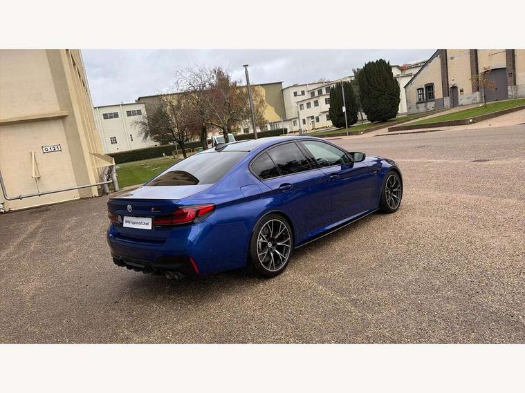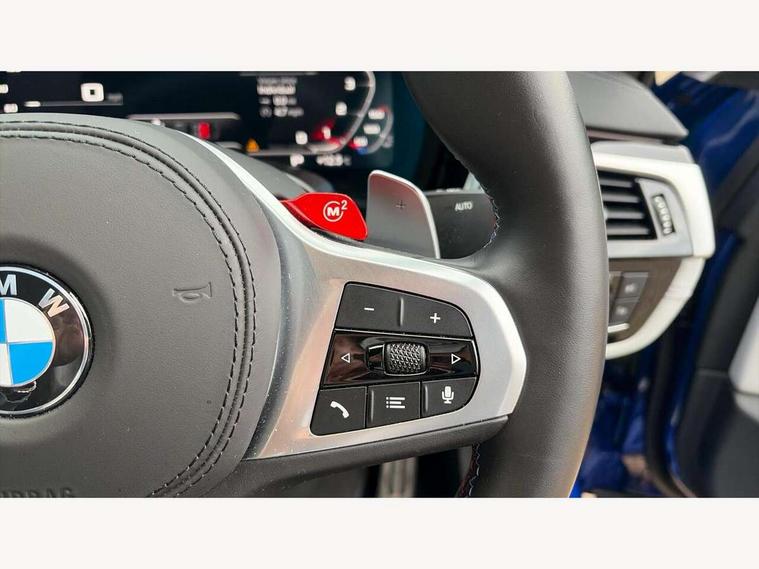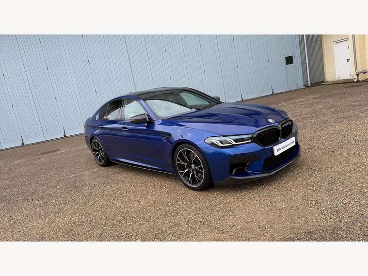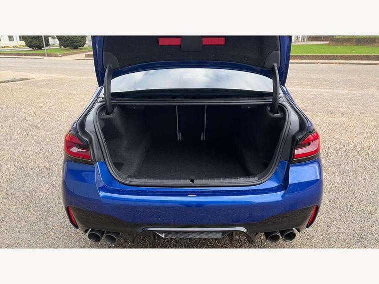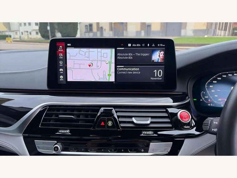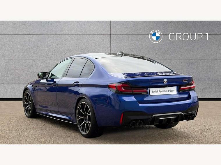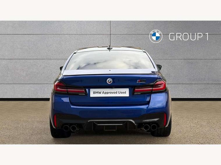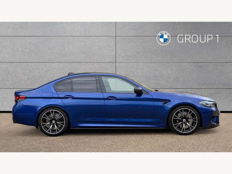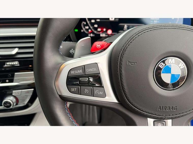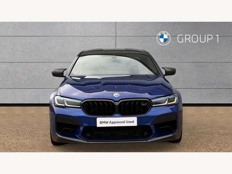 32GB hard disc drive (HDD) memory, Active Guard, BMW ConnectedDrive online services, BMW Drive recorder, BMW gesture control, BMW Head up display, BMW legal emergency call, BMW Live Cockpit Professional sat nav system with 12.3" instrument display and high resolution control display, BMW Teleservices, Brake force display, Comfort access system with smart opener, Electric boot lid - electrically opening/closing rear tailgate, Enhanced bluetooth with wireless charging, iDrive touch controller with shortcut buttons, M Servotronic steering, Oil sensor for level and grade, On board computer (OBC) includes average speed, fuel consumption and range, journey computer, outside temperature display, personal profile functions, On-board diagnosis - OBD, Powered by Operating System 7.0, Service interval indicator, Start/stop button in red, Wi-Fi hotspot, Adaptive suspension with dynamic damping control, Catalytic converter, Double wishbone front axle, Eight speed M Steptronic sport transmission with drivelogic and gearshift paddle switches on steering wheel includes launch control, Engine cover with M designation, High precision direct injection, Integral rear axle, Petrol Particulate Filter, Rear biased M specific xDrive setup, VALVETRONIC with Double VANOS, DAB tuner, Favourite buttons, All round anti-corrosion system, Auto dimming door mirrors, Black exhaust tailpipes, BMW Individual high gloss shadow line includes exterior mirror frame, window frame surround, B pillar finish, air breather in high gloss black, BMW individual lights shadow line, Body coloured bumpers, Body coloured door handles inserts, Carbon fibre roof, Door handle illumination, Dynamic brake lights with LED technology, Electric front and rear windows with fingertip open/close + anti-trap all round and comfort closing function, Follow me home headlight function, Heated windscreen washer jets, High beam assistant, High level LED brake light, Illuminated door sill finishers with M5 designation, Interior rear view electrochromatic mirror with automatic anti dazzle function, LED daytime running lights, M rear spoiler, M specific electrically adjustable/foldable/heated exterior mirrors with integrated direction indicators, M Sport exhaust system, Rain sensor including auto headlights activation, Rear boot, Rear side wing doors, Sun protection glazing, 12V power sockets 2 x rear, 1 x luggage compartment (additional 1 X double USB adaptor with 2A charging current), 3 seat bench in 2nd row, 4 zone control automatic air conditioning, Ambient interior lighting with 11 pre-defined selectable light designs including 6 colours, Armrest - front and rear integrated door trim, centre console includes storage compartment, rear centre includes 2 cupholders, Battery in luggage compartment with jump start facility in engine bay, Black velour front and rear floor mats with M piping, Child seat ISOFIX attachment with rear outer seats includes top tether, Cup holders (2 front and 2 rear), Driver and front passenger lumbar support, Electric seat adjustment with memory, Front and rear footwell lights, Front and rear reading lights, Headrests for all seats, Height and length electric adjustment steering column, Lockable glove compartment with light, M leather steering wheel, M multifunctional sport seats driver and front passenger with comfort electric height adjust headrests and illuminated M5 logo headrests, Multifunction controls for leather steering wheel, Single front passenger seat, Through loading system with 40/20/40 split folding rear seat, BMW Individual high gloss shadow line with extended contents pack - M5, Connected package professional - M5, Parking assistant plus pack - M5, Airbags - driver/front passenger, rear and side, first and second row seats head airbags, front passenger seat airbag deactivation, Anti-lock braking system (ABS), Automatic Stability Control (ASC), Brake assist function, Brake energy regeneration, Child locks on rear doors, Cornering brake control (CBC), Crash sensor activating central locking release, hazard warning lights, fuel cut off and interior lighting, Deformation zones - front and rear with door reinforcements and bumpers up to 2.5 mph, DSC - Dynamic Stability Control, Dynamic brake control, Dynamic Traction Control - DTC, Electromechanical parking brake with automatic drive away release and auto hold function, Electronic brake force distribution, Impact-dependent airbag system, M Sport seatbelts, Motor Slip Regulation (MSR) - Engine Drag Torque Control, Seat belts front inertia reel with pyrotechnical belt latch tensioner, belt force limiter and belt restrainer, Side impact protection, Three inertia reel rear seatbelts, Two tone horn, Tyre pressure indicator, Warning triangle and first aid kit, Alarm system (Thatcham 1) with remote control and electronic engine immobiliser, Locking wheel bolts, Galvanic embellisher for controls, Tyre repair kit,