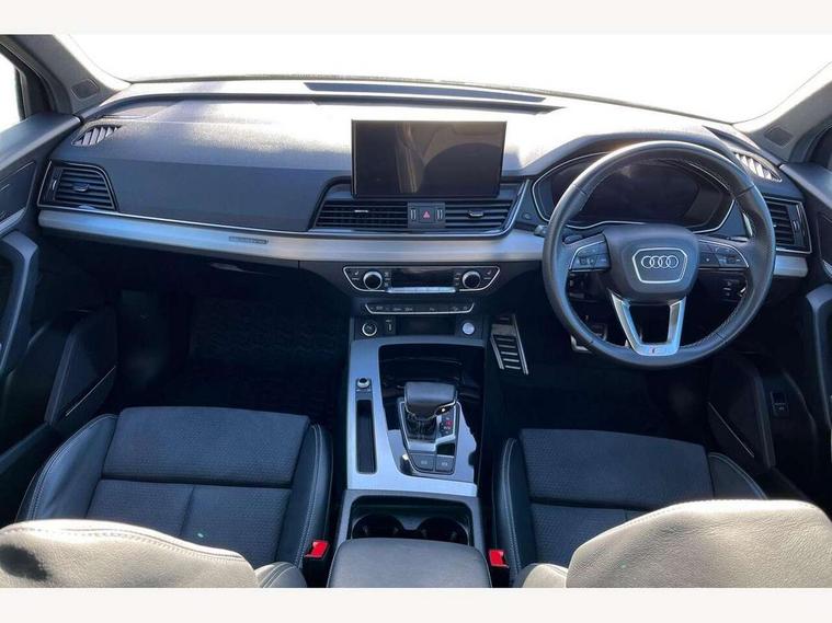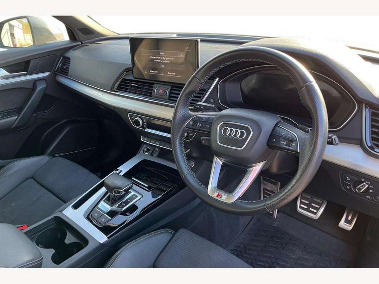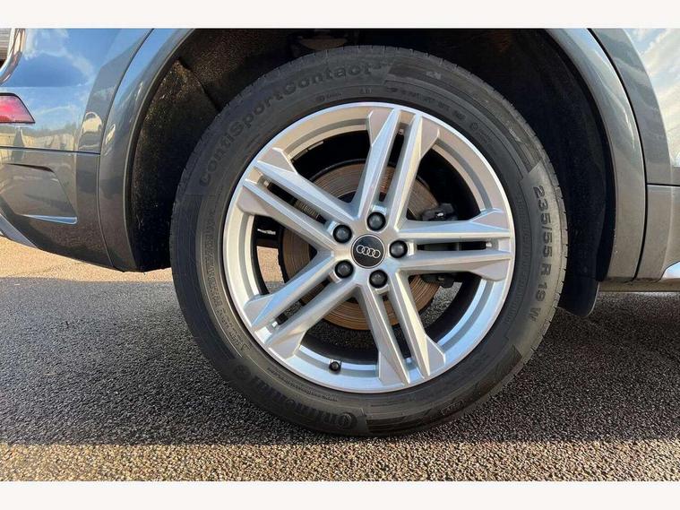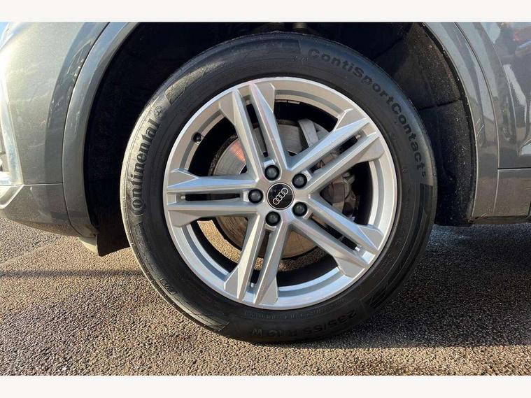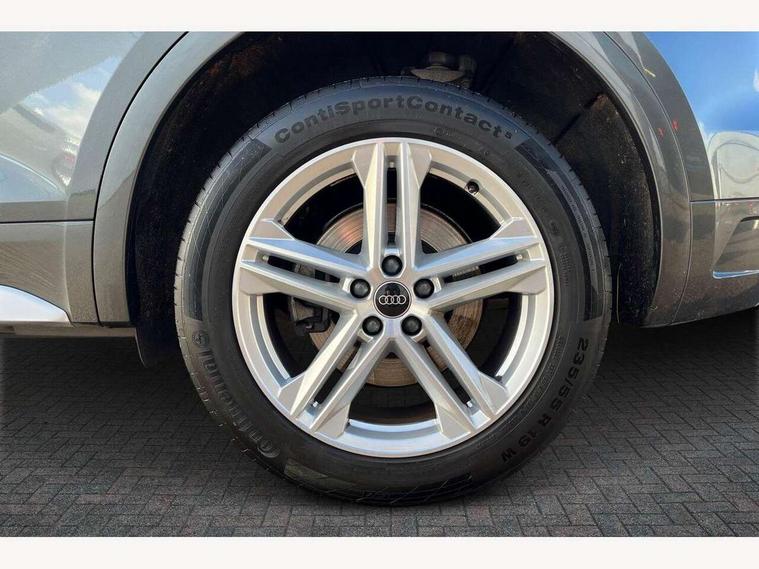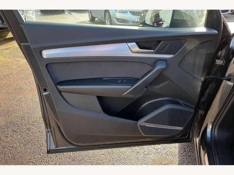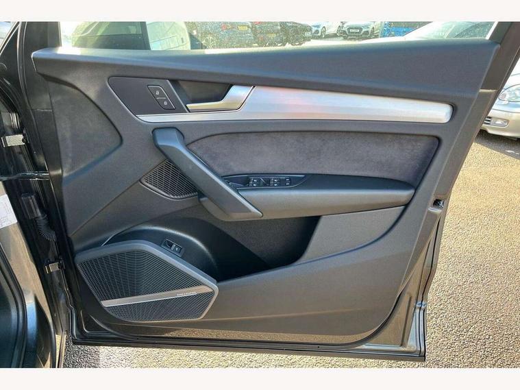 Acoustic front and rear parking sensor, Audi connect safety and service (e-call), Audi drive select, Audi virtual cockpit plus with 12.3" screen and three different layout designs, Audi wireless smartphone interface, Automatic start-stop system with coasting functionality and efficiency programme, Bluetooth interface, Camera based traffic sign recognition, Electro - mechanical power assisted steering, Lane departure warning, MMI navigation plus with 10.1" touch screen, Power tailgate, Reversing camera, Service interval indicator, Voice control system with Audi hotword activation "Hey Audi", Diesel particulate filter, Quattro on demand, S line sports suspension, 2 x USB charging port with aux input socket, 8 loudspeakers, DAB Digital radio, 3rd brake light, Acoustic windscreen, Aluminium roof rails, Auto dimming door mirrors, Auto dimming frameless rear view mirror, Automatic headlight adjustment, Automatic headlights and windscreen wipers, Body colour bumpers, Body colour door mirrors, Body colour rear diffuser with matt aluminium silver surrounds, Body colour underbody protection, Chrome plated exhaust trims, Daytime running lights, Door sills in Selenite silver, Electric adjustable/heated/folding door mirrors, Front air inlet surrounds in aluminium, Front and rear electric windows, Front radiator grille in honeycomb design, LED headlights and LED tail lights, Loading edge protection in stainless steel, Lower bumpers painted in contrast Manhattan grey, Rear chrome trim strip below lights, Rear privacy glass and rear side windows, Rear side wing doors, Rear wiper, Roof bars, S Line badges on the front wing panels, S Line front and rear bumpers, S Line rear spoiler, S Line side skirts, 3 rear headrests, 3 spoke leather multifunction steering wheel with S badging perforated leather grips, Black cloth headlining, Comfort front centre armrest, Contrast stitching on seats, steering wheel and gear lever gaiter, Deluxe 3 zone electronic climate control, Front head restraints, Front sport seats with S embossed logo, Front/rear floor mats, Gear lever in black leather, Heated front seats, Height/reach adjustable steering column, Illuminated door sill trims with S logo, Luggage compartment cover, Manual seat adjustment with 4-way electric lumbar support, Single front passenger seat, Stainless steel pedals, Sunvisors with vanity mirrors, High gloss pack - Q5, LED interior light pack - Q5, 3 point seatbelts on all seats, 6 airbags - Driver, front passenger, curtain and side airbags, Attention and drowsiness assist, Electrically operated child locks on rear doors, Electromechanical parking brake, Electronic stabilisation control including ABS, ASR and EDL, First aid kit with warning triangle and vests, Front passenger airbag deactivation, Hill descent control, Hill hold assist, ISOFIX child seat mounting for front passenger seat and ISOFIX child seat mounting with Top Tether for outer rear seats, Multi collision brake assist, Pop-up bonnet for pedestrian protection, Pre sense city, Seatbelt monitoring, Tyre pressure warning, Anti theft alarm, Anti-theft wheel bolts, Remote central locking, Remote control key with SAFELOCK and keyless go, Air vents inserts and centre console in gloss black, Matt brushed aluminium inlays, Tool kit, Tyre repair kit,