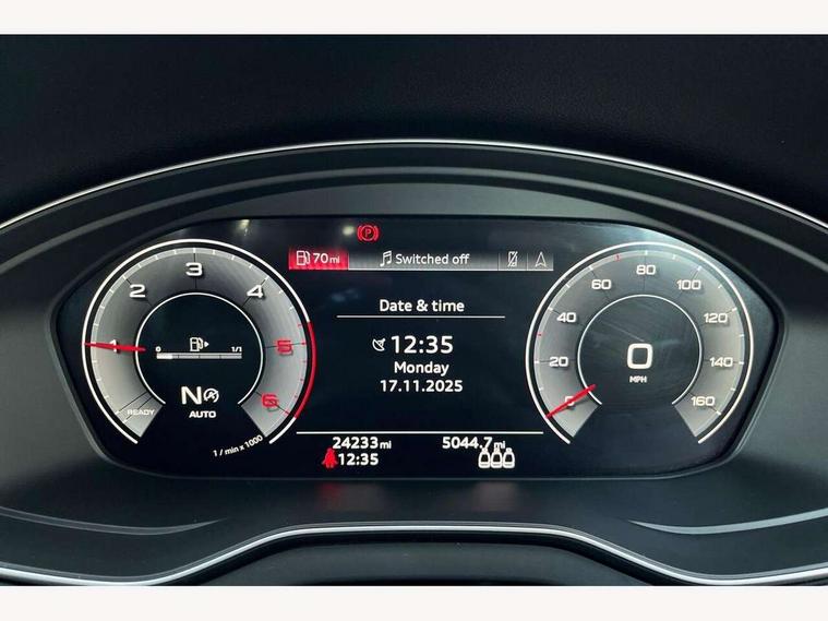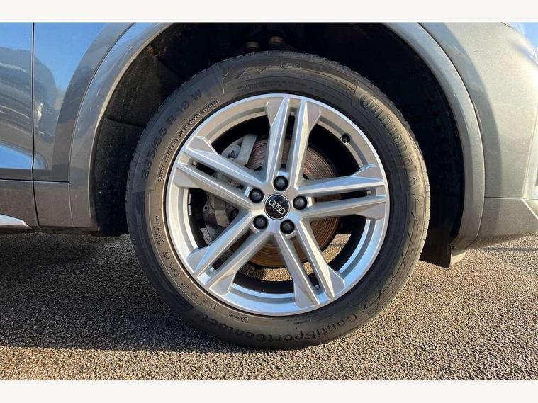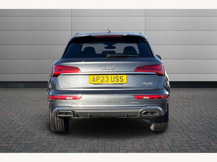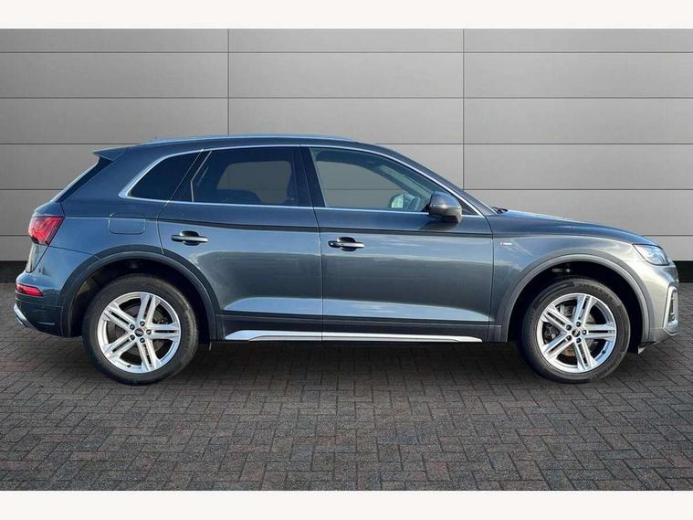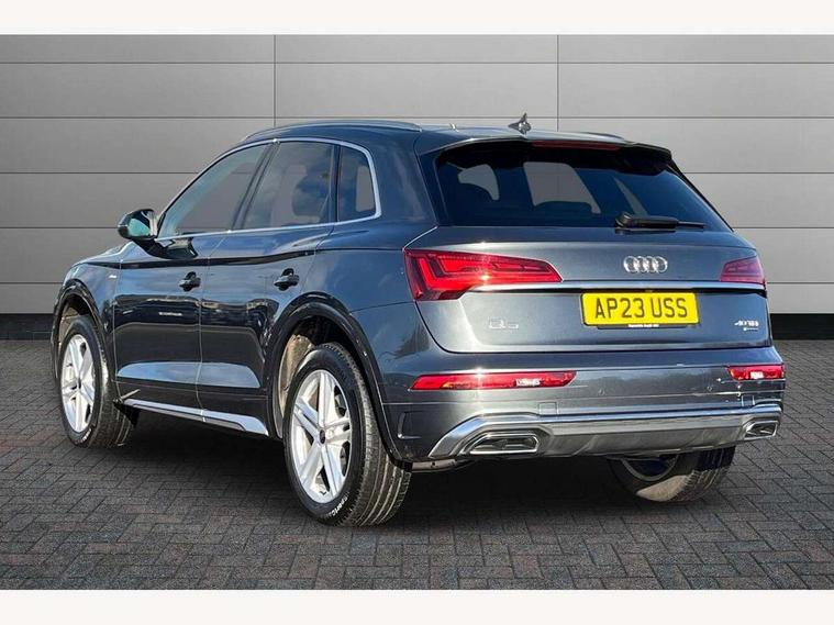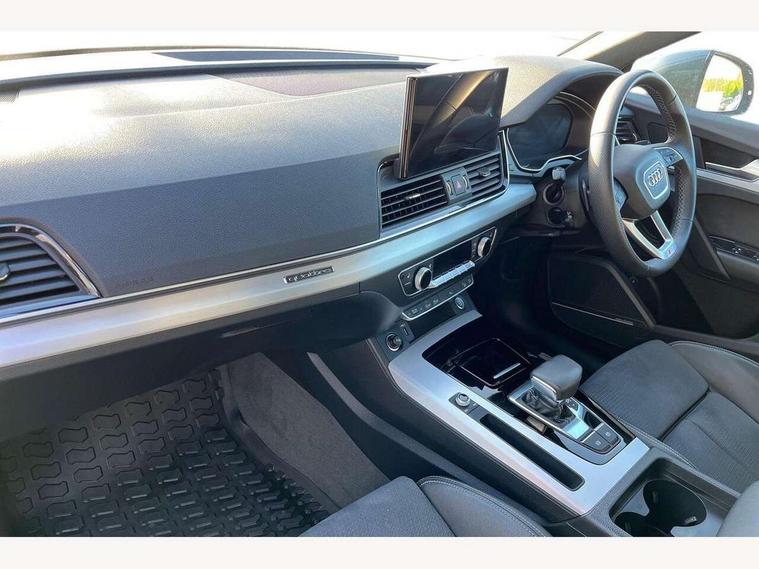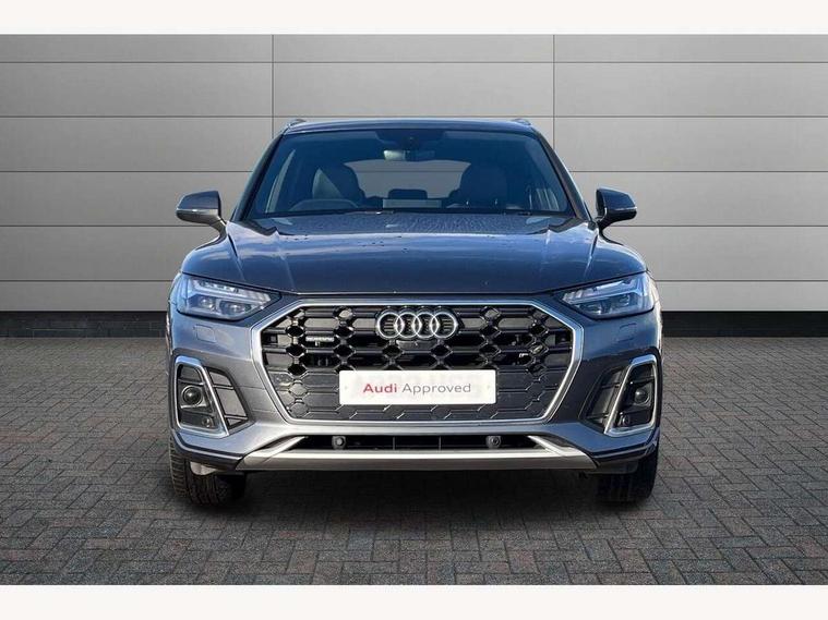 Acoustic front and rear parking sensor, Audi connect safety and service (e-call), Audi drive select, Audi virtual cockpit plus with 12.3" screen and three different layout designs, Audi wireless smartphone interface, Automatic start-stop system with coasting functionality and efficiency programme, Bluetooth interface, Camera based traffic sign recognition, Electro - mechanical power assisted steering, Lane departure warning, MMI navigation plus with 10.1" touch screen, Power tailgate, Reversing camera, Service interval indicator, Voice control system with Audi hotword activation "Hey Audi", Diesel particulate filter, Quattro on demand, S line sports suspension, 2 x USB charging port with aux input socket, 8 loudspeakers, DAB Digital radio, 3rd brake light, Acoustic windscreen, Aluminium roof rails, Auto dimming door mirrors, Auto dimming frameless rear view mirror, Automatic headlight adjustment, Automatic headlights and windscreen wipers, Body colour bumpers, Body colour door mirrors, Body colour rear diffuser with matt aluminium silver surrounds, Body colour underbody protection, Chrome plated exhaust trims, Daytime running lights, Door sills in Selenite silver, Electric adjustable/heated/folding door mirrors, Front air inlet surrounds in aluminium, Front and rear electric windows, Front radiator grille in honeycomb design, LED headlights and LED tail lights, Loading edge protection in stainless steel, Lower bumpers painted in contrast Manhattan grey, Rear chrome trim strip below lights, Rear privacy glass and rear side windows, Rear side wing doors, Rear wiper, Roof bars, S Line badges on the front wing panels, S Line front and rear bumpers, S Line rear spoiler, S Line side skirts, 3 rear headrests, 3 spoke leather multifunction steering wheel with S badging perforated leather grips, Black cloth headlining, Comfort front centre armrest, Contrast stitching on seats, steering wheel and gear lever gaiter, Deluxe 3 zone electronic climate control, Front head restraints, Front sport seats with S embossed logo, Front/rear floor mats, Gear lever in black leather, Heated front seats, Height/reach adjustable steering column, Illuminated door sill trims with S logo, Luggage compartment cover, Manual seat adjustment with 4-way electric lumbar support, Single front passenger seat, Stainless steel pedals, Sunvisors with vanity mirrors, High gloss pack - Q5, LED interior light pack - Q5, 3 point seatbelts on all seats, 6 airbags - Driver, front passenger, curtain and side airbags, Attention and drowsiness assist, Electrically operated child locks on rear doors, Electromechanical parking brake, Electronic stabilisation control including ABS, ASR and EDL, First aid kit with warning triangle and vests, Front passenger airbag deactivation, Hill descent control, Hill hold assist, ISOFIX child seat mounting for front passenger seat and ISOFIX child seat mounting with Top Tether for outer rear seats, Multi collision brake assist, Pop-up bonnet for pedestrian protection, Pre sense city, Seatbelt monitoring, Tyre pressure warning, Anti theft alarm, Anti-theft wheel bolts, Remote central locking, Remote control key with SAFELOCK and keyless go, Air vents inserts and centre console in gloss black, Matt brushed aluminium inlays, Tool kit, Tyre repair kit,