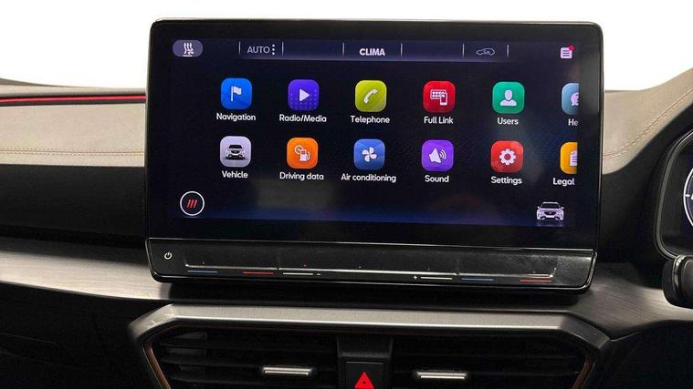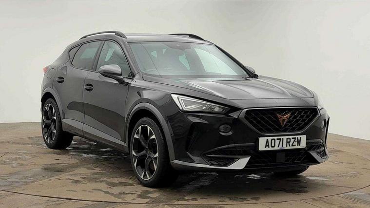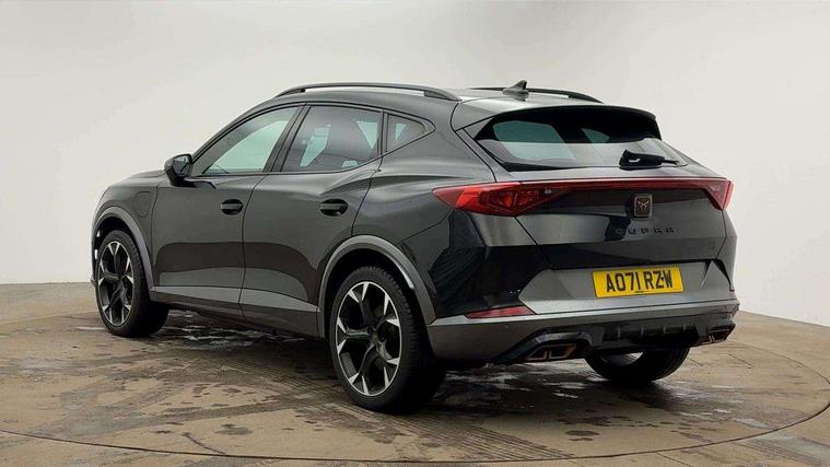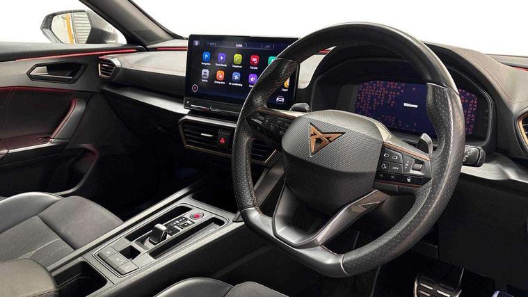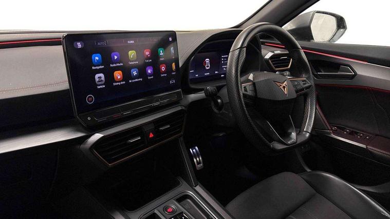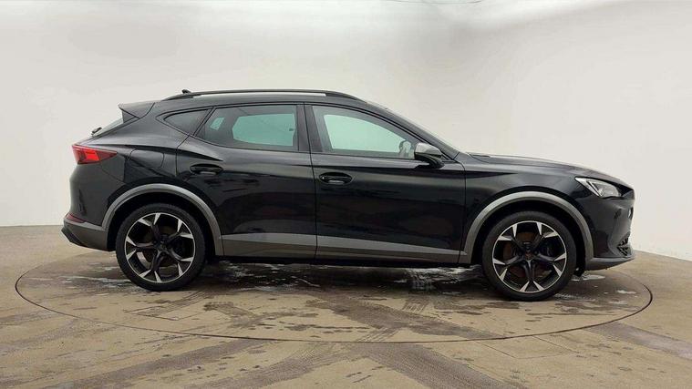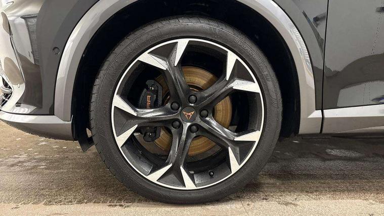 Digital cockpit and configurable dashboard, Driver alert system, Dynamic chassis control with driving profile selection (Comfort, Sport, CUPRA, Individual), Forward collision warning with automatic braking, Lane assist, Park assist (inc front/rear parking sensors), Predictive adaptive cruise control with speed limiter, Rear view camera, RPM, trip computer, outside temp gauge, instrument light brightness, low fuel warning light, lights on reminder, gearshift indicator, Service interval indicator, Speed sensitive power steering, Start/stop system with regenerative braking, Virtual pedal and electric tailgate, Wireless apple carplay, Wireless phone charger, 10 amp mode 2 charging cable, 16 amp mode 3 charging cable, 3.6 kw On-board charger, Electronic locking differential and dynamic traction support, Sports suspension with front shock absoption, 2 front and 2 rear USB type C sockets, 6 speakers, Auxiliary input socket, DAB radio, Auto dimming rear view mirror, Body colour door handles, Body coloured bumpers, Dark grey wing mirror, Daytime running light with automatic headlight control and coming home feature, Dynamic headlight range control, Electric front/rear windows, Electrically adjustable, heated and folding door mirrors, Front fog lamps with cornering function, Gloss black roof rails and window surrounds, LED Headlights, LED Taillights with dynamic indicator, Rain sensing wipers, Rear diffuser with single exhaust pipe on each side with simulated exhaust pipes, Rear wash/wipe, Sports bumpers, Tinted rear windows, Welcome lights, 12v power supply in centre console, 12V socket, 12v socket in loadspace, 2 front and 2 rear reading lights, 230V socket, 60/40 split rear bench seat with armrest and mechanical seat release, Black headlining, Cupra sports pedals, Dust/pollen filter, Front and rear head restraints, Front centre armrest, Height/reach adjust steering wheel, Illuminated interior front door sills, Illuminated sunvisor with mirror, Isofix, Leather multi function heated steering wheel with gear shift paddles, Luggage tie-down hooks, Manually adjustable height and lumbar support for front seats, PVC/Cloth upholstery with copper stitching + bucket seats, Three zone climate control with control panel in rear, Wraparound lighting, Navigation system pack - Formentor, 3 point seatbelts on all rear seats, ABS, Brake control system - ESC and brake booster, Child proof door locks, Driver and front passenger airbags with front passenger airbag de-activation, Electronic parking brake, Front and rear disc brakes, Front side curtain airbags, Hill hold control, Seat belt reminder for front and rear seats, Tyre pressure monitoring system, Anti theft alarm system, Keyless entry and start system (KESSY), Locking wheel bolts, Copper and aluminium interior detailing, 19" 'Exclusive' machined sport matte black and silver alloy wheels, Tyre repair kit,