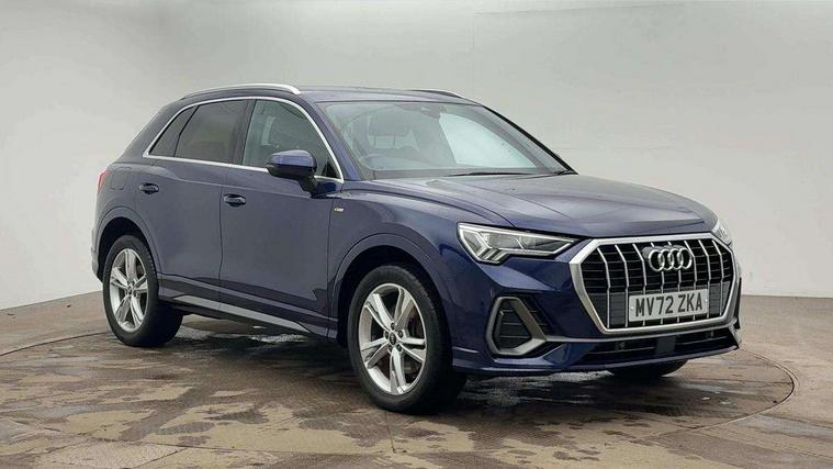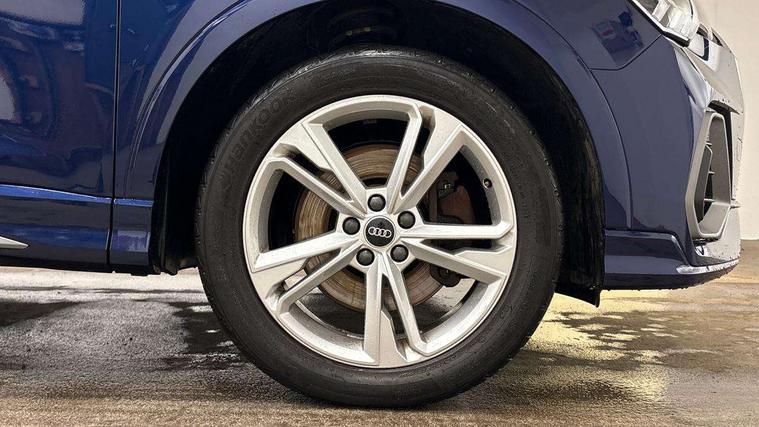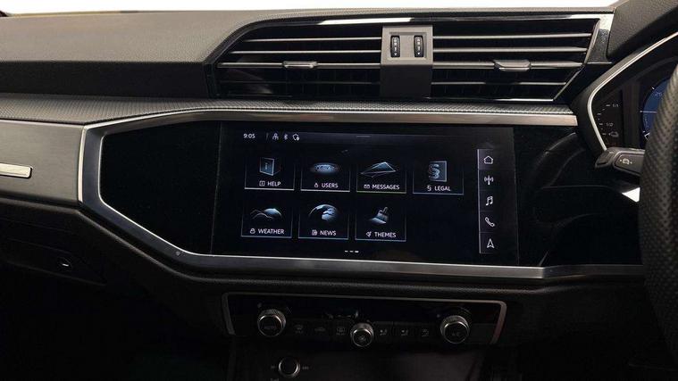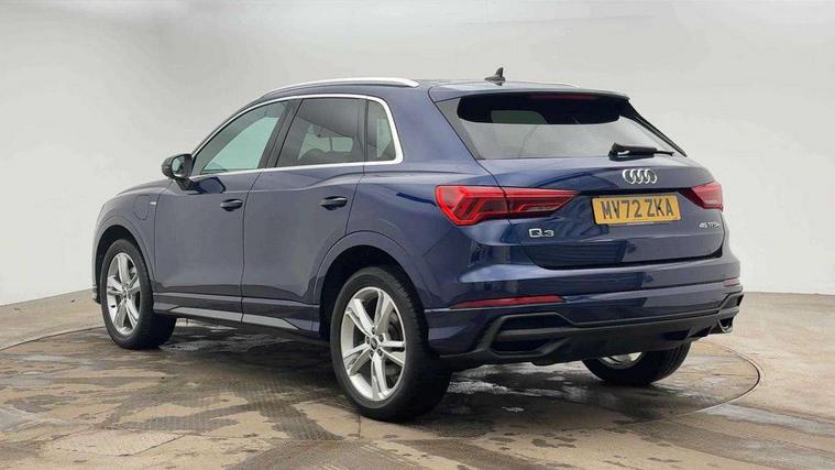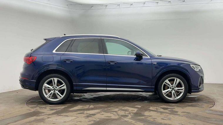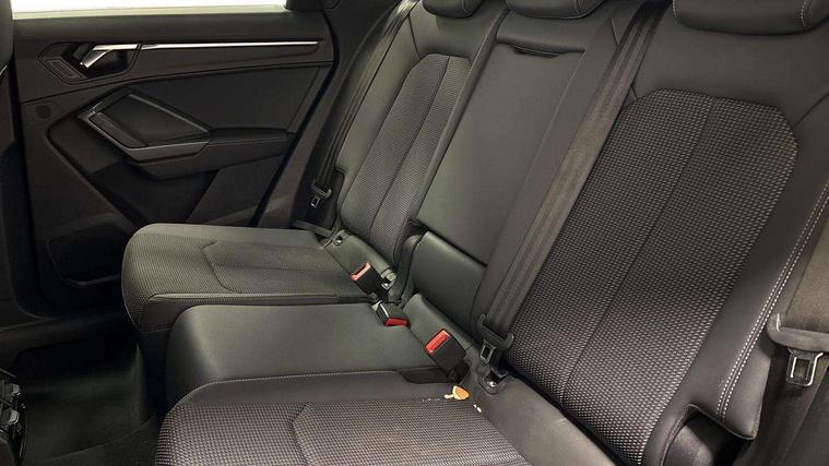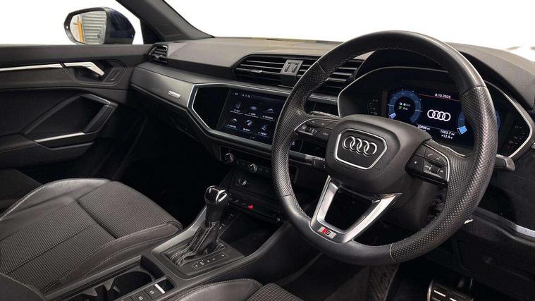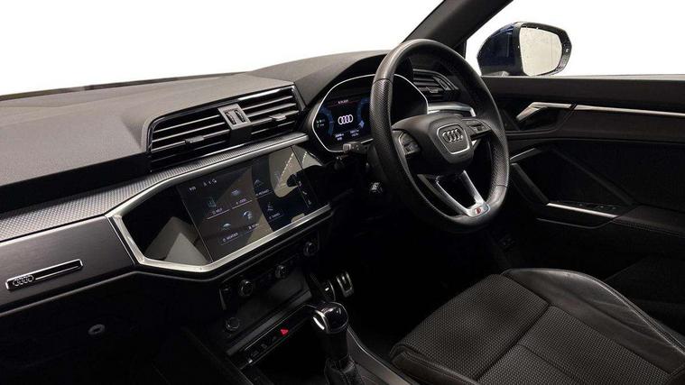 Amazon alexa Integration, Audi drive select, Audi lane departure warning, Audi Virtual Cockpit - 10.25" display, Bluetooth interface, Camera based traffic sign recognition, Legal emergency call, MMI Navigation Plus with high resolution 10.1 inch touchscreen colour display, Power operated tailgate, Progressive steering, Service interval indicator, Smartphone interface includes wireless Apple carplay/Android Auto, Start stop system with recuperation, Voice control system with natural language interaction, 3 pin 10 amp domestic charging cable, 3.6 kw On-board charger, Type 2 mode 3 32 amp charging cable, Type 2 socket for AC charging, 2 USB-C ports with charge and data functions, 6 passive loudspeakers, DAB digital radio module, Acoustic windscreen, Aluminium roof rails, Aluminium window trim, Auto dimming frameless rear view mirror, Body colour front spoiler blade, Body coloured bumpers, Electrically folding, adjustable and heated door mirrors with integrated LED side indicators and kerb view function for passenger side, Front and rear electric windows, Front fog lights, Front side air inlets in matt platinum grey, Grille vertical bars in aluminium silver/Matt, High gloss black finish B and C pillars, LED headlights with LED daytime running lights, LED rear lights, LED third brake light, Privacy glass dark tinted rear and rear-side windows (from B-pillar backwards), Rain and light sensors, Rear diffuser grille in grained matt black, Rear diffuser strip in matt titanium black, Rear side wing doors, Rear wiper, S line badges on front wings, S Line front and rear bumpers, Side skirt insert in matt Platinium grey, Titanium black radiator grille, Variable front intermittent wipers, 12V socket in rear centre console, 3 seat bench in 2nd row, 40:20:40 folding with manual adjustment for 60:40 forwards/backwards position and backrest angle, Adjustable rear seat bench/backrest with centre armrest and cupholder, Black cloth headlining, Dual zone electronic climate control, Front and rear black floor mats with contrast stitching in rock grey, Front and rear headrests, Front and rear roof module including reading lights, Front centre armrest, Glove compartment lighting, Height and reach adjustable steering wheel, Illuminated door sill trims with S logo, ISOFIX child seat mounting for front passenger with airbag deactivation and outer rear seat including top tether attachment point for outer rear seats, Luggage compartment light, Manual front seats with height adjustment, Perforated leather gearknob, Single front passenger seat, Stainless steel luggage compartment sill finisher, Stainless steel pedals, Non smoking pack - Q3, 3x3 point rear seatbelts, 6 airbags - Driver, front passenger, curtain and side windows, Audi pre-sense front with pedestrain and cyclist recognition, Electromechanical parking brake, Electronic stabilisation control including ABS, ASR and EDL, Front seatbelt reminder, Hill descent control, Hill hold assist, Manual child lock in rear doors, Pre sense basic, Seatbelt monitoring, Tyre pressure warning, Warning triangle and first aid kit, Anti theft alarm, Anti theft wheel bolts, Immobiliser, Remote central locking, Dark matt brushed aluminium inlay, Detail dashboard around MMI touch colour display in glass look, black with surround in aluminium look, Leatherette door armrest, Tool kit, Tyre repair kit,