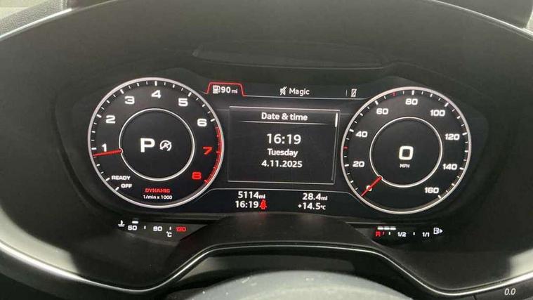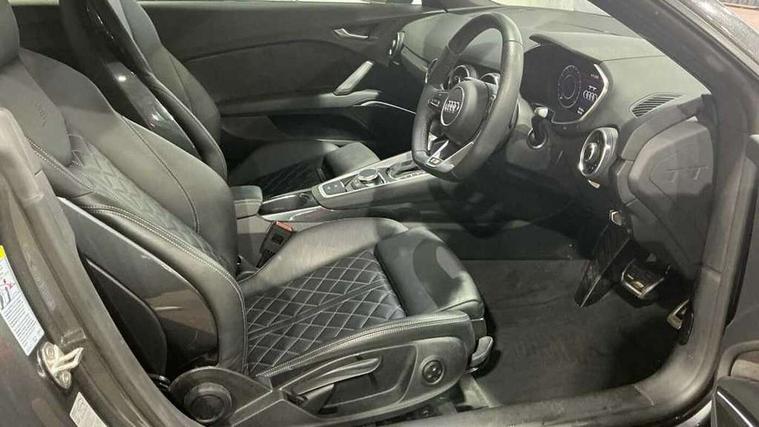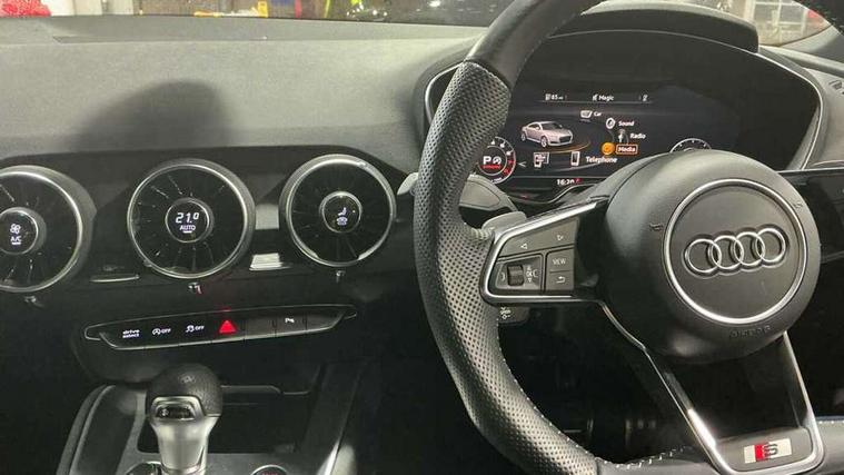 Audi drive select with 4 Pre configured modes, Audi smartphone interface, Audi virtual cockpit - 12.3" high-resolution LCD display with fully customisable instrument cluster, Cruise control + speed limiter, Emergency call service, MMI touch panel, Mobile phone preparation with bluetooth interface, Progressive power assisted steering, Service interval indicator, Start/Stop system with energy recuperation, TP memo, Sports suspension, AM/FM radio, Bluetooth audio streaming, DAB Digital radio, MMI Radio with CD player and SD/XC card slot, Auto dimming rear view mirror, Auto headlight range control, Black chrome tailpipe, Dark privacy glass from B-pillar backwards, Electric folding door mirrors, Electric front windows, Electrically adjustable and heated door mirrors with integrated LED side indicators, Front fog lights, Green tinted heat insulating glass, LED 3rd brake light, LED daytime running lights, LED headlights with LED rear lights + dynamic rear indicators, Light and rain sensors, Rear boot, Sunband for windscreen, 12V socket, 2 rear seats, 3 spoke flat bottomed high multi-function leather sport steering wheel with gearshift paddles, 4 way electric lumbar support for driver and front passenger, Black headlining, Contrasting silver stitching in steering wheel, Door sill trims, Extended aluminium look with stainless steel pedals, Front centre armrest, Front passenger seat, Front super sports seats, Heated front seats, Height/reach adjust steering wheel, Integrated head restraints, ISOFIX child seat mounting for front passenger seat with airbag deactivation, Manual adjustment of seat height, fore/aft position, seat angle, seat depth and backrest angle, Perforated leather gearknob in black, Rear head restraints, Rear top tether child seat ISOFIX attachment, Split folding rear seat, Black styling pack - TT, Non smoking pack - TT/TT RS, 3 point front seat belts, ABS, ASR traction control, Curtain airbags, Driver and front passenger airbag with front passenger airbag deactivation, EDL traction control, Electromechanical parking brake, ESP, First aid kit, Front side airbags, Head airbags, Hill hold assist, Seatbelt warning, Tyre pressure loss indicator, Warning triangle, Anti theft alarm, Anti theft wheel bolts, Immobiliser, Keyless Go, Remote central locking, Matt brushed aluminium inlays, Tool kit, Tyre repair kit,