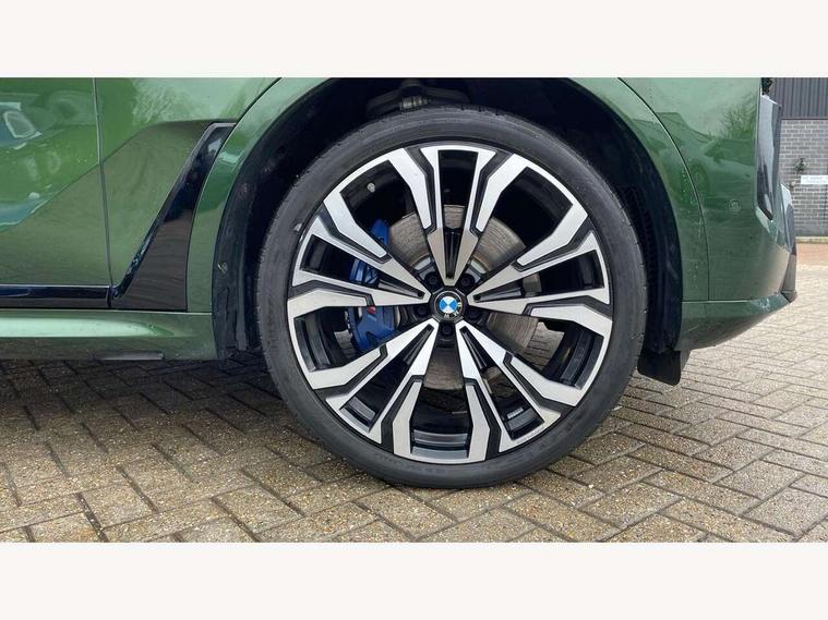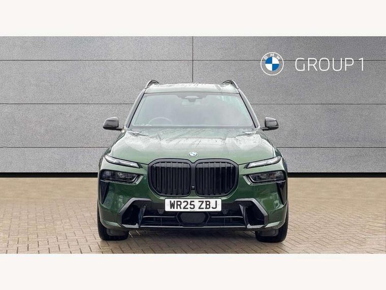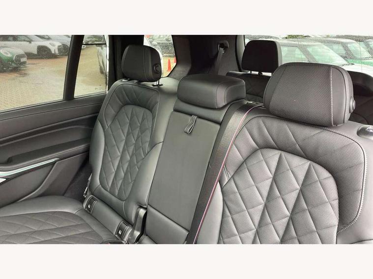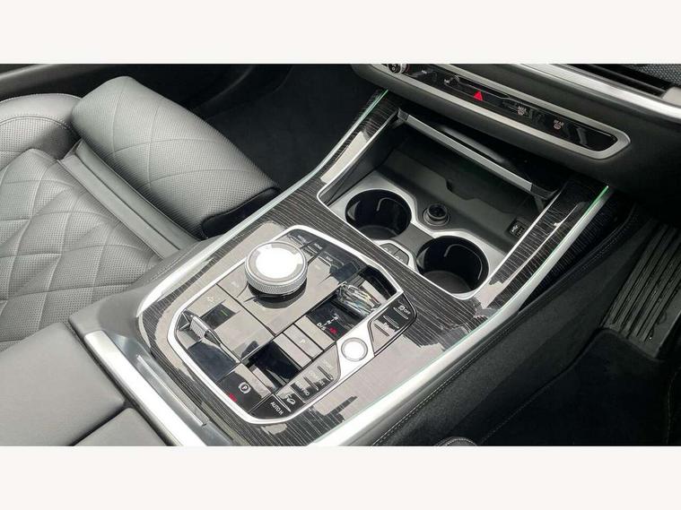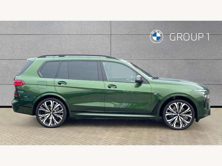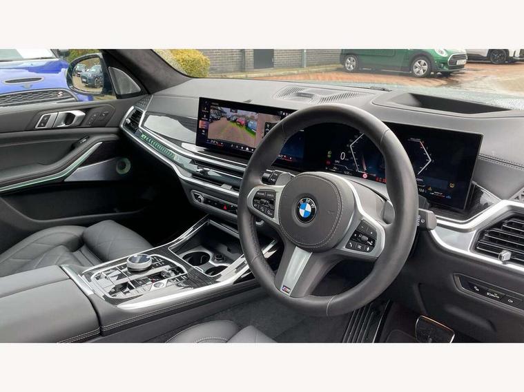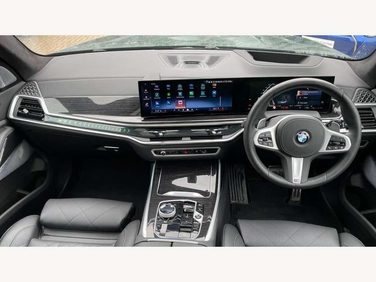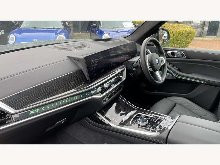 2 rear USB-C ports, Attentiveness assist, Automatic start/stop function, Automatic tailgate operation, BMW ConnectedDrive online services, BMW Drive recorder, BMW gesture control, BMW Teleservices, Brake pad wear indicator in front and rear, Condition based service, Integrated owner's handbook, Live Cockpit Professional with head up display including 12.3" instrument cluster and 14.9" central display, Parking assistant pro including reversing assistant, PDC, lateral parking aid, reversing assist camera, parking drive off monitoring, 48V Mild hybrid technology, 8 speed automatic with steptronic transmission including automatic hold function and gearshift paddles on the steering wheel, Drive experience switch with comfort mode + ECO PRO + sport mode, Permanent all wheel drive, 2x Front USB (1x USB-C, 1x USB-A), DAB radio, Personal eSim, Acoustic glazing, Adaptive air flap control bars in high gloss black, Air breather and door claddings in high gloss chrome, Body coloured wheel arches, Dynamic brake lights with LED technology, Electrically adjustable and heated aspheric folding side mirrors with auto dimming, electric fold in function, automatic parking function, Exterior and central air inlets in front bumper painted pearl chrome, Follow me home headlight function, Frameless interior mirror, Front and rear electric windows, Heated windscreen washer nozzles, High beam assist, High gloss black shadow line roof rails, High gloss black shadowline trim in side/window frame, window recess cover, window guide, B and C pillar, mirror triangle, mirror base, mirror frame, Integrated turn indicators, LED daytime running lights, LED rear lights, LED third brake light in rear spoiler, Rain sensor with automatic headlight activation and windscreen wiper control, Rear side wing doors, Sump guard front and rear painted in silver, Trailer stabilisation logic, 12V - Power sockets with 2x centre console and 1x luggage compartment, 2 seat bench in 3rd row, 2x cupholders in front, rear centre armrest and two in third row seats, 3 seat bench in 2nd row, 3 spoke M leather multifunction steering wheel, 40:20:40 split folding rear seat backrests, Ambient lighting strip in the instrument panel with illuminated, Armrest in front centre console, Compartment in front of cupholder, Driver and front passenger sunvisors with illuminated vanity mirrors and ticket holder, Electrical steering column with adjustable height and length with activation and control on the steering column, Entry sills with illuminated M inscription, Fold down flush into floor of luggage compartment 50:50, Front and rear colour co-ordinated with all standard carpet colours, Front and rear door pockets, Front and rear side armrests integrated into door trim, Front seat back pockets, Grab handles, Height adjustable front headrests, Height adjustable rear headrests, Lockable glove compartment, Nano filter, Single front passenger seat, Soft close doors, Storage tray and compartment with lid in centre console, Wireless charging tray, Additional storage compartment pack - X7, Ambient light interior pack - X7, Connected Package Professional - X7, Interior lighting pack - X7, Luggage compartment pack - X7, M aerodynamics pack - X7, M Sport pack - X7, 3 point seatbelts on all seats, front pyrotechnic belt tensioners, stopper and belt force limiters, front and outer rear seats, Acoustic protection for pedestrians, Active protection, Airbag - Front driver and passenger, side airbags and Head airbags, Anti lock braking system (ABS) with cornering brake control, Automatic Stability Control (ASC), BMW emergency call, Child seat ISOFIX attachment rear outer seats in 2nd row and both seats in 3rd row includes top tether, Comfort access system with digital key, Comfort cushion seats for outer seats in 2nd row, Crash sensor inclu activation of airbags, interior light, safety battery terminal clamp, hazard warn flasher, unlock doors, deactivation of fuel pump, DSC - Dynamic Stability Control, Dynamic Traction Control - DTC, Electromechanical parking brake with automatic drive away release and auto hold function, Front and rear brake discs with interior ventilation, Hill descent control, Integrated braking system, Manual child lock in rear doors, PC iBrake PostCrash approach control warning with light braking function, Tyre pressure monitoring system, Tyre pressure sensors, Variable torque distribution, Warning triangle and first aid kit, Alarm, Central locking including 2 vehicle keys with integrated emergency key, Engine immobiliser, Locking wheel bolts, Galvanic embellisher for controls,