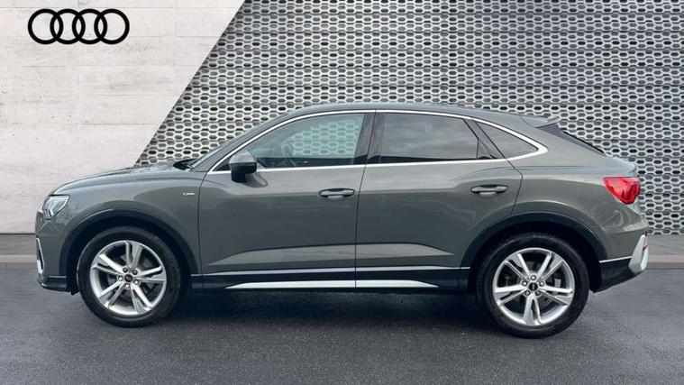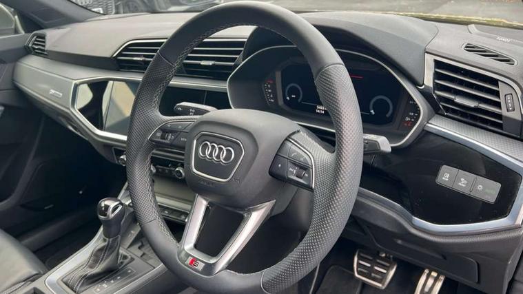 Audi connect safety and service, Audi drive select, Audi lane departure warning, Audi Virtual Cockpit - 10.25" display, Bluetooth interface, Camera based traffic sign recognition, Distraction and Fatigue warning, Legal emergency call, MMI Navigation Plus with high resolution 10.1 inch touchscreen colour display, Power operated tailgate, Progressive steering, Service interval indicator, Smartphone interface includes wireless Apple carplay/Android Auto, Start stop system with recuperation, Voice control system with natural language interaction, Sports suspension, 2 USB-C ports with charge and data functions, 6 passive loudspeakers, DAB digital radio module, Acoustic windscreen, Aluminium window trim, Auto dimming door mirrors, Auto dimming frameless rear view mirror, Diffuser grille in grained matt black, Diffuser trim in selenite silver, Electrically folding, adjustable and heated door mirrors with integrated LED side indicators and kerb view function for passenger side, Front and rear electric windows, Front fog lights, Front side air inlets in selenite silver, Front underbody protection in manhattan grey paint finish, Grille surround in aluminium silver matt, High gloss black finish B and C pillars, LED Dynamic rear indicators, LED headlights with LED daytime running lights, LED rear lights, LED third brake light, Privacy glass dark tinted rear and rear-side windows (from B-pillar backwards), Radiator grille in anthracite black with inlay in matt aluminium silver, Rain and light sensors, Rear side wing doors, Rear underbody protection in matt black, Rear wiper, S line badges on front wings, S line front and rear bumpers and side skirts in contrasting Manhattan grey paint finish, Side skirt insert in matt Platinium grey, Variable front intermittent wipers, 12V socket in rear centre console, 3 seat bench in 2nd row, 3 spoke leather multifunction steering wheel features S badging and grips in perforated leather with contrast stitching, 40:20:40 folding with manual adjustment for 60:40 forwards/backwards position and backrest angle, Adjustable rear seat bench/backrest with centre armrest and cupholder, Black cloth headlining, Dual zone electronic climate control, Electric lumbar support, Front and rear black floor mats with contrast stitching, Front and rear headrests, Front centre armrest, Height and reach adjustable steering wheel, Illuminated door sill trims with S logo, ISOFIX child seat mounting for front passenger with airbag deactivation and outer rear seat including top tether attachment point for outer rear seats, Luggage compartment sill protection in stainless steel, Manual front seats with height adjustment, Perforated leather gearknob, Single front passenger seat, Stainless steel pedals, Twin leather upholstery with front sport seats + S embossing, Non smoking pack - Q3, 3x3 point rear seatbelts, 6 airbags - Driver, front passenger, curtain and side windows, Audi pre-sense front with pedestrain and cyclist recognition, Electrically operated child locks on rear doors, Electromechanical parking brake, Electronic stabilisation control including ABS, ASR and EDL, Front seatbelt reminder, Hill descent control, Hill hold assist, Pre sense basic, Seatbelt monitoring, Tyre pressure warning, Warning triangle and first aid kit, Anti theft wheel bolts, Immobiliser, Remote central locking, Thatcham approved category 1 anti theft alarm, Aluminium look interior elements, Dark matt brushed aluminium inlay, Detail dashboard around MMI touch colour display in glass look, black with surround in aluminium look, Leatherette door armrest,
