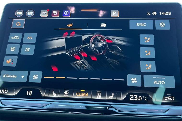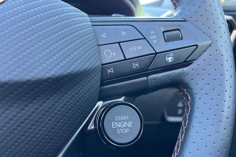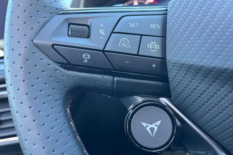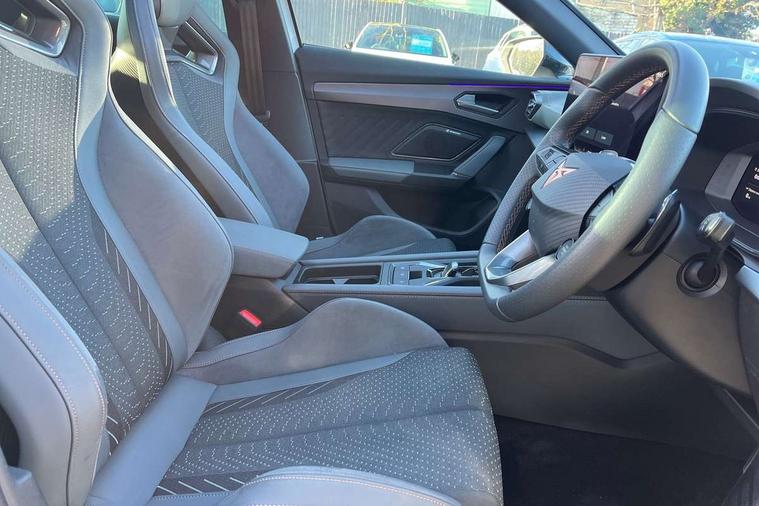 10.25" digital cockpit and configurable dashboard, Adaptive cruise control with follow-to-stop and speed limiter, Advanced driver alert system, Advanced lane assist with semi-automatic vehicle control in a medical emergency and traffic jam assist, Dynamic chassis control with driving profile selection (Comfort, Sport, CUPRA, Individual), Dynamic road sign display, Emergency steering support with turn assist, Forward collision warning with automatic braking, Full link phone integration, Intelligent park assist, RPM, trip computer, outside temp gauge, instrument light brightness, low fuel warning light, lights on reminder, gearshift indicator, Service interval indicator, Side and exit assist, Speed sensitive power steering, Start/stop system with regenerative braking, Top view camera, Virtual pedal and electric tailgate, Voice control system, Wired Android Auto, Wireless apple carplay, Wireless phone charger, Adaptive chassis control with continuous operation, CUPRA sport suspension, Electronic locking differential and dynamic traction support, 2 front and 2 rear USB type C sockets, Immersive by Sennheiser TM - 10 speakers, 1 central speaker, 1 subwoofer, Media system with navigation, 12.9" touchscreen display, voice control, DAB, steering wheel mounted controls, Auto dimming rear view mirror, Black roof spoiler, Body colour door handles, Body coloured bumpers, Dark grey wing mirror, Daytime running light with automatic headlight control and coming home feature, Door panel ambient lighting, Dynamic headlight range control, Electric front/rear windows, Electrically adjustable heated and folding door mirrors with memory function, Gloss black roof rails and window surrounds, High beam assist, LED 3rd brake light, LED front fog lamps with cornering function, LED Taillights with dynamic indicator, Matrix LED headlights with multifunction camera, Rain sensing wipers, Rear diffuser with twin exhaust pipe on each side, Rear fog lights, Rear side wing doors, Rear wash/wipe, Side skirts, Tinted rear windows, Welcome lights (within exterior mirror housing), 12V socket, 2 front and 2 rear reading lights, 3 seat bench in 2nd row, 60/40 split rear bench seat with armrest and mechanical seat release, Black headlining, Black interior roof lining, Cupra sports pedals, Dust/pollen filter, Electrically adjustable front seats with lumbar support and memory function, Front and rear head restraints, Front centre armrest, Heated front seats, Heated supersports multifunction leather steering wheel with satellite buttons and gear shift paddles, Height/reach adjust steering wheel, Illuminated aluminium doorsteps, Illuminated interior front door sills, Illuminated sunvisor with mirror, Isofix, Leather dashboard, door insert and side trim panel, LED smart wraparound lighting, PVC/Textile upholstery + cup bucket seats, Satellite steering wheel, Single front passenger seat, Three zone climate control with control panel in rear, Variable luggage/load compartment floor, 3 point seatbelts on all rear seats, ABS, Akebono brakes, Brake control system - ESC and brake booster, Child proof door locks, Driver and front passenger airbags with front passenger airbag de-activation, Driver and front passenger knee airbag, Electronic parking brake, Hill hold control, Performance brakes with front brembo calipers, Pre-crash front and rear seat belt tensioner, window closure and hazard lights, Public e-call, Seat belt reminder for front and rear seats, Side airbag for front and rear with curtain airbags, Tyre pressure monitoring system, Anti theft alarm system, KESSY Advanced - Keyless start, keyless entry with SAFELOCK, Locking wheel bolts, Copper and aluminium interior detailing, 19" Hailstorm forged machined R black and copper alloy wheels, Breakdown and tool kit,