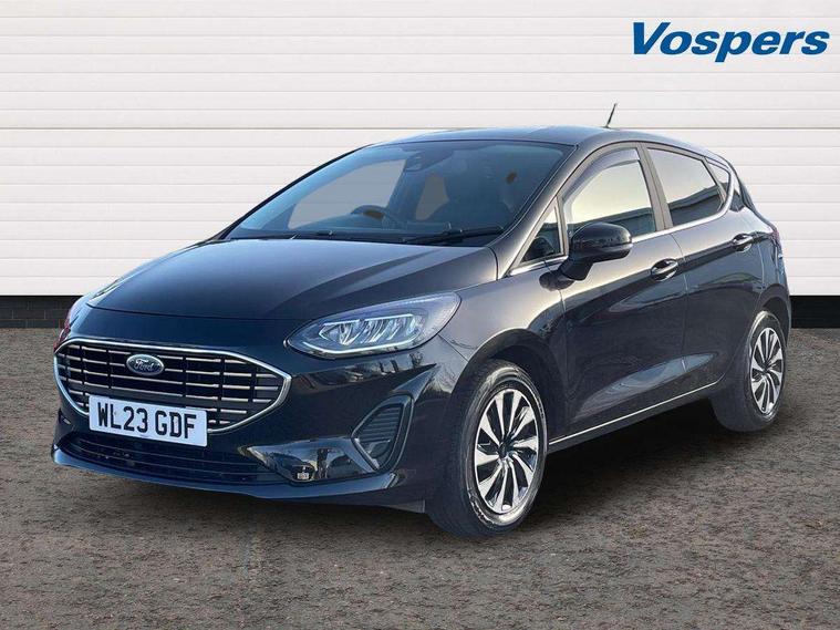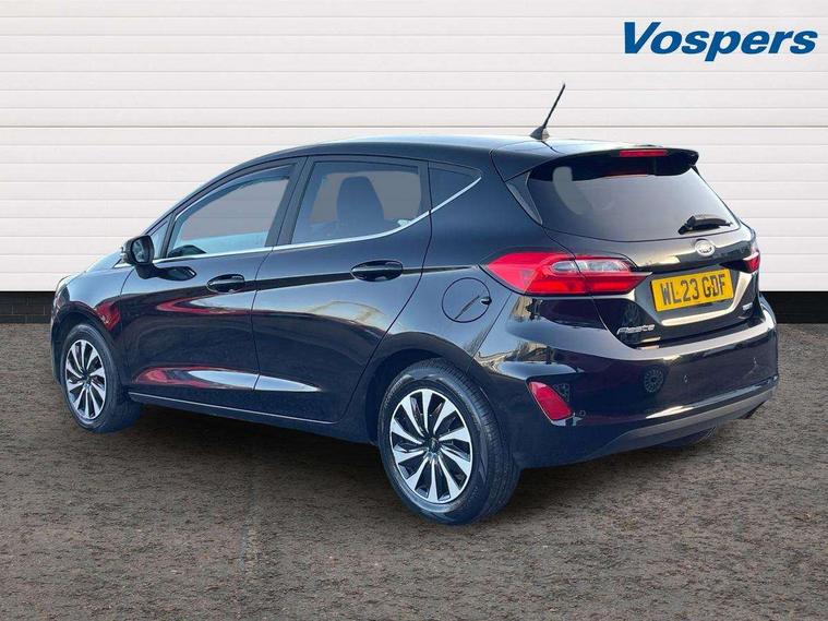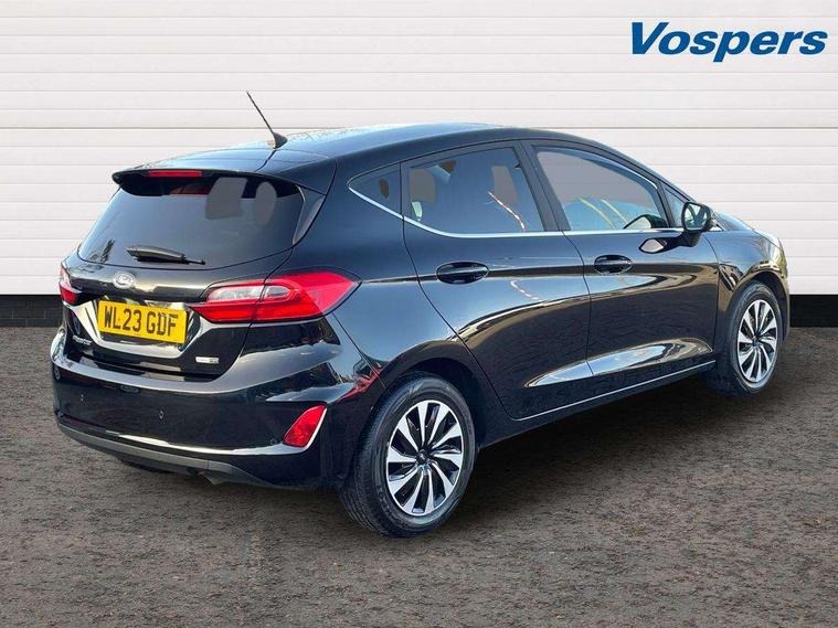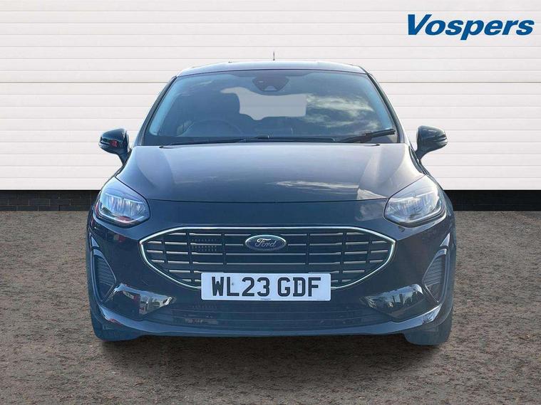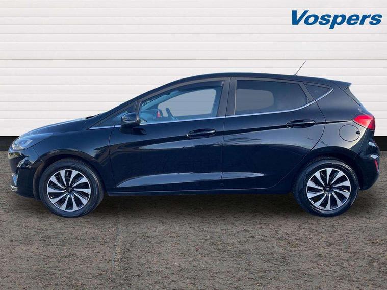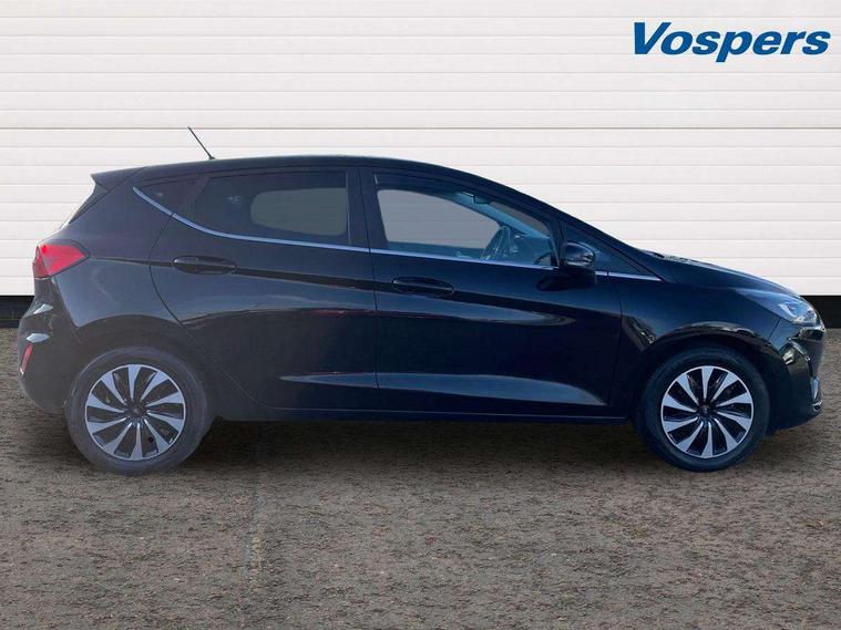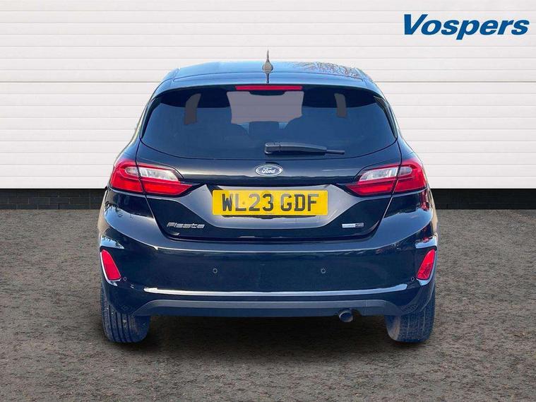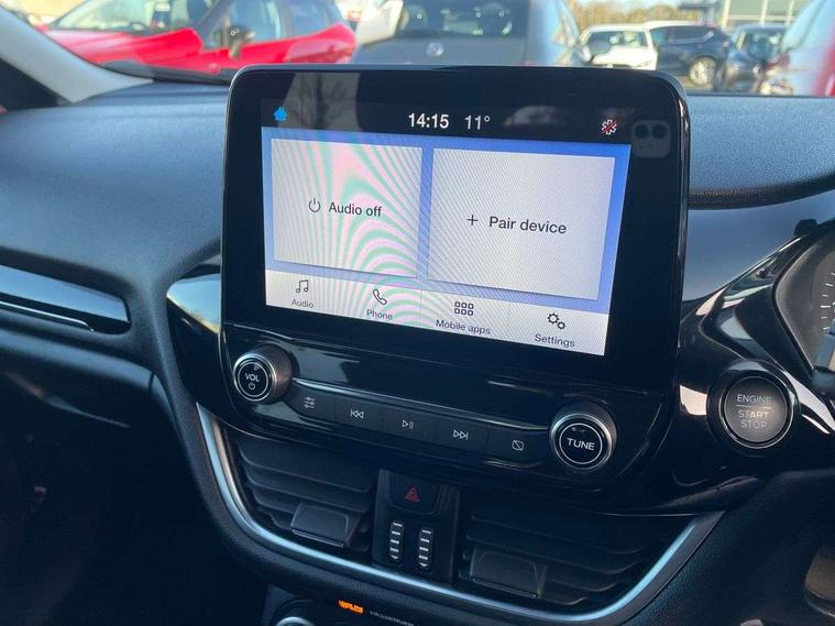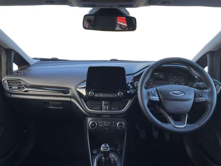 Bluetooth system, Electric power steering, Ford easy fuel, Ford SYNC 3 Navigation system incl 8" touchscreen, 7 speakers, FordPass connect, Apple carplay, android auto, voice control and emergency assistance, Rear parking distance sensors, Selectable drive modes (Normal, Sport, Track), Trip computer, 2 USB ports, Auxiliary input socket, DAB Digital radio, Steering wheel mounted controls, Body colour bumpers, Body colour door handles, Body colour rear spoiler, Body coloured electrically operated and heated door mirrors with side indicators, Chrome beltline trim, Chrome front grille, Chrome lower window surround, Cornering front fog lights, Electric front windows/one touch facility, Electric rear windows, Quickclear heated windscreen, Rain sensing wipers and auto dimming rear view mirror, Rear privacy glass, Rear wiper, 3 spoke leather trimmed steering wheel with audio control, 60/40 split folding rear seat, Adjustable head restraints, Boot carpet, Centre console with opening armrest, 2x cupholders, 12v and USB, Chrome inner door handles, Cloth upholstery, Footwell illumination, Front floor mats in velour, Front map reading lights, Front seat and rear pockets, Illuminated glovebox, Leather gaiter, Load area light, Luxury woven headliner, Manual 2 way passenger seat adjust, Manual 4-way driver seat adjust, Manual air conditioning, Overhead console with sunglasses holder, Pollen filter, Rake/reach adjustable steering wheel, Sensico wrapped steering wheel, NCAP Pack - Fiesta, 3 point seatbelts on all rear seats, ABS+EBA, Curtain airbags, Driver and passenger airbags, Drivers knee airbag, Electronic stability control with hill start assist, Front passenger airbag deactivation, Front side airbags, Seatbelt warning, Two tone horn, Tyre pressure monitoring system, Keyless start with 'Ford Power' starter button, MyKey system, Remote central locking & engine immobiliser, Thatcham Cat.1 alarm, 16" 10 spoke alloy wheels,