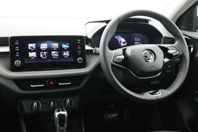 Advanced driver attention and drowsiness monitor, Bluetooth connection, Electromechanical power steering, Exterior temperature gauge, Service interval indicator, Traffic sign recognition, Virtual cockpit with 10.25" colour display, Wireless SmartLink for Apple CarPlay and Android Auto, 6 Speakers (4 in front and 2 in rear), Auxiliary socket for external MP3 player, DAB digital radio reception, Body coloured bumpers, Dimming rear view mirror with black frame, Door mirror integrated indicators, Front and rear electric windows, Front window wiper intermittent control, Headlight range control - Automatic, Ice scraper in fuel cap, LED daytime running lights with coming and leaving home feature, LED rear lights, Privacy glass, Rear LED fog light, Rear side wing doors, Rear window wiper with washing nozzles, Roof mounted spoiler, SKODA tailgate lettering in chrome, Third brake light, 2 reading lights in front and 2 reading lights in rear, 3 rear headrests, Backrest split and folding, Central console with removable cup holder and storage box, Chrome handbrake release button, Fabric upholstery, Front centre armrest, Gearshift knob/handle in leather, Grain satin black interior door handles, Hand brake lever handle in leather, Height adjustable front headrests, Height adjustable steering wheel, ISOFIX and TopTether anchorage points to the outer rear seats, ISOFIX and TopTether on the front passenger seat, Luggage compartment lighting, Manually adjustable lumbar support in front seats, Pollen filter, Rear seat bench unsplit, Single front passenger seat, Storm grey headlining, Sun visors with mirror and airbag label on passenger side, Textile floor mats, Ticket holder, Umbrella in drivers door, 3-point height adjustable front seats belts with pretensioner and force limiter, Automatic warning lights in case of crash, Driver and passengers airbag with switch off function, e-Call+, ESC including ABS, MSR, ASR, EDS, HBA and XDS, Front and rear seat belt warning, FRONT ASSIST (AEB City and AEB Inter Urban), Front side airbags, Head airbags, Hill hold control, One tone horn, Pedestrian protection, Three rear 3-points safety seat belts with pretensioner and force limiter including stop function for outer rear seat belts, Tyre pressure monitoring system, Anti-theft alarm system including immobiliser, interior monitoring, backup horn, and towing protection, Central locking with radio remote control, interior controls, SAFE function and 2 foldable keys, Colour Edition air vents, Grain satin black central console cover, Metallic grey upper decorative trim, Satin black door and side trim panel in front, Textile Kota grey lower decorative inserts, Anti-theft wheel bolts protection, Super-low rolling resistance tyres,