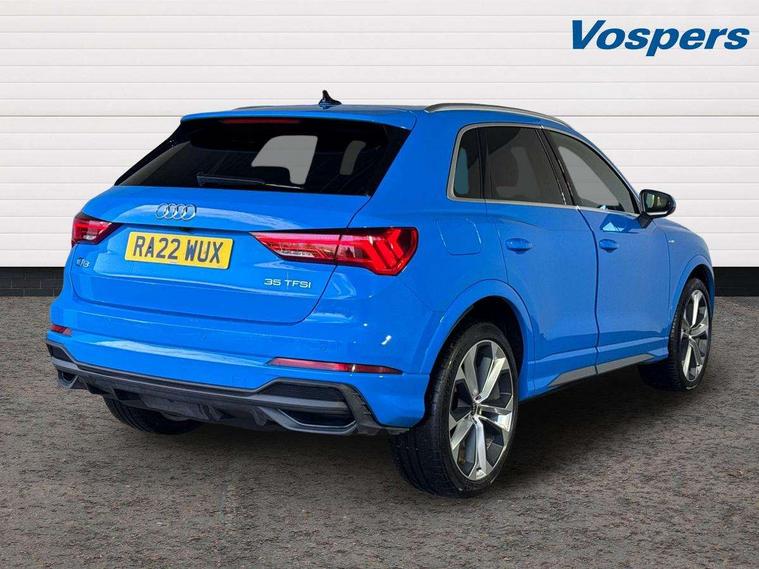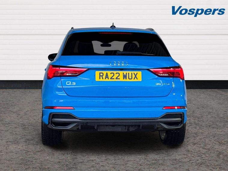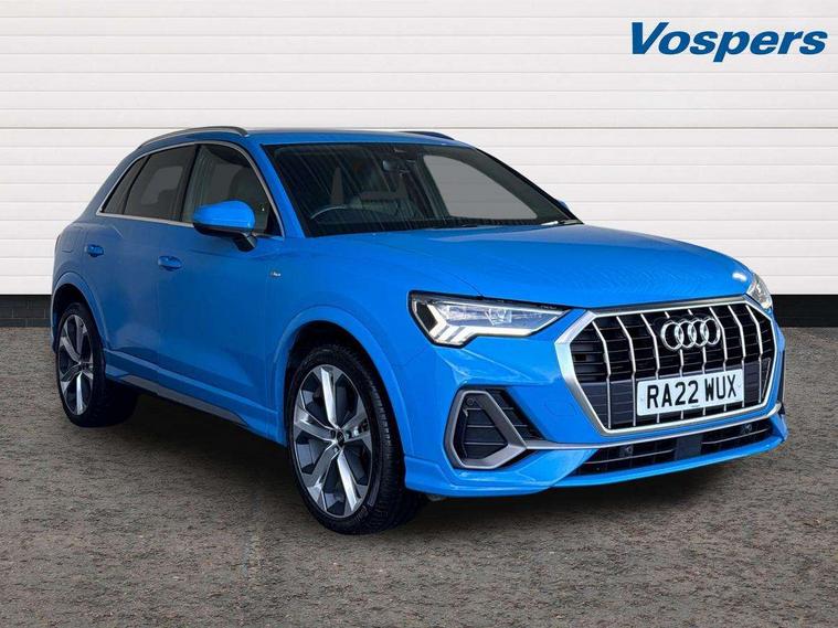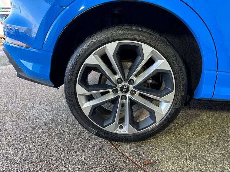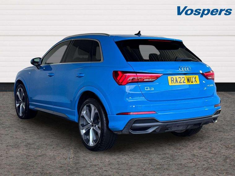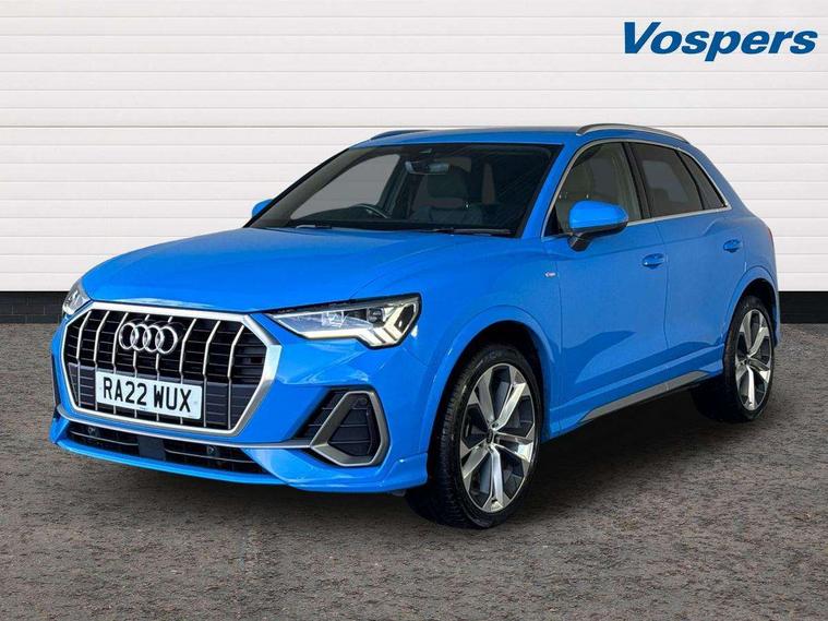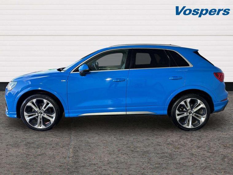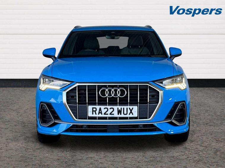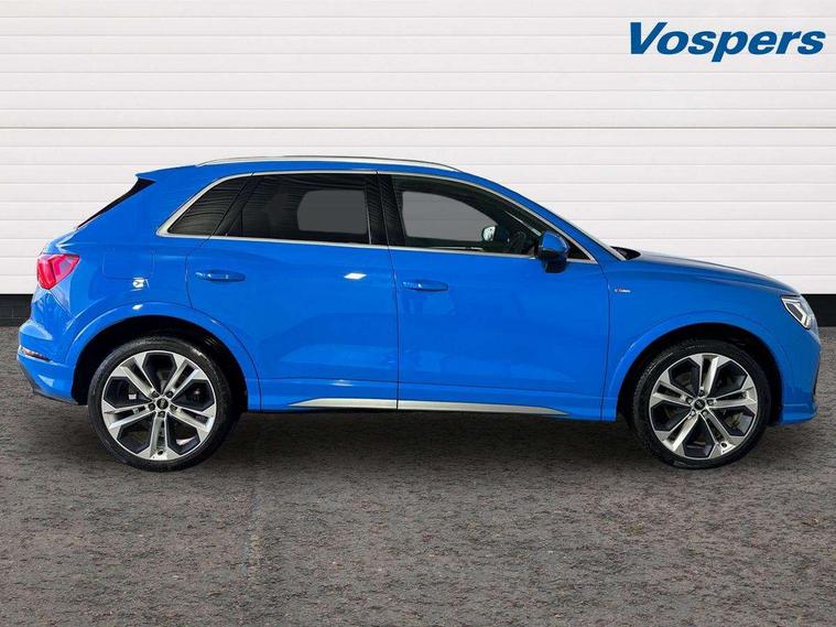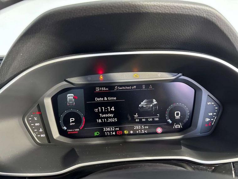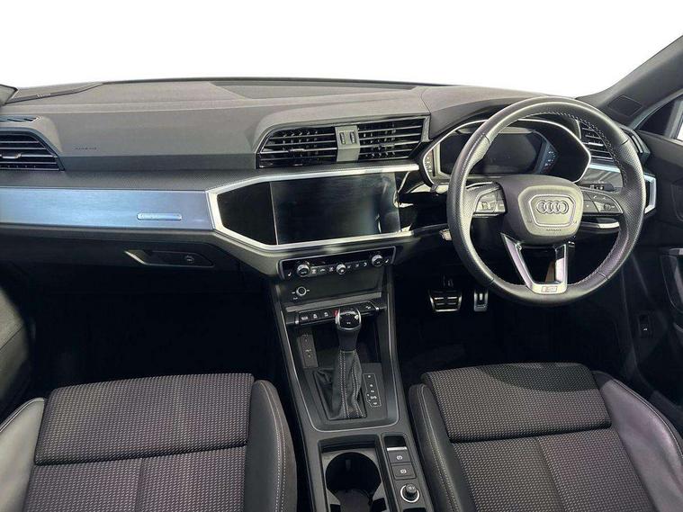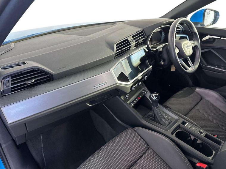Amazon alexa Integration, Audi connect safety and service, Audi drive select, Audi lane departure warning, Audi smartphone interface includes wireless Apple carplay/Android Auto, Audi Virtual Cockpit - 10.25" display, Bluetooth interface, Camera based traffic sign recognition, Distraction and Fatigue warning, Legal emergency call, MMI Navigation Plus with high resolution 10.1 inch touchscreen colour display, Phonebox light with wireless charging, Power operated tailgate, Progressive steering, Reversing camera, Service interval indicator, Start stop system with recuperation, Voice control system with natural language interaction, Sports suspension, 2 USB-C ports with charge and data functions, DAB digital radio module, SONOS premium sound system, Acoustic windscreen, Aluminium roof rails, Aluminium window trim, Anthracite black radiator grille, Auto dimming door mirrors, Auto dimming frameless rear view mirror, Body colour front spoiler blade, Electrically folding, adjustable and heated door mirrors with integrated LED side indicators and kerb view function for passenger side, Front and rear electric windows, Front fog lights, Front side air inlets in matt platinum grey, Grille vertical bars in aluminium silver/Matt, High gloss black finish B and C pillars, LED Dynamic rear indicators, LED headlights with LED daytime running lights, LED rear lights, LED third brake light, Privacy glass dark tinted rear and rear-side windows (from B-pillar backwards), Rain and light sensors, Rear diffuser grille in grained matt black, Rear diffuser strip in matt anthracite black, Rear side wing doors, Rear wiper, S line badges on front wings, S line front and rear bumpers and side skirts in contrasting Manhattan grey paint finish, Side skirt insert in matt Platinium grey, Variable front intermittent wipers, 12V socket in rear centre console, 3 seat bench in 2nd row, 3 spoke leather multifunction steering wheel features S badging and grips in perforated leather with contrast stitching, 40:20:40 folding with manual adjustment for 60:40 forwards/backwards position and backrest angle, Adjustable rear seat bench/backrest with centre armrest and cupholder, Black cloth headlining, Dual zone electronic climate control, Electric lumbar support, Front and rear black floor mats with contrast stitching in rock grey, Front and rear headrests, Front centre armrest, Heated front seats, Height and reach adjustable steering wheel, Illuminated door sill trims with S logo, ISOFIX child seat mounting for front passenger with airbag deactivation and outer rear seat including top tether attachment point for outer rear seats, Manual front seats with height adjustment, Perforated leather gearknob, Single front passenger seat, Stainless steel luggage compartment sill finisher, Stainless steel pedals, Twin leather upholstery with front sport seats + S embossing, Non smoking pack - Q3, 3x3 point rear seatbelts, 6 airbags - Driver, front passenger, curtain and side windows, Audi pre-sense front with pedestrain and cyclist recognition, Electrically operated child locks on rear doors, Electromechanical parking brake, Electronic stabilisation control including ABS, ASR and EDL, Front seatbelt reminder, Hill descent control, Hill hold assist, Pre sense basic, Seatbelt monitoring, Tyre pressure warning, Warning triangle and first aid kit, Anti theft alarm, Anti theft wheel bolts, Immobiliser, Remote central locking, Aluminium look interior elements, Dark matt brushed aluminium inlay, Detail dashboard around MMI touch colour display in glass look, black with surround in aluminium look, Leatherette door armrest,