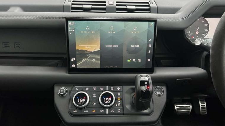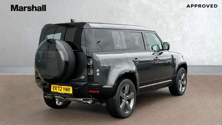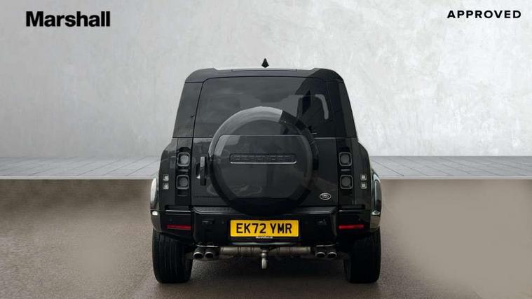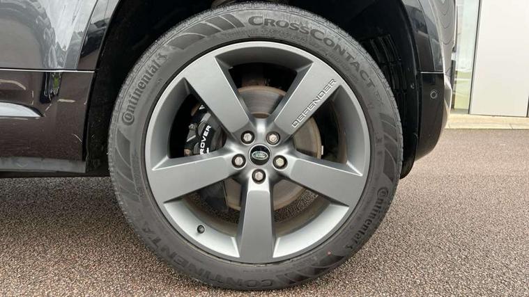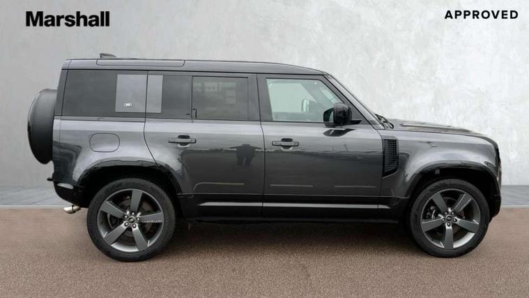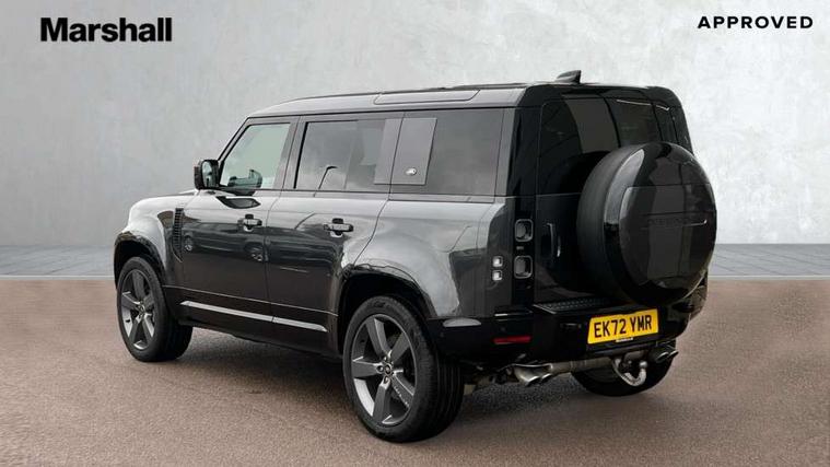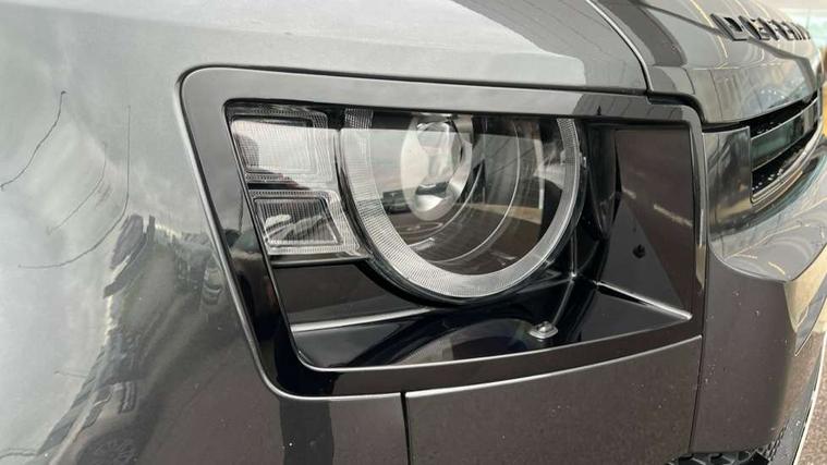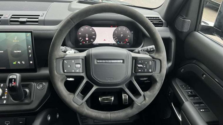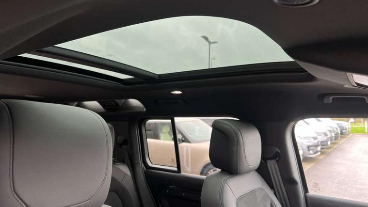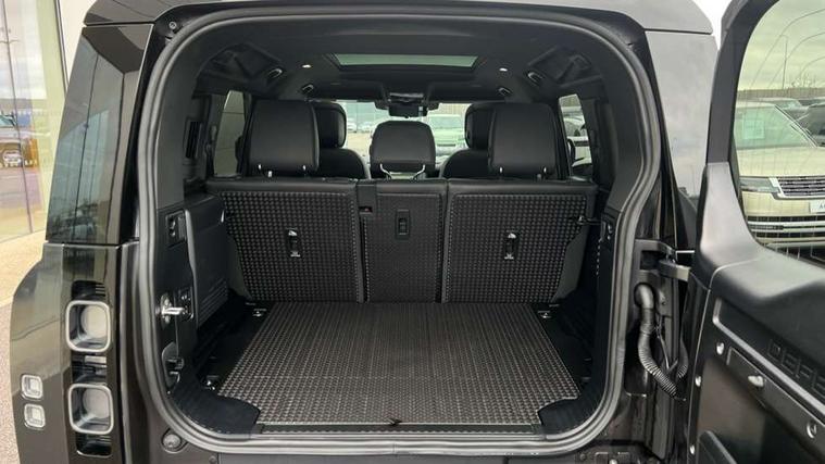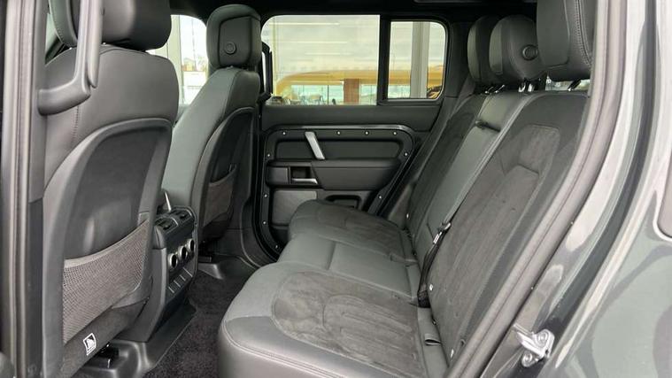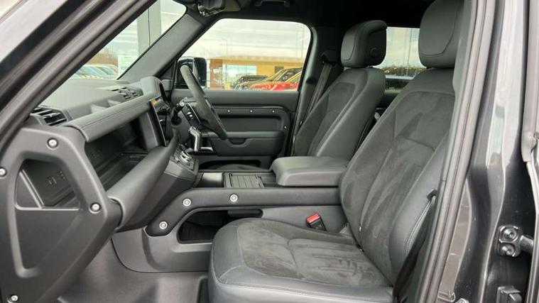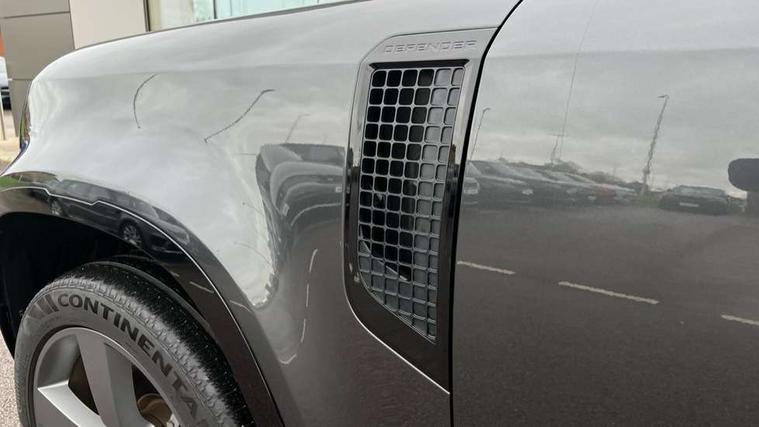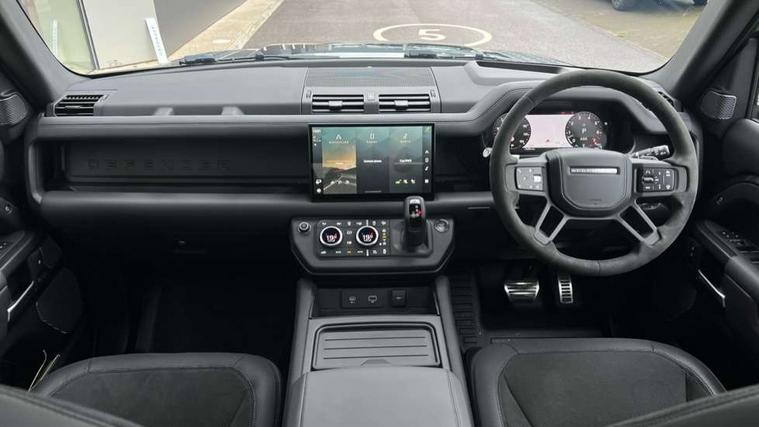 11.4" touchscreen, 360 degree parking aid, 3D Surround Camera with 360 View, 180 Rear View, Front Traffic Detection, Forward Vehicle Guidance, Tow Hitch Assist and clear sight Ground View, Adaptive cruise control, Android Auto, Apple CarPlay, Assisted tailgate with soft close, Blind spot assist, Bluetooth system, Brake pad wear indicator, Clear exit monitor, Connected navigation pro, Driver condition monitor, Electric power assisted steering (EPAS), Garage door opener (Homelink), Head up Display, Lane keep assist, Push button start, Rear collision monitor, Rear traffic monitor, Traffic sign recognition with adaptive speed limiter, Trip computer, Wade Sensing, Wireless device charging with phone signal booster, 8 speed automatic transmission, Adaptive dynamics, All terrain progress control, All wheel drive system, Configurable Terrain Response, Electronic active differential with brake torque vectoring, Electronic air suspension, Terrain Response 2 with dynamic program, Twin speed transfer box, DAB Radio (Digital Audio Broadcasting), Meridian 700w surround sound audio system with 15 speakers, Pivi pro connected, Advanced tow assist, Automatic headlight levelling, Automatic headlights, Centre high mounted stop light, ClearSight interior rear view mirror, Darkened LED tail lights, Electric heated/power fold door mirrors with approach lights and auto dimming driver side, Electric windows with one touch open/close and anti-trap, Electrically deployable towbar, Follow me home lighting, Front fog lights, Headlamp power wash, Heated rear window with timer, Heated washer jets, Heated windscreen, Illuminated metal treadplates with V8 branding, Less roof rack or roof rails, Matrix LED headlights with signature DRL, Privacy glass, Puddle lights, Quad outboard mounted exhaust pipes, Rain sensing windscreen wipers, Rear fog lights, Rear side wing doors, Rear wiper, Side hinged tailgate, Signature graphic (with interior storage), Sliding panoramic roof, Solar attenuating windscreen, Trailer stability assist, V8 badge, 12V power socket in loadspace, 14 way heated and cooled electric adjustable memory front seats with 4 way manual headrests, 3 seat bench in 2nd row, 40:20:40 folding, heated rear seats with centre armrest, Air quality sensor, Alpine lights, Bright metal pedals, Cabin Air Purification plus, Domestic plug socket, Durable rubber cabin flooring, Durable rubber loadspace flooring, Ebony morzine headlining, Electric cabin pre conditioning, Electric reach + rake adjustable steering column, Extended leather upgrade, Footwell lights, Front centre console refrigerator compartment, Front passenger isofix child seat attachment, Heated steering wheel, Leather gearshift, Loadspace cover, Loadspace Hook, Multifunction steering wheel, Overhead stowage for sunglasses, Premium cabin lighting, Rear headrests, Rear ISOFIX, Rear reading lights, Satin chrome gearshift paddles, Single front passenger seat, Standard seat configuration, Storage glovebox, Suedecloth steering wheel, Sunvisors with illuminated vanity mirrors, Three-zone Climate Control with Rear Cooling Assist, Twin front cupholders with cover, Online pack with data plan - Defender, 5 x 3 point seatbelts, ABS, Brake hold function, Cornering brake control (CBC), Cross car beam in satin black powder coat brushed finish, Customer configurable autolock, DSC - Dynamic Stability Control, EBD - Electronic brakeforce distribution, Electric parking brake (EPB), Emergency brake assist, Emergency braking, ESP + traction control, Front airbags with passenger seat occupant detector, HDC - Hill descent control, Hill launch assist, Low traction launch, Power operated child locks, Remote for (e-Call, Optimised assistance call, InControl app, Climate, beep and flash and door), RSC - Roll stability control, Seat belt reminder, TPMS (Tyre pressure monitoring system), Activity key, Alarm, Immobiliser, Intrusion sensor, Keyless entry, Locking wheel nuts, Robustec veneer,