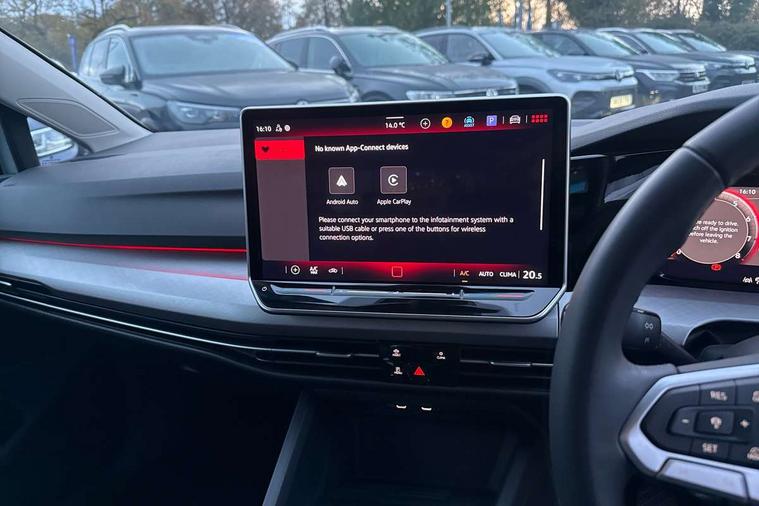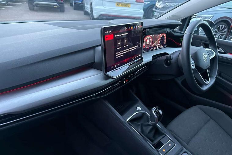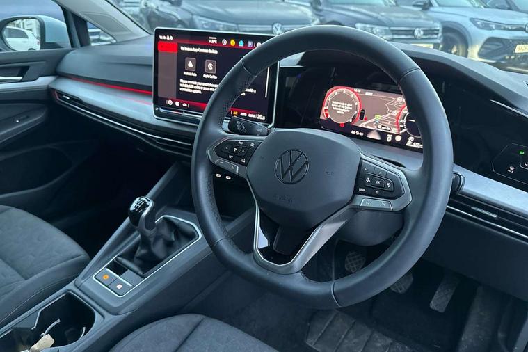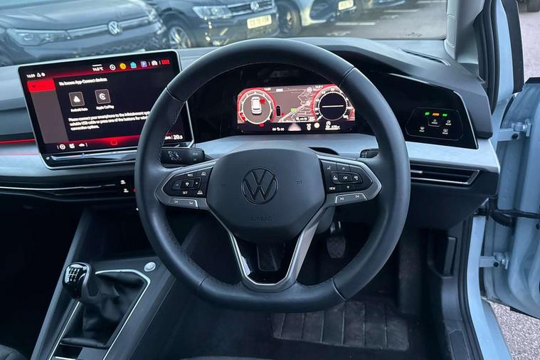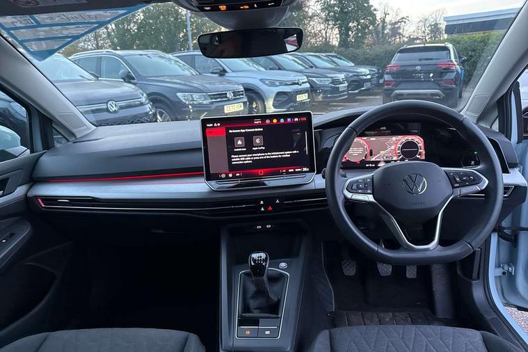 Activated carbon canister, Adaptive cruise control (ACC), Advanced driver attention and drowsiness monitor, Dynamic road sign display, E-Sim card for online connectivity, eCall emergency call system, Multi-color Digital cockpit pro, selection of different info profile possible, Multifunction front facing camera for distance control, Navigation system, Oncoming vehicle braking when turning including swerve support, Preparation for light assist system, Speed limiter, Speedo, rev counter, electronic odometer, trip, service interval display, exterior temperature and fuel gauge, Voice enhancer and voice control, Warning signal and warning light for front and rear seatbelts not fastened, We connect plus preparation, We connect preparation, Wireless app connect, Petrol Particulate Filter, Start-stop system with battery regeneration (recuperation - energy recovery during braking), XDS electronic differential lock for improved traction and handling, 2 USB C ports in front, 2 USB charging sockets on the centre console in the rear charging capacity upto 45W, Comfort telephony + wireless charging, without wireless aerial connection, Digital radio reception (DAB), Diversity antenna for FM reception, Gaming platform via car app, Infotainment system with 12.9" display, Mobile phone interface with inductive charging feature, 3rd brake light, Auto dimming rear view mirror, Auto headlights, Automatic headlamp activation with Coming home and Leaving home feature, Body colour door handles, Body colour door mirrors, Exterior ambient lighting with illuminated door handles, Exterior mirrors convex on the left and aspherical on the right, Front and rear electric windows, Heat insulating windshield made of laminated glass, LED daytime running lights, Rain sensor, Rear exhaust tailpipe, Rear fog light on one side and reversing lights on both sides, Rear side wing doors, Rear tinted glass 65% light absorbing from B pillar backwards, Rear windscreen washer and wiper with interval delay, Remote electrically foldable door mirrors, puddle lights and reverse activated passenger's door mirror, Standard bumpers, Welcome light with surround lighting, 12V socket in front centre console, 12V socket in luggage compartment, 3 rear head restraints, 3 seat bench in 2nd row, Chrome plated radiator grille inserts, air vent surrounds and light switch surrounds, Front centre armrest, Front head restraints, ISOFIX anchors for child seats on outer rear bench seats and on front passanger seat compatible for i-Size, Leather gearshift handle, Luggage compartment lighting, Rear cupholder and loadthough, Single front passenger seat, Soul black instrument panel, Split folding backrest with centre armrest and unsplit rear seat bench, Standard pedal cluster, Storm grey roof lining, Sun visors with illuminated vanity mirrors, Parking and comfort pack - Golf Estate/Hatchback, 3 point height adj front seatbelts + pretensioners, 3 rear three point seatbelts, ABS, Autonomous emergency braking front assist with pedestrian and cyclist monitoring, Child locks on rear doors, Driver and front passenger airbag with front passenger airbag deactivation, Electronic parking brake with auto hold, ESC (Electronic Stability Control), Extended pedestrian protection measures, Rear disc brakes, Two tone horn, Tyre pressure loss indicator, Volkswagen roadside assistance, Alarm with interior protection, Anti theft wheel bolts, Keyless start with SAFE lock, Preparation for alcohol interlock, Nature cross brushed decorative inserts for dashboard and front door panels,