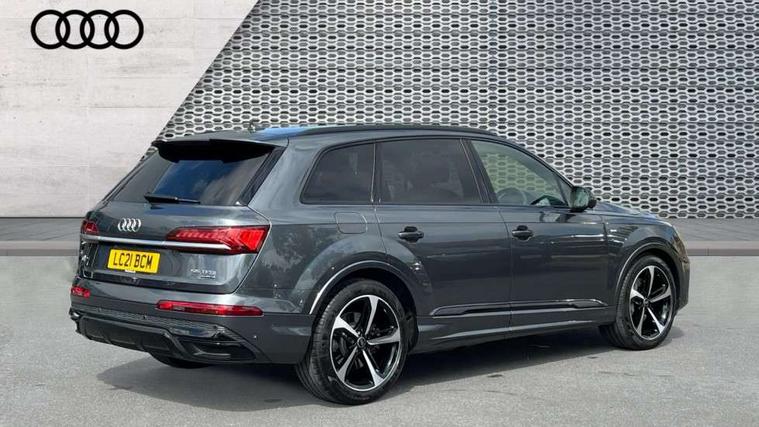 Audi connect safety and service (e-call), Audi drive select (Auto, Comfort, Dynamic, Efficiency, Individual, Off-road and All road), Audi phone box with wireless charging, Camera based traffic sign recognition, Electromechanical steering, MMI navigation plus with MMI touch screens includes 10.1" and 8.6" screens with haptic feedback, Natural voice recognition, Parking system plus with 360 degree display (front, rear and side sensors) - acoustic and visual park assist system, Power operated tailgate, Rear view camera, Smartphone interface includes wireless Apple carplay/Android Auto, Start/stop system, 48V Mild hybrid technology, 85 litre fuel tank, Adaptive air sports suspension, Quattro all wheel drive with self locking centre differential, Audi music interface - front 2 USB-C ports with charger and data functions, Audi sound system with 6 channel amplifier, 180 watt amplifying capacity and 10 loudspeakers including subwoofer, DAB digital radio module, Audi matrix LED headlights with dynamic front and rear indicators, Auto dimming frameless rear view mirror, Black roof rails, Bumpers in contrast paint scandium grey finish includes door trim and wheel arch trim strips, inlays in door strip contain quattro embossing, Electrically adj heated/folding + automatically dimming exterior mirrors with memory + automatic kerb side function for passenger side exterior mirror, Heat insulating glass in windshield, Integrated LED indications in door mirrors, LED daytime running lights, LED rear tail lights, Privacy glass - dark tinted rear and rear side windows from B-pillar backwards, 4 zone deluxe automatic climate control, 7 seat layout with ISOFIX points for the front passenger seat and rear passenger seat, Black cloth headlining, Comfort front centre armrest, Folding rear seats, Front head restraints, Front/rear floor mats, Heated front seats, Illuminated door sill trims with S logo, LED interior ambient lighting, Luggage compartment cover, Luggage compartment sill protection in stainless steel, Rear head restraints, Stainless steel pedals, Sunvisors with illuminated vanity mirrors, Titanium black styling pack - Q7/SQ7, 3 point seatbelts on all rear seats, Audi pre sense front, Driver and front passenger, front side and curtain airbags, Electromechanical parking brake, Electronic Stabilisation Control (ESC) including ABS, ASR and EDL, Extended pedestrian protection measures, Hill hold assist, Seatbelt monitoring, Tyre pressure loss indicator, Warning triangle and first aid kit, Anti theft alarm, Anti-theft wheel bolts and wheel loosening detection, Keyless Go, Remote central locking, Polished oak trim with grey finish inlay, Tool kit, Tyre repair kit,