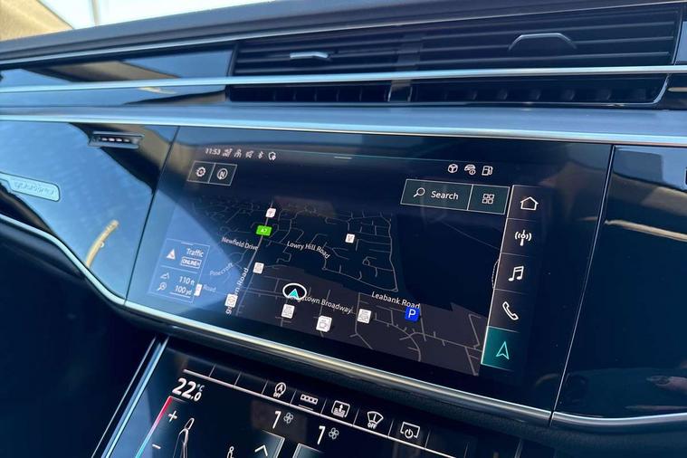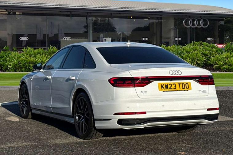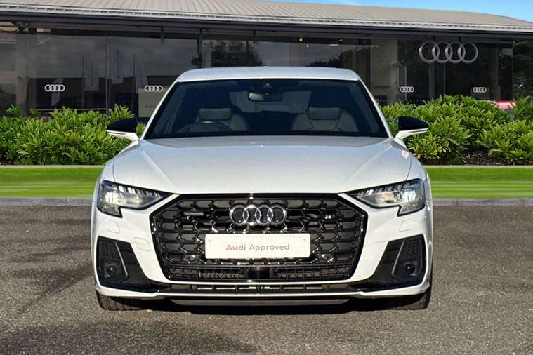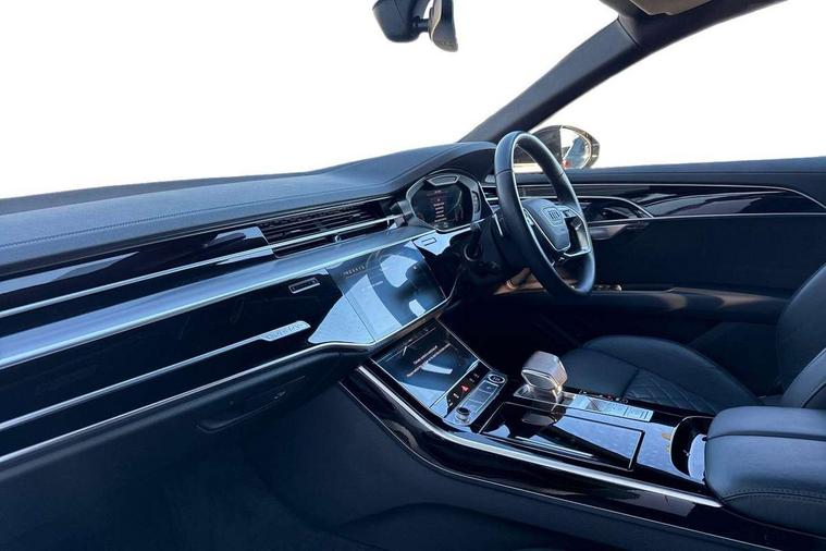 'Lights On' Reminder warning buzzer, Adaptive cruise control with cruise assist, emergency assist, efficiency assist, swerve assist, turn assist and speed limiter, Audi connect safety and service (e-call), Audi drive select, Audi parking system plus with front and rear sensors, Audi smartphone interface with app store includes wireless Apple carplay, Android auto and Amazon alexa integration, Audi virtual cockpit, Bluetooth interface, Camera based traffic sign recognition, Convenience key, Electro - mechanical power assisted steering, Head up Display, MMI navigation plus with MMI touch + Twin touch screens with haptic feedback, Operating buttons in black, glass look with haptic feedback including extended aluminium look, Power door closure, Power operated tailgate, Rear view camera, Remote fuel filler release, Service interval indicator, 24 litre AdBlue tank, 48V Mild hybrid technology, 8 speed transmission with hill hold assist, 82 litre fuel tank, Adaptive air suspension, Diesel particulate filter, Quattro all wheel drive with self locking centre differential, Audi music interface, Audi sound system, DAB digital radio module, DVD System, MMI radio plus, USB connection, Acoustic double glazing, All-weather, manoeuvring, position, static cornering, turning and motorway lights with automatic dynamic headlight range control, Audi space frame, Auto dimming rear view mirror, Body colour bumpers, Body colour side protection with aluminium trim strips, Electric front windows, Electric rear windows with isolation switch, Electric sunblinds for rear window and rear door windows, Electrically adjustable heated folding + automatically dimming exterior mirrors with memory function and integrated LED indicators, Front wash/wipe with interval delay, HD matrix LED headlights with dynamic light presentation and dynamic indicators, Headlight cleaning system, Heat insulating darkened glass in side and rear windows, Heat insulating glass windscreen, Heated rear window, Heated windscreen washer jets, High beam assist, LED brake lights, LED daytime running lights, LED third brake light, OLED rear lights with changeable rear light signature, Privacy glass, Rear boot, Rear side wing doors, Side skirts, Welcome/leaving lighting, 12V socket, 2 zone automatic air conditioning, 3 seat rear bench with centre armrest in 2nd row, 4 way electric lumbar support for driver and front passenger, Audi phone box light, Black cloth headlining, Centre console with cupholders, Comfort centre armrest, Door pockets with bottle holder, Driver and front passenger side sunvisors with illuminated vanity mirrors, Dust/pollen filters, Electric front seats with memory function, Front floor mats, Glove compartment cooling, Heated front seats, Height/reach electric steering column with easy exit function, Illuminated door sill trims with aluminium inlays and S diamond emblem, Isofix child seat mounting points on outer rear seats, Leather gearknob, Passenger footwell storage net, Reading lights, Rear floor mats, Rear headrests, Roof mounted sunglasses holder, Single front passenger seat, Stainless steel pedals and footrest, Valcona leather upholstery with front sports seats in diamond quilted with S embossed logo, Black exterior styling pack - A8 Black Edition, Chrome exterior pack - A8, Extended LED Interior multi coloured light pack - A8, 3 point seatbelts on all rear seats, ABS/EBD, Active front headrest system, ASR traction control, Audi pre sense basic, Audi pre sense front, Black brake calipers, Driver/Front Passenger airbags, EDL traction control, Electromechanical parking brake, ESP, Extended pedestrian protection measures, Front and rear disc brakes, Front and rear side airbags with head airbag system, Front passenger airbag deactivation, Rear child proof door locks, Seatbelt reminder + electric contact in buckle + advanced safety equipment, Tyre pressure loss indicator, Warning triangle and first aid kit, Anti theft alarm tow away protection, Anti-theft wheel bolts and wheel loosening detection, Remote central locking, Carbon vector upper inlays, Dark matt brushed aluminium lower inlays,