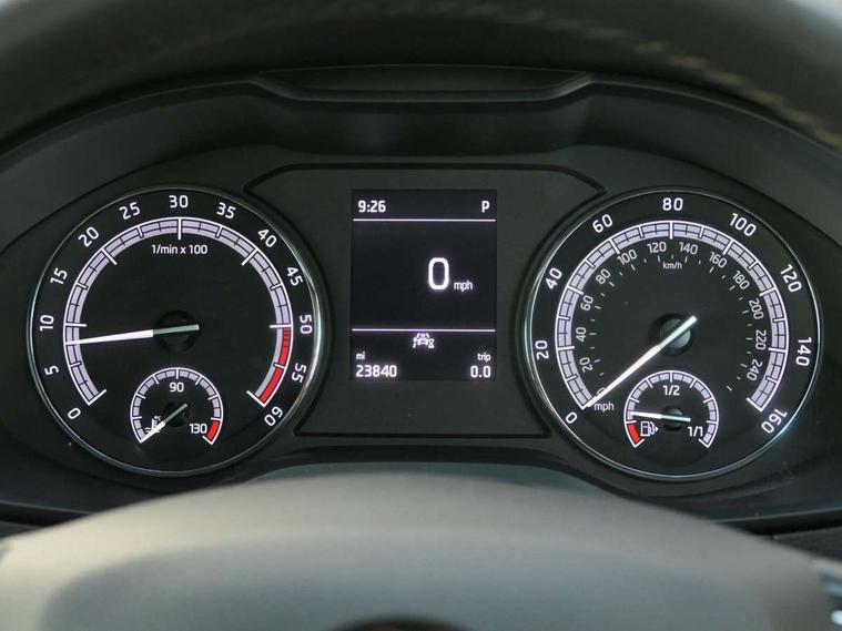 Driver alert system, Driver fatigue sensor, Driver profile selection, Electro-mechanical PAS, Outside temperature gauge, Service interval indicator, Start/stop system with regenerative braking, Diesel particulate filter, DAB radio with Bluetooth, SD card slot, USB connection, Acoustic glass, Aero front windscreen wipers with intermittent function, Automatic headlight control system, Black electric window control buttons, Body colour door mirrors and handles, Body coloured bumpers, Electric front and rear windows with child proof lock, Electrically adjustable heated folding and auto dimming door mirrors, Heated rear windscreen, LED rear lights with high functionality, Light assistant (coming/leaving home/tunnel light), Privacy glass, Safety reflectors on front doors, Third brake light, 1.5 litre bottle holders in driver and front passenger door panels, 12V socket in boot, 12v socket in front centre armrest with storage compartment and rear air vents, 2 Folding hooks and nets in boot, 2 Front readings lights for driver and passenger, 3 rear height adjustable headrests, 4 foldable roof handles with rear coat hooks, 4 lashing points on luggage floor, Backrest release, Cargo elements in boot, Chrome inner door handles, Driver and passenger seats height adjust, Dual zone climate control, Folding tables on the front seat backrests, Front head restraints, Front seat and rear pockets, Height adjustable front three point seats belts with tensioners, Height/reach adjust steering wheel, Ice scraper, Illuminated and cooled glovebox, Illuminated luggage compartment, Isofix child seat preparation outer rear, Manual lumbar support for front seats, Net programme in boot, Pen holder, Pollen filter, Rear boot cover, Rear reading lights, Rear seats fixed folding and divided 60:40, Safety vest holder, Seatbelt reminder signalisation and pretensioner for all seats, Storage box in upper central dashboard closed, Sunvisors with illuminated vanity mirrors, Umbrella under passenger seat, Airbags - Front side, head, knee and curtain, Automatic door unlocking in case of crash, Automatic fuel cut off in case of crash, Driver airbag, Electronic parking brake with auto hold function, Emergency rear braking signal, ESC including ABS, MSR, ASR, EDS, HBA, DSR, RBS, MKB and traction control, Front assist radar scanning of the space in front of the car with automatic braking, Hill hold control, Passenger airbag with switch-off function, Pedestrian monitor, Three point seatbelts rear, Two tone horn, Tyre pressure display, Tyre pressure monitor, Alarm with interior monitoring, back up horn and tilt sensor with safe function, Electronic engine immobiliser, Remote central locking with 2 remote folding keys, Chrome framed air vents, Storage on wheel cover,