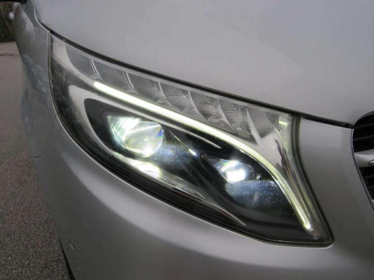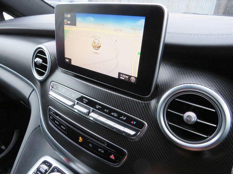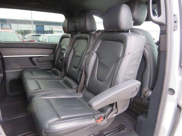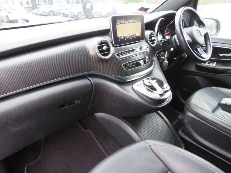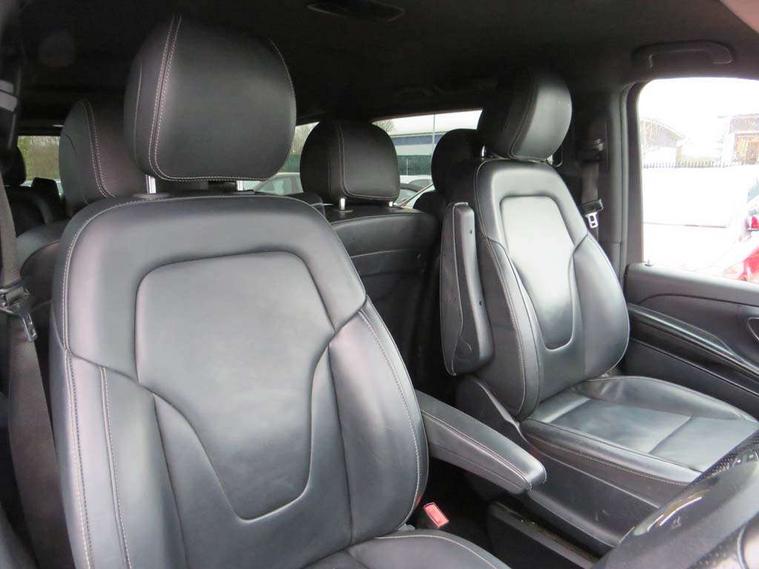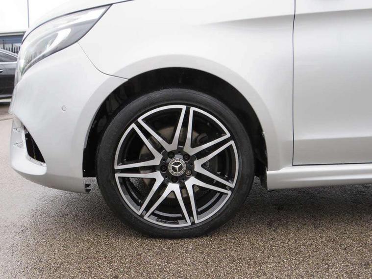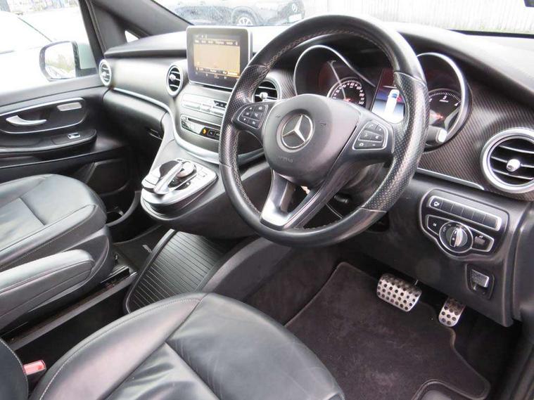 Active parking assist and reversing camera, Agility select with a choice of driving modes (Comfort, ECO, Sport, Individual), Attention assist, Brake wear warning display, Collision prevention assist, Easy-pack tailgate - Powered opening/closing automatically, ECO start/stop function, High resolution 7 inch multimedia colour display, Instrument cluster with 5.5 inch colour display trip computer, Mercedes me connect including emergency call system, accident recovery, breakdown and maintenance management, Outside temperature gauge, Service indicator (ASSYST), Side wind assist system, Speed sensitive steering, Status display for rear seat belts in instrument cluster, 25 litres large AdBlue tank, Agility control comfort suspension, Diesel particulate filter, Audio 20 CD with touch pad + media interface for iPod/iPhone + Bluetooth interface with handsfree function, DAB Digital radio, Integrated radio aerial, Two USB ports and one SD Card slot in centre console, Adaptive brake lights, AMG bodystyling front apron and rear spoiler, AMG bodystyling rear apron and chrome load sill, AMG bodystyling side skirts, Anodised roof rails, Automatic headlamp activation, Black tinted rear windows, Body colour bumpers, Body colour door mirrors, Chrome boot sill trim strip, Electric folding door mirrors + auto dimming rear view + drivers exterior door mirror, Electric front windows, one touch / obstruction sensor, Electric sliding door in both side, Heated door mirrors, Heated windscreen washers, Illuminated front door sill panels with Mercedes-Benz lettering, LED intelligent light system including integral LED daytime running lamps, LED tail lamps/brake lamps and indicators, Metallic paint, Privacy glass, Radiator grille with integral star and two louvres in matt iridium silver, Rain sensitive windscreen wipers, Rear spoiler, Split tailgate in opening rear window with chrome handle, Tailgate wash/wipe, 12V Accessory socket in centre console, 12V socket in boot/load compartment and rear passenger compartment, 2 Isofix seat anchors, 2nd/3rd row height adjustable head restraints, 3 colours ambient lighting, 3 spoke nappa leather steering wheel, Adjustable front seat head restraints, AMG sport pedals, Brushed stainless steel sports pedals with rubber studs, Carpet floor covering in passenger compartment, Driver + front passenger lumbar support, Driver/front passenger seat height adjustment, Electric air heater system - 1.2 kW output, Footwell lighting with reading light and illuminated handle in rear compartment, Front centre armrest, Height/reach adjustable steering column, Illuminated rear door handles, Lockable glovebox, Luxury centre console with retractable cover + two cup holder + 12V socket + multimedia box, Multifunction steering wheel with audio controls and onboard settings, Nappa leather upholstery, Seat occupancy sensor for front passenger seat, Stowage nets behind individual seats, Sunvisors with illuminated vanity mirrors, Thermatic 3 zone automatic climate control, Three stage heated front seats, Anti theft protection pack - V Class, 3 point seatbelts on all seats, Adaptive brake system with HOLD function and brake drying in the wet, Airbags - sidebag for driver and front passenger with combined thorax/pelvis bag, Airbags - windowbag for driver and front passenger, Anti-lock braking system (ABS), Child proof door locks, Electronic parking brake, Electronic Stability Programme, Hill start assist, Perforated front brake discs and brake calipers with Mercedes-Benz lettering, Rear seatbelt warning indicator, Tyre pressure monitoring system, Warning triangle and first aid kit, Central locking with interior switch, Chrome surround in electric key, Carbon trim, Chrome air vent surrounds, Dashboard upper section in artico man-made leather, 19" AMG 7 twin spoke alloy wheels, Space saver spare wheel with jack,