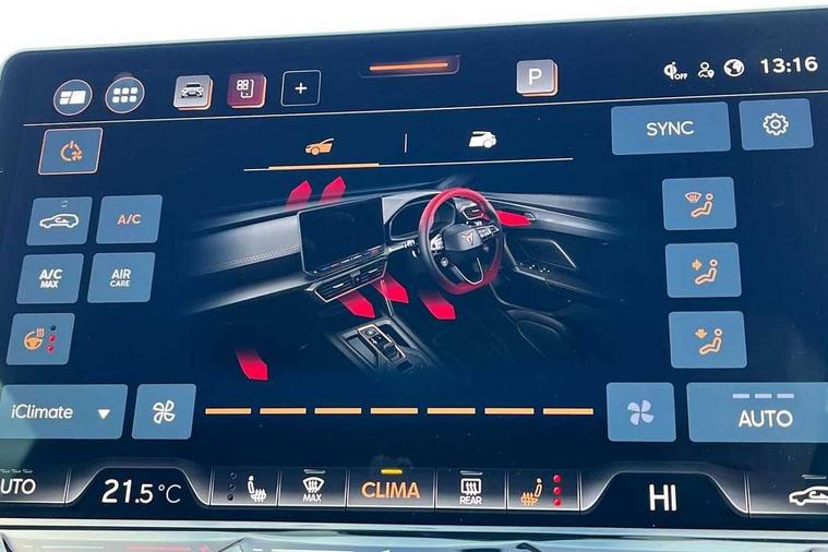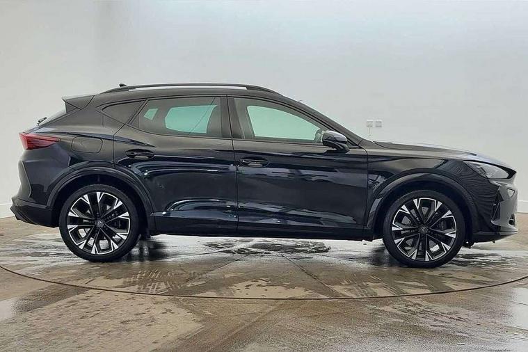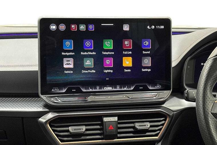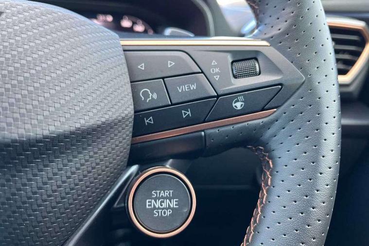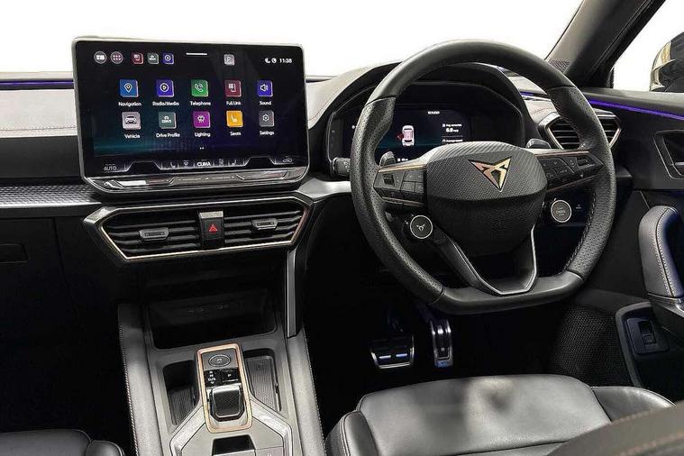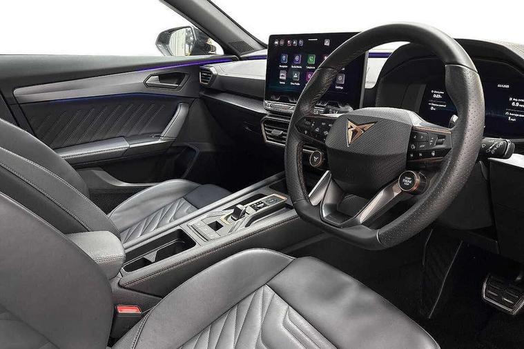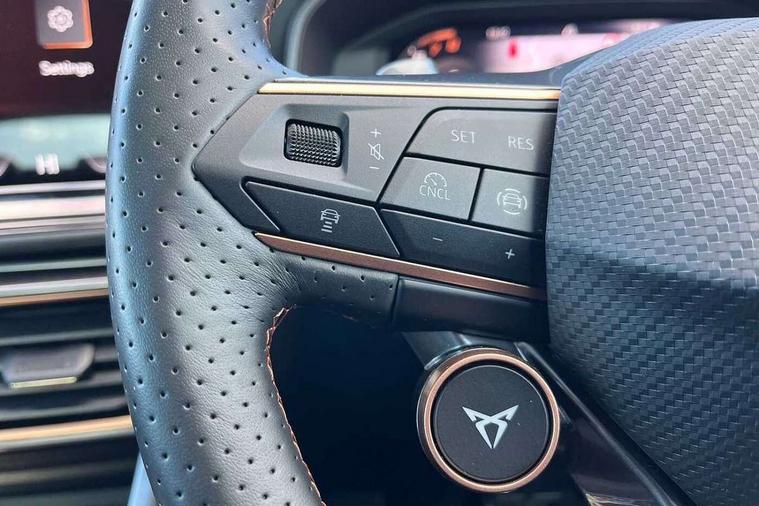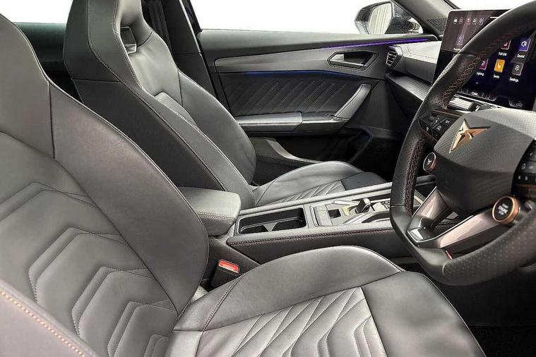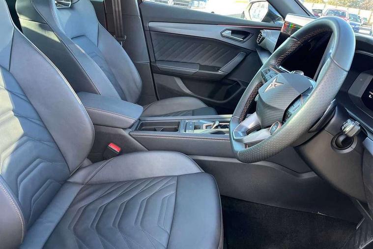 10.25" digital cockpit and configurable dashboard, Adaptive cruise control with follow-to-stop and speed limiter, Advanced driver alert system, Advanced lane assist with semi-automatic vehicle control in a medical emergency and traffic jam assist, Dynamic chassis control with driving profile selection (Comfort, Sport, CUPRA, Individual), Dynamic road sign display, Emergency steering support with turn assist, Forward collision warning with automatic braking, Full link phone integration, Intelligent park assist, RPM, trip computer, outside temp gauge, instrument light brightness, low fuel warning light, lights on reminder, gearshift indicator, Service interval indicator, Side and exit assist, Speed sensitive power steering, Start/stop system with regenerative braking, Top view camera, Virtual pedal and electric tailgate, Voice control system, Wired Android Auto, Wireless apple carplay, Wireless phone charger, Adaptive chassis control with continuous operation, CUPRA sport suspension, Electronic locking differential and dynamic traction support, 2 front and 2 rear USB type C sockets, Media system with navigation, 12.9" touchscreen display, voice control, DAB, steering wheel mounted controls, Auto dimming rear view mirror, Body colour door handles, Body coloured bumpers, Dark grey wing mirror, Daytime running light with automatic headlight control and coming home feature, Door panel ambient lighting, Dynamic headlight range control, Electric front/rear windows, Electrically adjustable heated and folding door mirrors with memory function, Gloss black roof rails and window surrounds, High beam assist, LED 3rd brake light, LED front fog lamps with cornering function, LED Taillights with dynamic indicator, Matrix LED headlights with multifunction camera, Rain sensing wipers, Rear diffuser with twin exhaust pipe on each side, Rear fog lights, Rear side wing doors, Rear wash/wipe, Tinted rear windows, Welcome lights (within exterior mirror housing), 12V socket, 2 front and 2 rear reading lights, 3 seat bench in 2nd row, 60/40 split rear bench seat with armrest and mechanical seat release, Black headlining, Black interior roof lining, Cupra sports pedals, Dust/pollen filter, Electrically adjustable front seats with lumbar support and memory function, Front and rear head restraints, Front centre armrest, Heated front seats, Heated supersports multifunction leather steering wheel with satellite buttons and gear shift paddles, Height/reach adjust steering wheel, Illuminated aluminium doorsteps, Illuminated interior front door sills, Illuminated sunvisor with mirror, Isofix, Leather dashboard, door insert and side trim panel, LED smart wraparound lighting, PVC/Leather upholstery, Satellite steering wheel, Single front passenger seat, Storage pockets on rear of front seats, Three zone climate control with control panel in rear, Variable luggage/load compartment floor, 3 point seatbelts on all rear seats, ABS, Brake control system - ESC and brake booster, Child proof door locks, Driver and front passenger airbags with front passenger airbag de-activation, Electronic parking brake, Front and rear disc brakes, Front side curtain airbags, Hill hold control, Pre-crash front and rear seat belt tensioner, window closure and hazard lights, Public e-call, Seat belt reminder for front and rear seats, Tyre pressure monitoring system, Anti theft alarm system, KESSY Advanced - Keyless start, keyless entry with SAFELOCK, Locking wheel bolts, Copper and aluminium interior detailing, 19" Artic machined sport black and silver alloy wheels, Breakdown and tool kit,