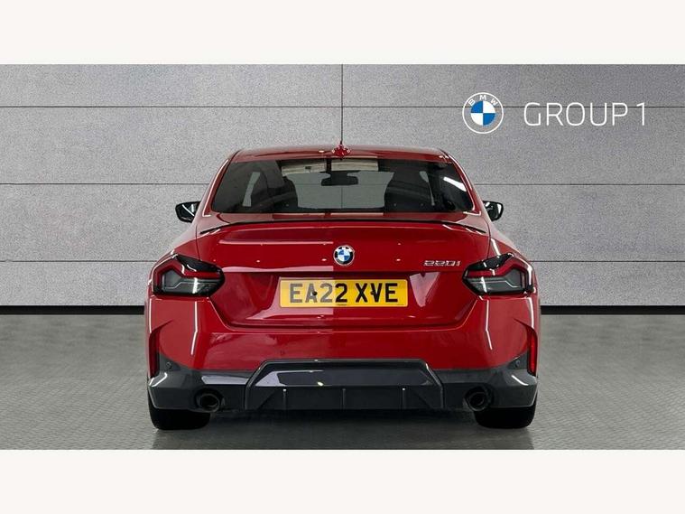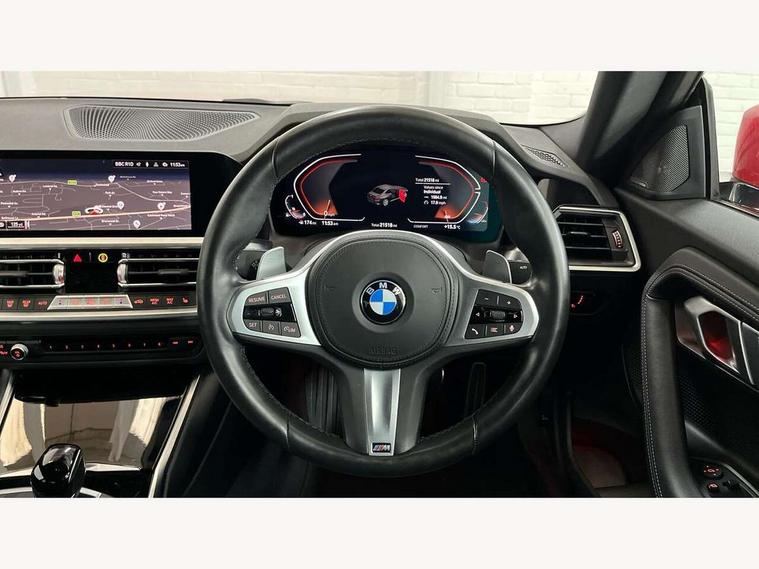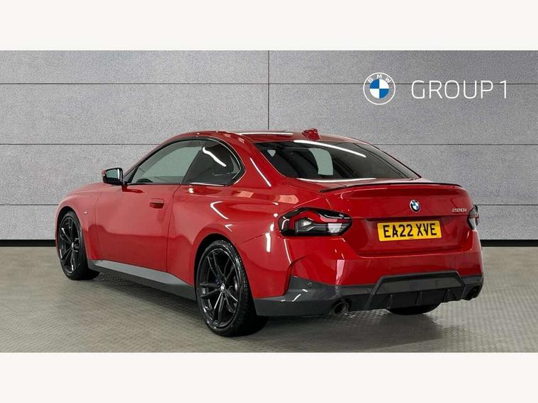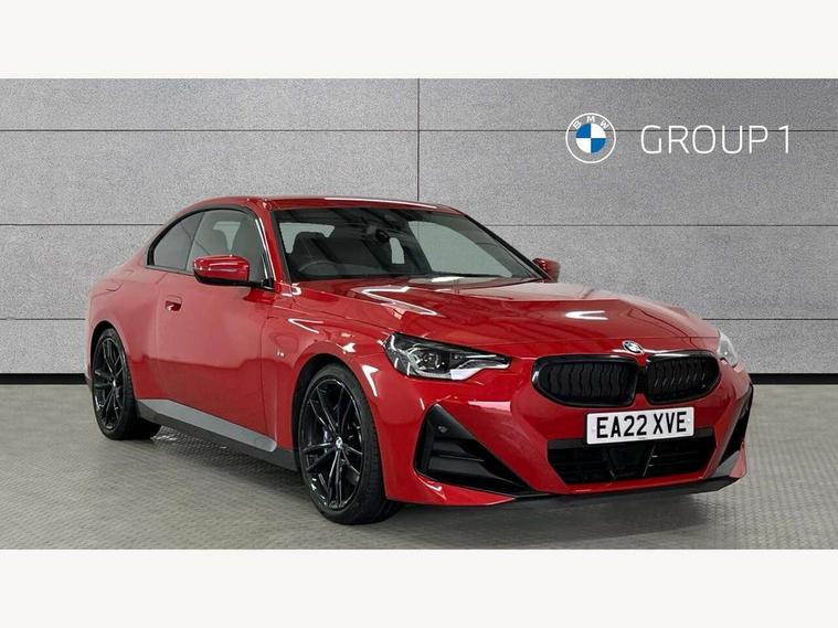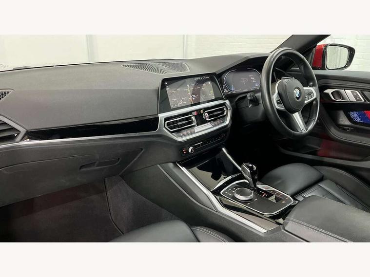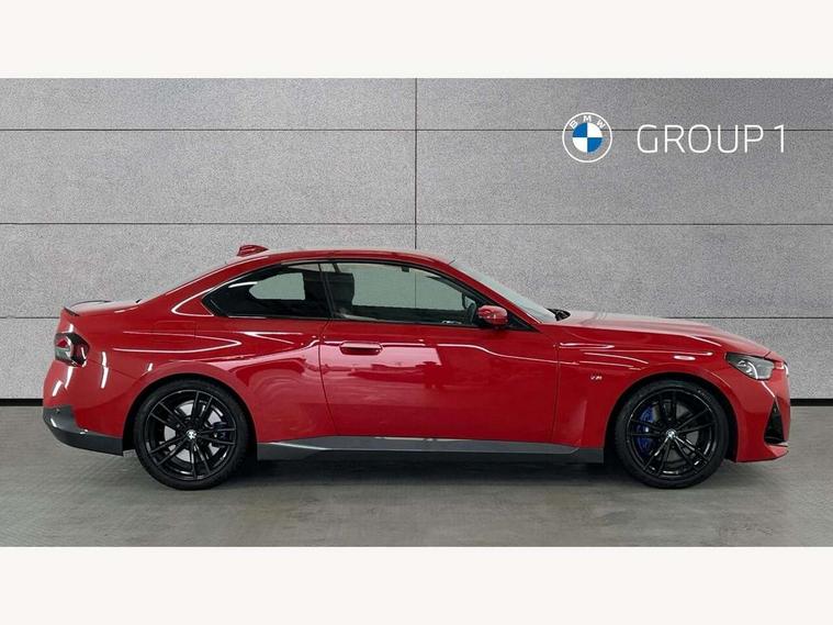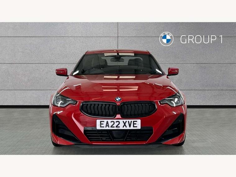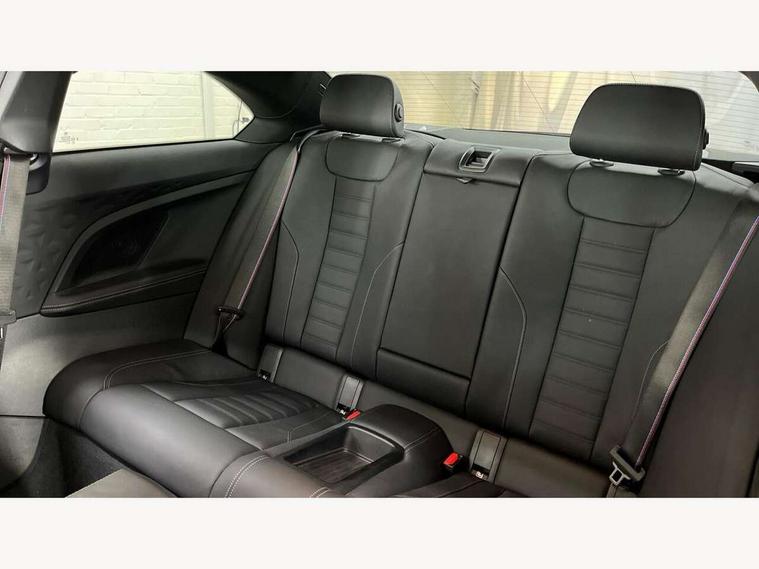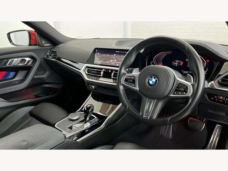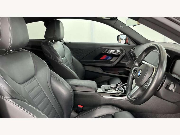 Attentiveness assist, Auto start-stop, Bluetooth, BMW ConnectedDrive online services, BMW Teleservices, Check Control warning system for monitoring of lights and door/luggage compartment open warning, Direct selection buttons, Drive off assistant, Eco pro mode, Electric power steering, Front/rear Parking distance control, iDrive controller with turn and press function, Integrated owners handbook, Intelligent functions, Live cockpit plus with nav function 12.3" instrument cluster and 14.9" centre display, Oil sensor for level and grade, Optimum shift indicator, Personal Profile, Touch operation on control display, Variable sport steering, Widescreen multi-media display, Aluminium lightweight construction, Balancer shaft, BMW TwinPower Turbo four-cylinder petrol engine, Double VANOS, Drive performance control with ECO PRO comfort + sport mode, Electronic differential lock, High precision injection, M sport suspension, Petrol Particulate Filter, Sport automatic steptronic transmission with gearshift paddles, manual gearshift time display, launch control, coasting idle ECO PRO/COMFORT modes, Twin scroll turbocharger with Valvetronic, DAB tuner, Acoustic windscreen wipers for reduced driving noise, Adaptive LED Headlights, Automatic windscreen wipers and automatic headlight, Automatically dimming rear view mirror, Body colour door handles flush with door surface, Body colour door mirrors, Body colour front and rear bumpers, Daytime running lights, Electric windows - front and rear, with open/close fingertip control and trap release, Exhaust tailpipes x2 - 90mm in left and right, Fading support, Front and rear bumper system with replaceable deformation elements, Front door sill finishers in black plastic with BMW designation, Front windscreen wipers with integrated washer jets, Green tinted heat protection glazing, High beam assistant, High gloss shadowline exterior trim in mirror triangle cover, mirror cover panel, mirror bezel and window border, High level third brake light, Indicators integrated int mirror housing, LED registration plate light, LED technology rear tail lights, brake lights and turn indicators, Lightweight engineering, Model designation on right side of tailgate, One piece kidney grille with hight gloss chrome surround, Rear boot, Rear fog lights, Reversing light in rear light cluster, Shark fin antenna, Single part LED rear lights with smoked glass components, Trailer stabilisation logic, Visible VIN plate, 12V power socket in front centre console with blanking plug, 2 cupholders in front centre console, 3 zone automatic air conditioning, Ambient lighting, Compartment in front of cupholder, Conditioned based service, Driver seat backrest width adjustment, Front and rear side armrests integrated into door trim, Front armrest, Front door pockets, Front head restraints, Front sport seats, Heated front seats, Illuminated glove compartment with separate small compartment, M headliner Anthracite, M sport leather steering wheel, Manually adjustment steering wheel column, Rear seat backrest with manual 40:20:40 split folding, Rear seat centre foldable armrest with integrated cup holder, Single front passenger seat, Storage compartment between rear seats, Storage tray and compartment with cover in centre console, Sun visors with vanity mirrors and insert tab, Through loading system with 40/20/40 split folding 2 rear seat in 2nd row, Two folding rear seat headrests, Velour floor mats, Additional storage compartment pack without USB - 2 Series Coupe, Connected pack professional - 2 Series Coupe, Interior and exterior mirror pack - 2 Series Coupe, M Sport exterior styling aerodynamics pack - 2 Series Coupe, 2 tone horn, Anti lock braking system (ABS) with cornering brake control, Automatic Stability Control (ASC), BMW emergency call, Brake drying, Child seat ISOFIX attachment for the two outer rear seats, Crash sensor activating of airbags, Unlocking doors, hazard warning lights, interior light, safety battery terminal, Deactivation of fuel pump in the event of a crash, Driver and front passenger airbags, Driver and front passenger side airbags, integrated in the door side seat backrest bolsters for all seat variants, Dynamic brake control, Dynamic stability control + (DSC+), Dynamic Traction Control - DTC, Electrically operated hand brake including automatic hold function and automatic release when driving off, Front and rear disc brakes, Front passenger airbag deactivation, Head airbags for all 4 outer seats, Manual deactivation of front passenger airbag, Seat belt security check for driver and front passenger, Seatbelt warning, Side impact protection, Three point seat belts on 4 seats including front belt stopper, pyrotechnic belt tensioners and belt force limiters, Tyre pressure sensor, Warning triangle and first aid kit, Alarm system (Thatcham 1) with remote control and electronic engine immobiliser, Central locking switch for all doors, fuel filler cap and luggage compartment, Deadlocking function system to all doors, Drive away locking system on all doors and luggage compartment, Locking wheel bolts, Start/Stop button (illuminated) in centre console with keyless engine start and Auto Start-Stop deactivation button, Two remote control key with integrated key - one button for open and close doors/fuel flap/tailgate and separate button for unlock luggage compartment, BMW mobility tyre sealing system, Electrically powered 12V compressor, Reduced rolling resistance tyres,