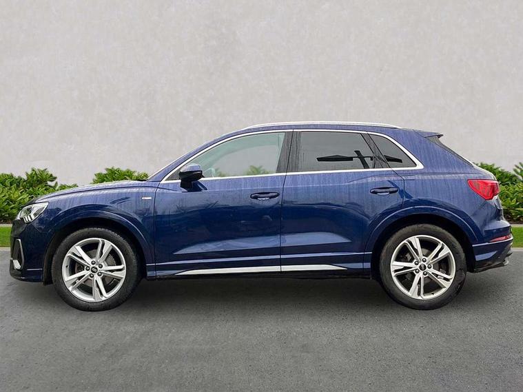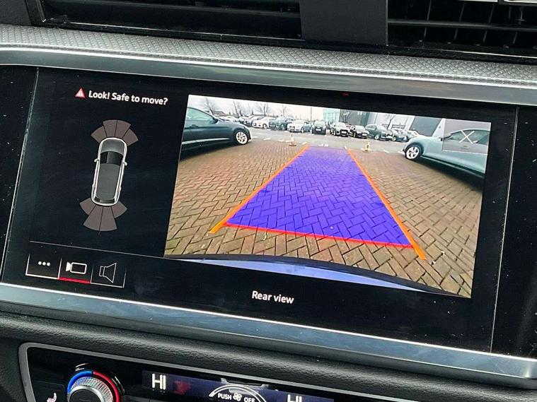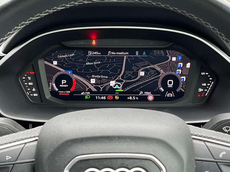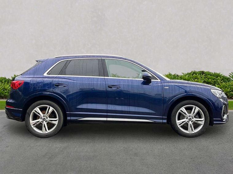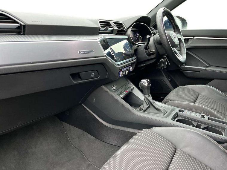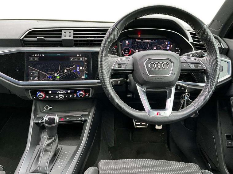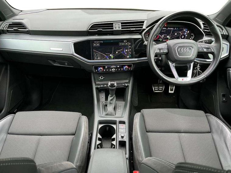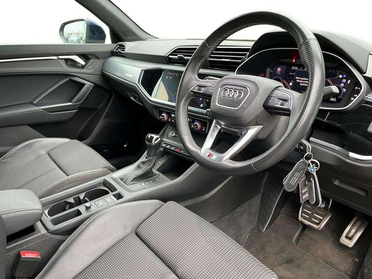 Amazon alexa Integration, Audi drive select, Audi lane departure warning, Audi Virtual Cockpit - 10.25" display, Bluetooth interface, Camera based traffic sign recognition, Legal emergency call, MMI Navigation Plus with high resolution 10.1 inch touchscreen colour display, Power operated tailgate, Progressive steering, Service interval indicator, Smartphone interface includes wireless Apple carplay/Android Auto, Start stop system with recuperation, Voice control system with natural language interaction, Sports suspension, 2 USB-C ports with charge and data functions, 6 passive loudspeakers, DAB digital radio module, Acoustic windscreen, Aluminium roof rails, Aluminium window trim, Auto dimming frameless rear view mirror, Body colour front spoiler blade, Body coloured bumpers, Electrically folding, adjustable and heated door mirrors with integrated LED side indicators and kerb view function for passenger side, Front and rear electric windows, Front fog lights, Front side air inlets in matt platinum grey, Grille vertical bars in aluminium silver/Matt, High gloss black finish B and C pillars, LED Dynamic rear indicators, LED headlights with LED daytime running lights, LED rear lights, LED third brake light, Privacy glass dark tinted rear and rear-side windows (from B-pillar backwards), Rain and light sensors, Rear diffuser grille in grained matt black, Rear diffuser strip in matt titanium black, Rear side wing doors, Rear wiper, S line badges on front wings, S Line front and rear bumpers, Side skirt insert in matt Platinium grey, Titanium black radiator grille, Variable front intermittent wipers, 12V socket in rear centre console, 3 seat bench in 2nd row, 40:20:40 folding with manual adjustment for 60:40 forwards/backwards position and backrest angle, Adjustable rear seat bench/backrest with centre armrest and cupholder, Black cloth headlining, Dual zone electronic climate control, Front and rear black floor mats with contrast stitching in rock grey, Front and rear headrests, Front and rear roof module including reading lights, Front centre armrest, Glove compartment lighting, Height and reach adjustable steering wheel, Illuminated door sill trims with S logo, ISOFIX child seat mounting for front passenger with airbag deactivation and outer rear seat including top tether attachment point for outer rear seats, Luggage compartment light, Manual front seats with height adjustment, Perforated leather gearknob, Single front passenger seat, Stainless steel luggage compartment sill finisher, Stainless steel pedals, Ambient lighting pack - Q3, Non smoking pack - Q3, 3x3 point rear seatbelts, 6 airbags - Driver, front passenger, curtain and side windows, Audi pre-sense front with pedestrain and cyclist recognition, Electrically operated child locks on rear doors, Electromechanical parking brake, Electronic stabilisation control including ABS, ASR and EDL, Front seatbelt reminder, Hill descent control, Hill hold assist, Pre sense basic, Seatbelt monitoring, Tyre pressure warning, Warning triangle and first aid kit, Anti theft alarm, Anti theft wheel bolts, Immobiliser, Remote central locking, Dark matt brushed aluminium inlay, Detail dashboard around MMI touch colour display in glass look, black with surround in aluminium look, Leatherette door armrest,