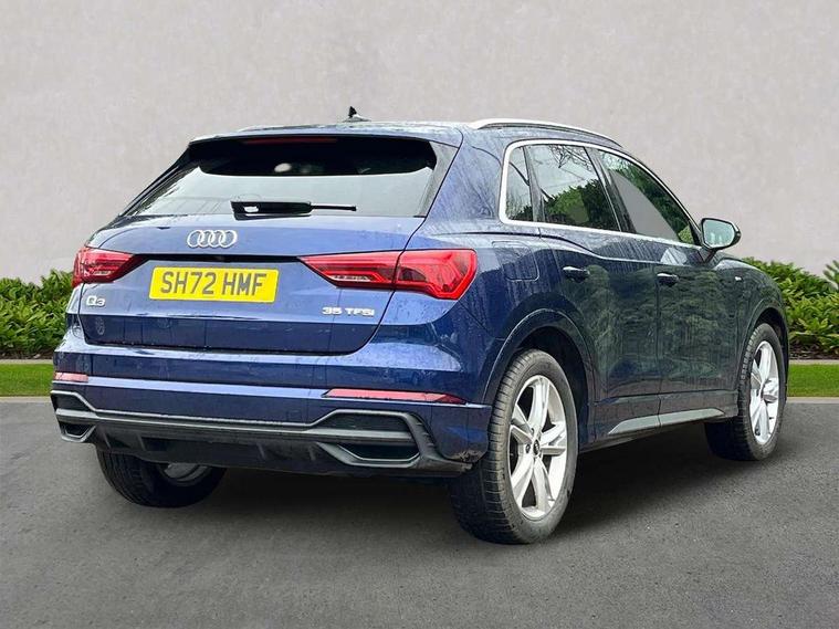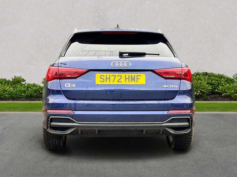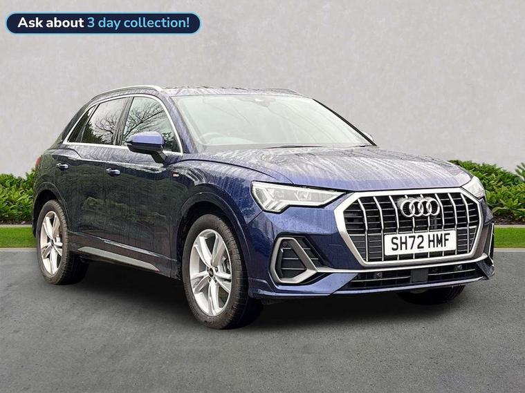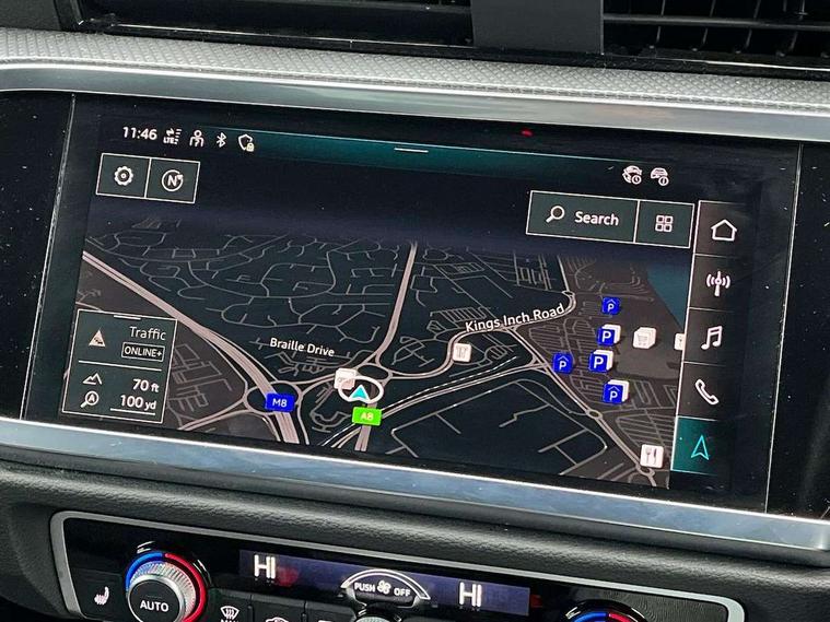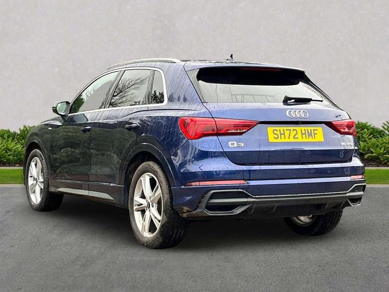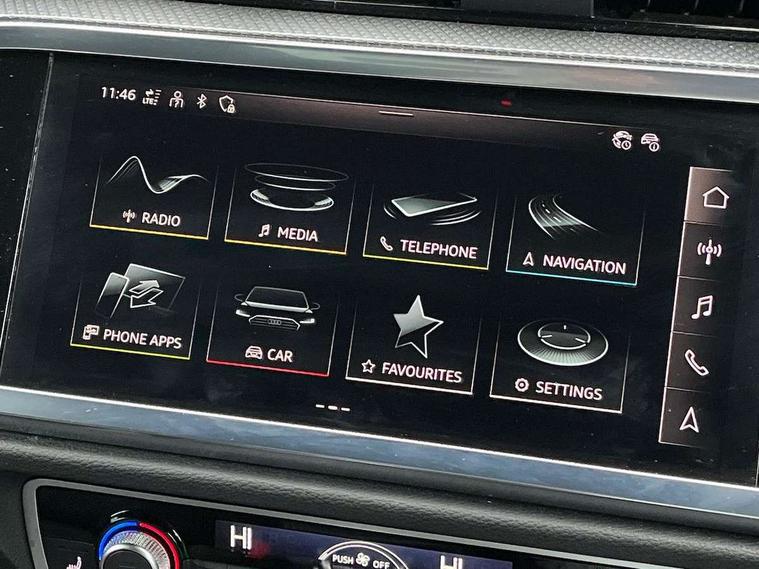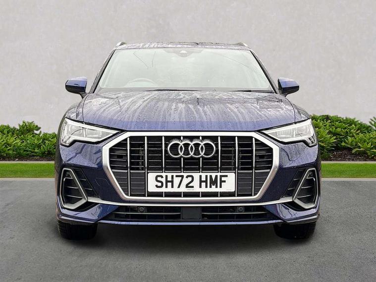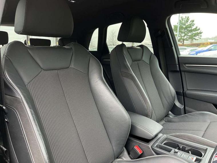 Amazon alexa Integration, Audi drive select, Audi lane departure warning, Audi Virtual Cockpit - 10.25" display, Bluetooth interface, Camera based traffic sign recognition, Legal emergency call, MMI Navigation Plus with high resolution 10.1 inch touchscreen colour display, Power operated tailgate, Progressive steering, Service interval indicator, Smartphone interface includes wireless Apple carplay/Android Auto, Start stop system with recuperation, Voice control system with natural language interaction, Sports suspension, 2 USB-C ports with charge and data functions, 6 passive loudspeakers, DAB digital radio module, Acoustic windscreen, Aluminium roof rails, Aluminium window trim, Auto dimming frameless rear view mirror, Body colour front spoiler blade, Body coloured bumpers, Electrically folding, adjustable and heated door mirrors with integrated LED side indicators and kerb view function for passenger side, Front and rear electric windows, Front fog lights, Front side air inlets in matt platinum grey, Grille vertical bars in aluminium silver/Matt, High gloss black finish B and C pillars, LED Dynamic rear indicators, LED headlights with LED daytime running lights, LED rear lights, LED third brake light, Privacy glass dark tinted rear and rear-side windows (from B-pillar backwards), Rain and light sensors, Rear diffuser grille in grained matt black, Rear diffuser strip in matt titanium black, Rear side wing doors, Rear wiper, S line badges on front wings, S Line front and rear bumpers, Side skirt insert in matt Platinium grey, Titanium black radiator grille, Variable front intermittent wipers, 12V socket in rear centre console, 3 seat bench in 2nd row, 40:20:40 folding with manual adjustment for 60:40 forwards/backwards position and backrest angle, Adjustable rear seat bench/backrest with centre armrest and cupholder, Black cloth headlining, Dual zone electronic climate control, Front and rear black floor mats with contrast stitching in rock grey, Front and rear headrests, Front and rear roof module including reading lights, Front centre armrest, Glove compartment lighting, Height and reach adjustable steering wheel, Illuminated door sill trims with S logo, ISOFIX child seat mounting for front passenger with airbag deactivation and outer rear seat including top tether attachment point for outer rear seats, Luggage compartment light, Manual front seats with height adjustment, Perforated leather gearknob, Single front passenger seat, Stainless steel luggage compartment sill finisher, Stainless steel pedals, Ambient lighting pack - Q3, Non smoking pack - Q3, 3x3 point rear seatbelts, 6 airbags - Driver, front passenger, curtain and side windows, Audi pre-sense front with pedestrain and cyclist recognition, Electrically operated child locks on rear doors, Electromechanical parking brake, Electronic stabilisation control including ABS, ASR and EDL, Front seatbelt reminder, Hill descent control, Hill hold assist, Pre sense basic, Seatbelt monitoring, Tyre pressure warning, Warning triangle and first aid kit, Anti theft alarm, Anti theft wheel bolts, Immobiliser, Remote central locking, Dark matt brushed aluminium inlay, Detail dashboard around MMI touch colour display in glass look, black with surround in aluminium look, Leatherette door armrest,