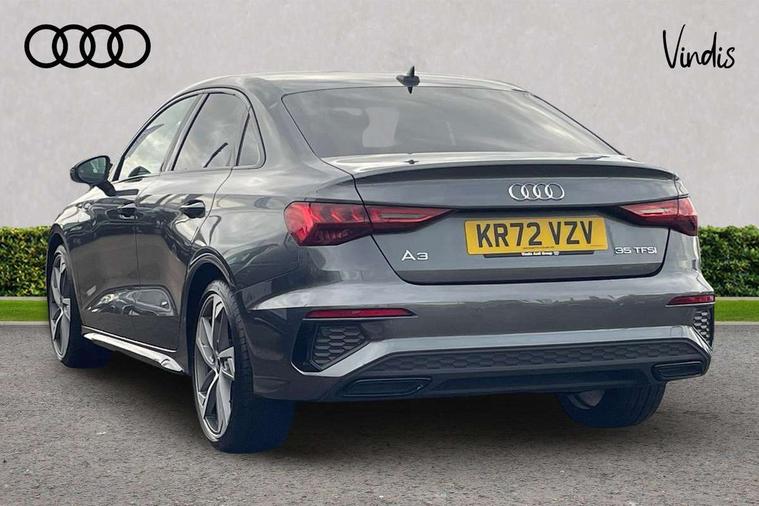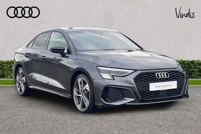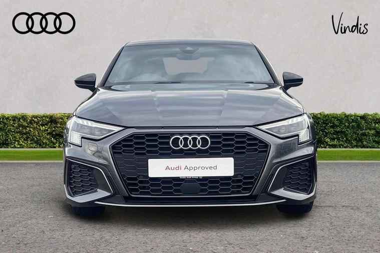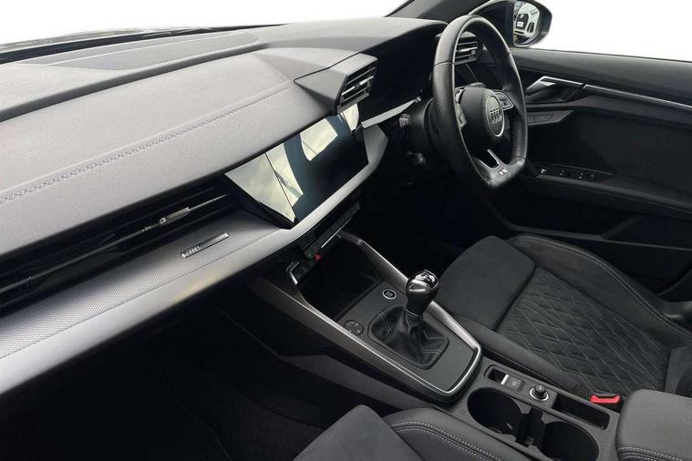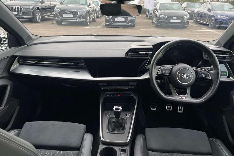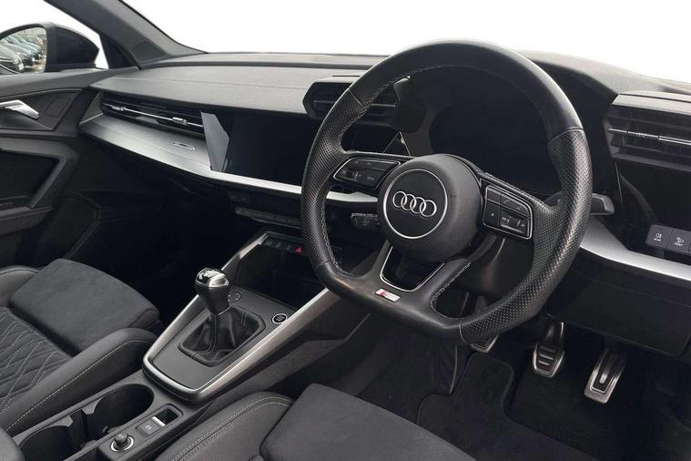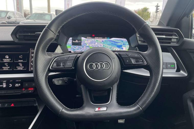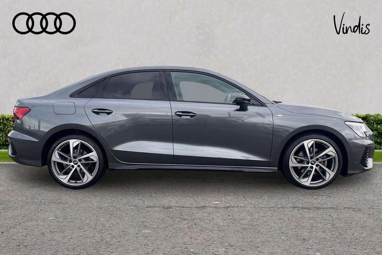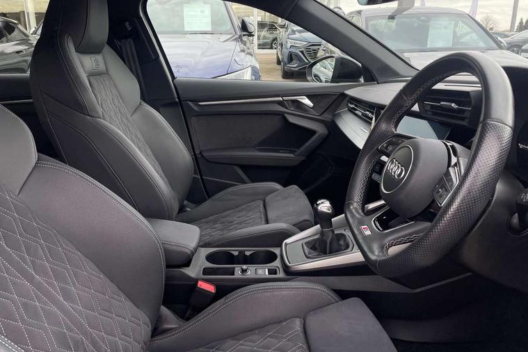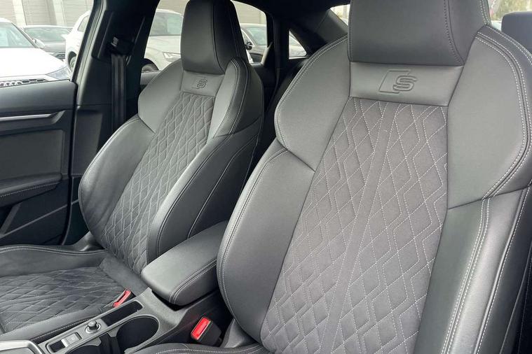 Audi connect emergency call and service, Audi drive select (Auto, Comfort, Dynamic, Efficiency and Individual), Audi smartphone interface, Audi virtual cockpit plus - 12.3" dynamic digital instrument cluster, Automatic start/stop system with recuperation, Bluetooth interface, Collision avoidance assistant, Cruise control + speed limiter, Electromechanical power speed sensitive steering, Lane departure warning system, MMI Navigation Plus with high resolution 10.1" colour touch screen display, Rear parking sensors, Service indicator, Voice control system with natural language interaction, Sports suspension, 2x USB Type C ports (for charging and data transfer), 6 passive loudspeakers, CD player, DAB Digital radio, 3rd brake light, Acoustic glass windscreen, Audi matrix LED headlights, LED rear lights, dynamic front and rear indicators and headlight cleaning system, Auto dimming frameless rear view mirror, Electrically adj heated/folding + automatically dimming exterior mirrors with memory + automatic kerb side function for passenger side exterior mirror, Front electric windows, Illuminated door sills with aluminium inserts at the front with S logo, Integrated LED indicators in door mirrors, LED daytime running lights, Light and rain sensors, Model and engine designation badges at rear, Privacy glass - dark tinted rear window, rear door and side windows, Rear boot, Rear electric windows, Rear side wing doors, S roof spoiler, 12V socket and storage compartment in front centre console, 3 seat bench in 2nd row, 3 spoke flat bottomed multifunction plus sports contour leather wrapped steering wheel, 4 way electrically adjustable lumbar support for driver and front passenger, 40/20/40 split folding rear seat bench with cupholder, Black cloth headlining, Dual zone electronic climate control, Electrically adjustable front seats with memory function for driver's side and exterior mirrors, Front and rear centre armrest in leather, Front and rear headrests, Front/rear floor mats, Heated front seats, Height and reach adjustable steering wheel, Illuminated vanity mirror, Interior lighting - glove compartment light and right hand side, Luggage compartment floor covering, Single front passenger seat, Stainless steel pedals and front footrest in black, Aluminium interior elements pack - A3, Dinamica microfibre/mono.pur 550 artificial leather pack - A3 Saloon, Extended ambient lighting pack - A3/S3 Saloon, LED interior lighting pack - A3 Saloon, 3x3 point rear seat belts, Driver and front passenger airbag with passenger airbag deactivation, Electronic Stabilisation Control (ESC) including ABS, ASR and EDL, First aid kit with warning triangle and 2 safety vests, Front side airbags with head airbags and interaction airbag, Hill hold assist, Pre-sense front with pedestrian and cyclist detection, Seatbelt monitoring, Tyre pressure loss indicator, Anti theft alarm, Anti-theft wheel bolts, Electronically operated child locks, Immobiliser, Remote control central locking, Aluminium air vent surrounds, Aluminium trim elements, Dark spectrum aluminium inlays, accent surfaces in the dashboard and centre console in platinum grey silk effect paint finish, 19" 5 arm trapezoid design alloy wheels in titanium matt grey with diamond cut finish,