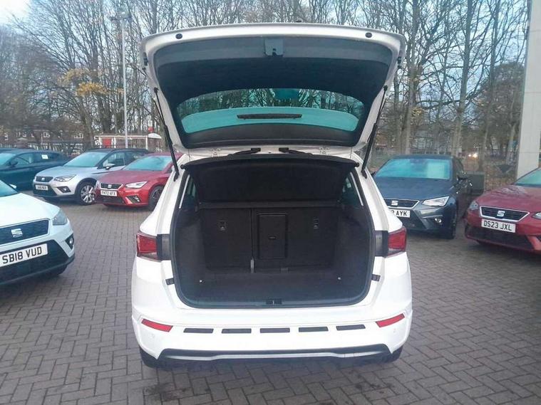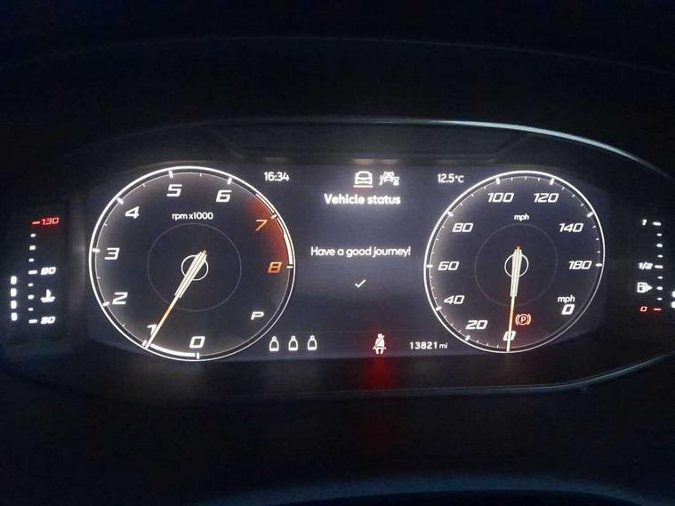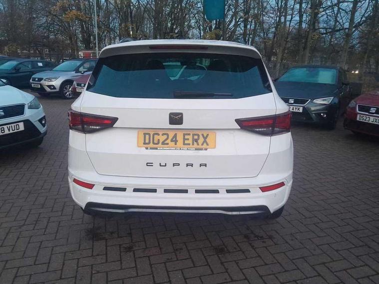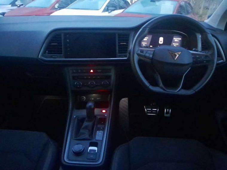 Cruise control system with speed limiter, Digital cockpit, Driving profile selection and conventional shock absorber, E-call, Outside temperature gauge, Progressive power assisted steering, Self parking functionality (includes front and rear parking sensors), Trip computer, Wireless full link smartphone integration, Wireless phone charger, Front and rear shock absorption, chassis with increased ride height, Steering wheel mounted audio/phone controls, Body colour bumpers with dark aluminium diffusor, Body coloured wheel arch surrounds, Dark tinted rear windows, Daytime running lights, Door mirrors with welcome CUPRA light silhouette, Dynamic headlight range control with self adjusting whilst driving, Electric adjustable/heated/folding door mirrors, Front and rear electric windows, Front grille frame in chrome, Full LED headlamps with lens and LED front fog lamps with cornering function, Gloss black door mirrors, Gloss black roof rails, Gloss black side mouldings, Gloss black side window trim, Illuminated aluminium front door sill, LED rear tail lights with dynamic indicators, Rear fog lights, Rear side wing doors, Rear spoiler, Rear wash/wipe, Specific CUPRA design front bumper, Standard rear exhaust tailpipes, Third brake light, 12V socket in front, 3 seat bench in 2nd row, 60/40 split folding rear seat, Aluminium pedals, Bucket sport seats in dinamica upholstery, Cupra steering wheel emblem, Document holder under left front seat, Dual zone climate control, Front and rear head restraints, Front centre armrest, Front seat back storage pockets, Grey roof lining, Heated steering wheel, Height adjustable driver and passenger seat with lumbar adjustment, ISOFIX points in outer rear seats with top tether anchorage points, Leather steering wheel and gear knob, Multicoloured ambient lighting with LED interior illumination, Pedal cluster, Rear armrest and easy back seat release mechanism from boot, Single front passenger seat, Sports steering wheel, Steering wheel mounted gearshift paddles, Storage compartment in roof console for sunglass, Storage compartment under driver's seat, Convenience pack - Ateca, Interior lighting pack - Ateca, Navigation system plus pack with DAB - Ateca, Safety and driving pack - Ateca, 3x3 point rear seatbelts, ABS, Traction control system (TCS), Electronic stability control (ESC) and Electronic differential lock system (XDS), Airbags - Driver and front passenger airbag with deactivation, front side, two curtain and driver's knee airbags, Black brake callipers with CUPRA logo, Electric parking brake with auto hold function, Front and rear seatbelt reminder, Front assist with autonomous emergency braking, Hill hold control, Manual rear child locks, Single tone horn, Tiredness recognition system, Tyre pressure monitoring system, Alarm, Keyless entry, Locking wheel bolts, 19" Sport machined alloy wheels 36/3 in black/silver,