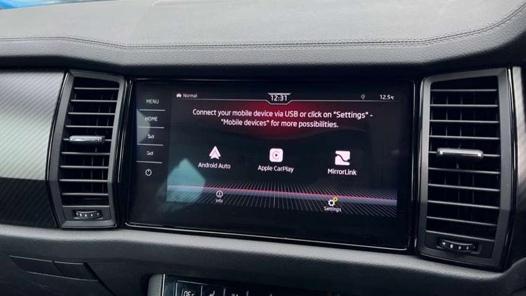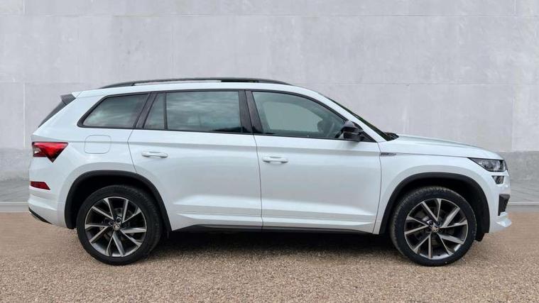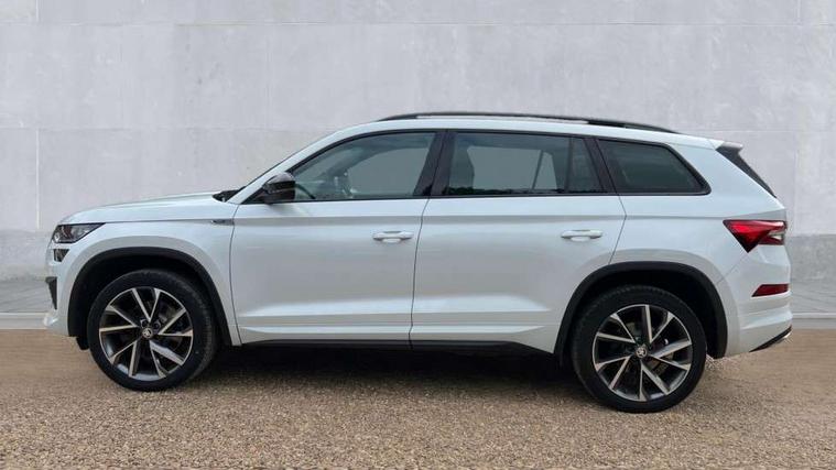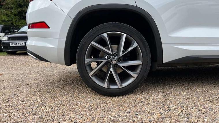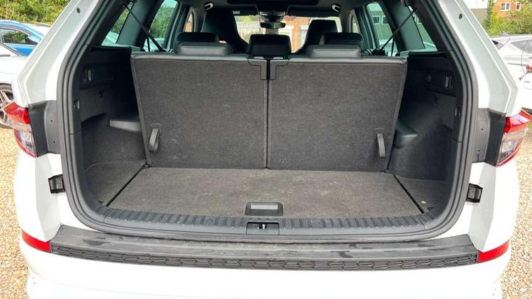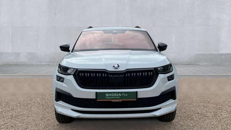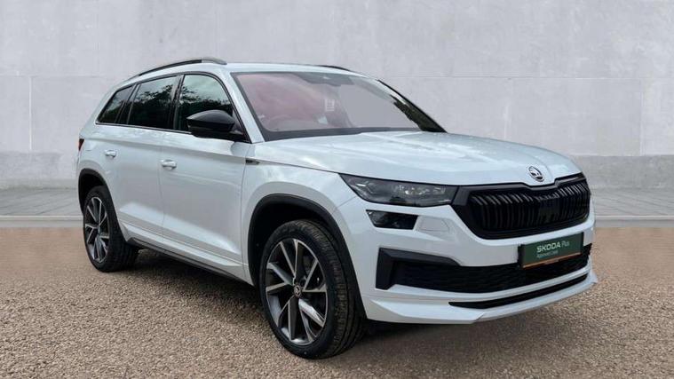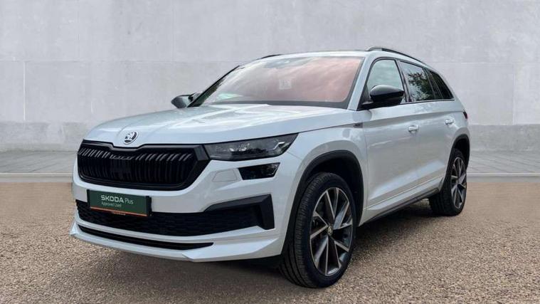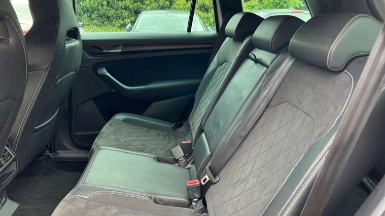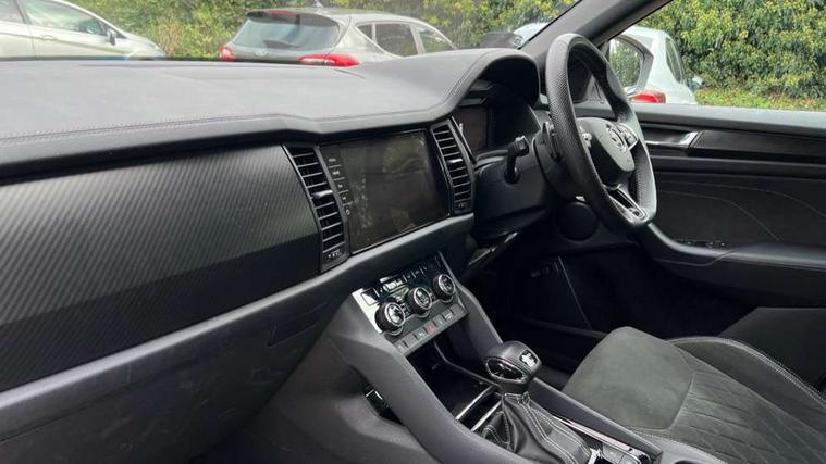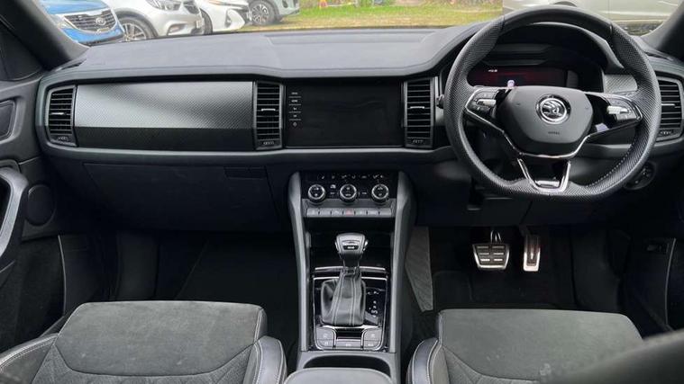 Bluetooth system, Columbus satellite navigation with 9.2" touchscreen, integrated Wi-Fi, web radio, Digital voice enhancement, E-call, ECO Stop/start function, Exterior temperature indicator, Progressive steering, Rear view camera, Smartlink wireless for apple carplay and wired for android auto, Speed limiter, Tailgate unlocking from outside, USB C Port x 2 in front centre console, Wireless charging, 8 Speakers, DAB Digital radio, Aero front windscreen wipers with intermittent function, Aero rear window wiper, Auto dimming rear view mirror, Black roof rails, Black sports styling including front grille and window surrounds, Black wheel arch surrounds, Body colour bumpers, Body colour door handles, Electric adjustable/heated/folding door mirrors, driver side auto dimming with boarding sports and memory function, Electric front and rear windows, Extended rear spoiler with finlets in gloss black, Front fog lights, Full LED matrix headlights with AFS (adaptive front light system), cornering function and AWL (all weather lighting system), Gloss black door mirrors, Headlight washers, Heated rear window, Invisible tailpipe, LED daytime running lights, LED rear fog light, LED third brake light in rear spoiler, Light assistant (coming/leaving home/tunnel light), Off-road style lower front bumper element, Privacy glass, Rain and light sensors, Rear diffuser, Rear LED lights (high functionality) with welcome effect and dynamic indicators, Rear side wing doors, Safety reflectors on front and rear doors, Sportline badge on front fender, Sports front and rear bumpers including lower rear chrome strip, Tailgate lettering in Black, Window control switches with black trim, Without engine designation, 12V socket in boot, 2 rails with 2 hooks, 2 seat bench in 3rd row, 3 seat bench in 2nd row, 4 foldable roof handles with rear coat hooks, 60:40 foldable rear seat with sliding adjustment and backrest angle adjustment, Aluminium pedals, Black roof headlining, Bottle holders in door panel in the 1.5 litre front and 1 litre rear, Cargo storage compartments, Chrome headlight control button, Chrome interior door handles, Coat hooks on B pillar, Covered storage compartment on driver side, Front centre armrest with storage compartment, cup holder and 12V socket, Front courtesy lights, Gear shift lever with chrome frame and black gloss insert, Grey stitching in front and rear armrests and door armrests + door inserts, Height adjustable front headrests, Illuminated and cooled glovebox, Illuminated luggage compartment, Isofix child seat fittings in outer rear seats with top tether, Manually adjustable steering column, Microsuede door panels, Net programme in boot (1x horizontal Net, 2x vertical Nets), Overhead glasses storage compartment, Pollen filter, Rear centre armrest with cupholders, Single front passenger seat, Sliding trunk cover, Small Bags on the inner sides of the front backrests, Sports seats, Sunvisors with illuminated vanity mirrors, Three rear height adjustable headrests, Ticket holder on A Pillar, Umbrella in door panel, Variable boot floor, LED Interior light pack - Kodiaq, Auto door release and activation of warning lights in the event of an accident, Child locks on rear doors, Driver and front passenger airbag with knee airbag and front passenger airbag deactivation, Electronic parking brake with hill start assist, Emergency rear braking signal, ESC (incl. ABS+MSR+ASR+EDS+HBA+DSR+RBS+MKB), Front assist with autonomous emergency braking, Front side airbags with curtain airbags, Fuel cut off safety device, Height adjustable front 3 point seatbelts + pretensioners, Hill hold control, Rear disc brakes, Safety vest holder in door, Seat belt reminder for all seats, Three point rear seat belts, Two tone horn, Tyre pressure monitor, Alarm with interior monitoring and tilt sensor with safe function, Anti-theft wheel bolts, Immobiliser, Keyless entry and start system (KESSY), Remote central locking with 2 keys, Black air vent surround, Carbon finish dashboard and door inserts, Grey stitching in dashboard, 20" Vega Anthracite alloy wheels, Temporary spare wheel (space saver),