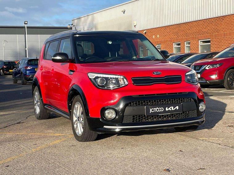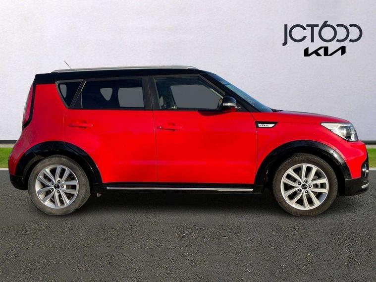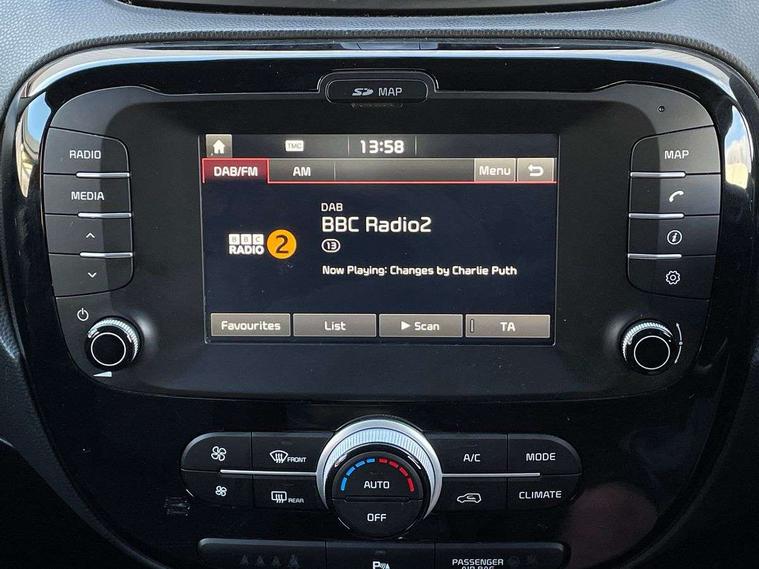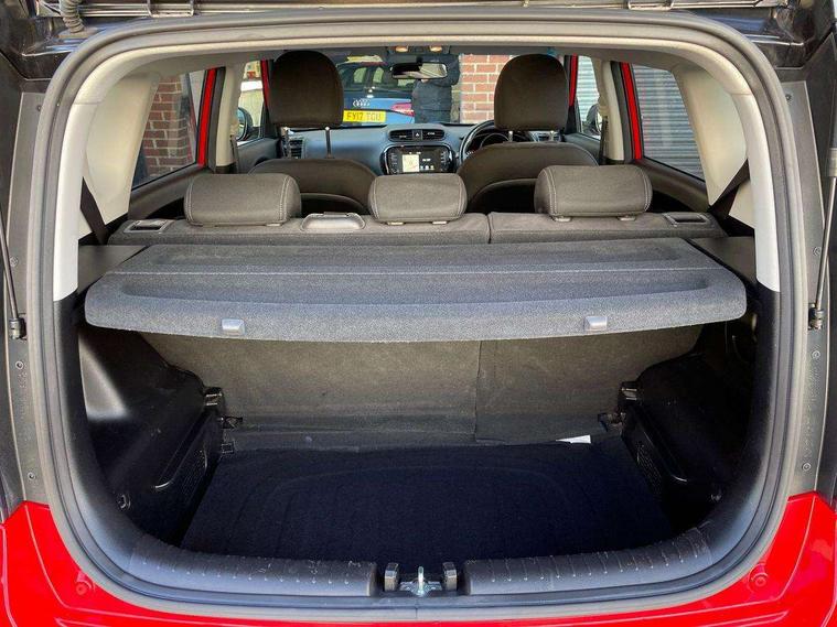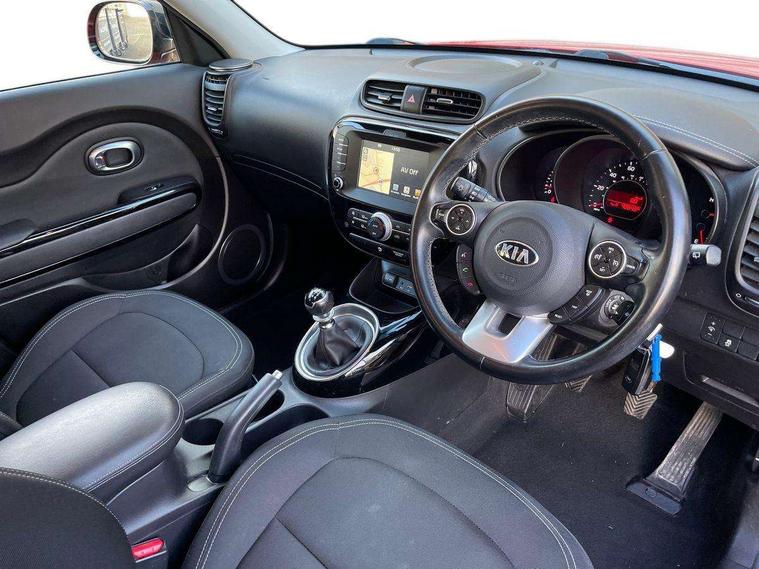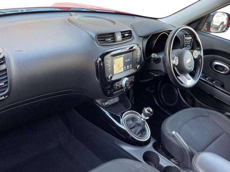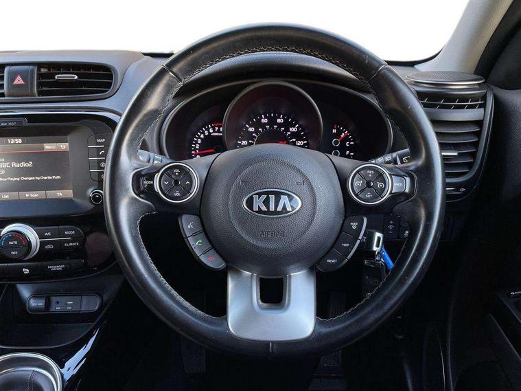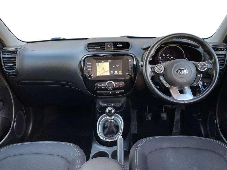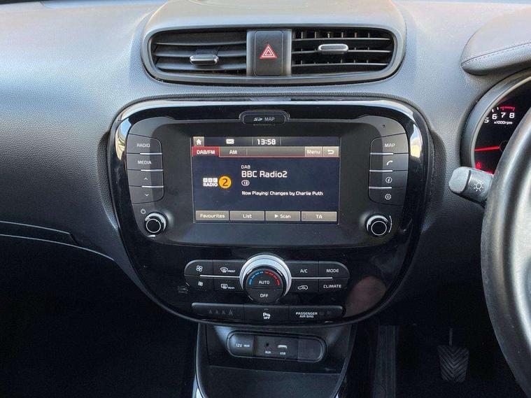 7" Navigation with apple car play/Android Auto, Bluetooth connectivity with voice control, Cruise control + speed limiter, Emergency stop signalling system, Flex Steer variable steering settings, PAS, Rear parking sensors, Reversing camera, Trip computer, 6 speakers, Bluetooth audio streaming, DAB Radio/CD + MP3, Steering wheel mounted audio controls, USB and auxiliary socket, Auto dimming rear view mirror, Automatic lighting control, Black high gloss door mirrors, Black high gloss front & rear bumper inserts, Body colour door handles, Body colour door mirrors, Chrome grille, Electric adjustable door mirrors, Electric folding door mirrors, Electric front windows/one touch facility, Electric rear windows, Front fog lights, Heated door mirrors, LED daytime running lights, LED rear lights, Privacy glass tailgate, Rear privacy glass, Rear wash/wipe, Roof rails, Tinted glass, Variable intermittent front wash/wipe, 12v power outlet - front, 60/40 split folding rear seat, Automatic air conditioning, Centre console storage tray, Centre console with cupholders, Cloth upholstery, Faux leather console surround, Faux leather door trim, Front head restraints, Gloss black door armrest, Height adjustable driver's seat, High gloss black steering wheel trim, Illuminated ignition key hole, Isofix child seat attachment, Leather steering wheel and gearshift, LED interior illumination, Load cover, Luggage area lamp, Luggage net with hooks, Rear headrests, Satin chrome interior door handles, Seatback pockets, Silver interior door handles, Sliding sunvisors with illuminated vanity mirrors, Tilt/telescopic adjustable steering wheel, Urban styling pack - Soul, 3x3 point rear seatbelts, ABS/EBD, Automatic unlocking of doors in case of impact, Curtain airbags, Driver/Front Passenger airbags, Dual Side airbags, ESC + BAS + VSM + HAC, Front side airbags, Hill start assist, Side airbags, Traction control, Tyre pressure monitoring system, Deadlocks, Folding key, Immobiliser, Remote central door locking, Speed sensitive auto door locking, High gloss black centre fascia, 17" Alloy wheels, Temporary spare wheel,