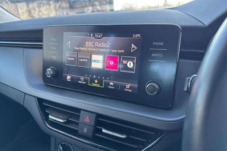 Bluetooth system, E-call, Front assist system, PAS, Service indicator, Speed limiter, Wireless Smartlink for Apple CarPlay (wired for Android Auto), 8 Speakers, Auxiliary input socket, DAB Digital radio, Body colour bumpers, Body colour door mirrors and handles, Chrome grille surround, Dimming rear view mirror with black surround, Electrically adjustable and heated door mirrors, Front and rear electric windows, Headlight range control, Heated rear window, LED rear lights - low functionality, LED third brake light, Light sensors, Rain sensor, Rear fog lights, Rear side wing doors, Rear wiper, 12V Accessory socket in centre console, 3 seat bench in 2nd row, Chrome inner door handles, Cloth upholstery, Front head restraints, Glove compartment with illumination, Ice scraper, Isofix child seat fittings on outer rear seats, ISOFIX on front passenger seat, Manual lumbar support for front seats, Rake/reach adjustable steering wheel, Reading lights, Single front passenger seat, Sun visors with illumination on front passenger, Textile floor mats, Third rear headrest, Top tether for front passenger seat, Umbrella in driver's door, 3x3 point rear seatbelts, Airbags - driver and front passenger, ESP, Front passenger airbag deactivation switch, Front side airbags with curtain airbags, Hill hold control, Manual parking brake, Manual rear child locks, One tone horn, Rear disc brakes, Seatbelt reminder for driver an co-driver, Traction control, Tyre pressure monitor, Anti-theft alarm system with interior monitoring, backup horn, towing protection and remote central locking with SAFE system, Anti-theft wheel bolts, Electronic engine immobilizer,