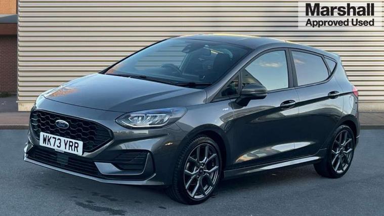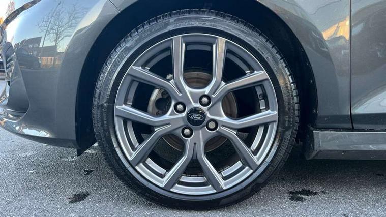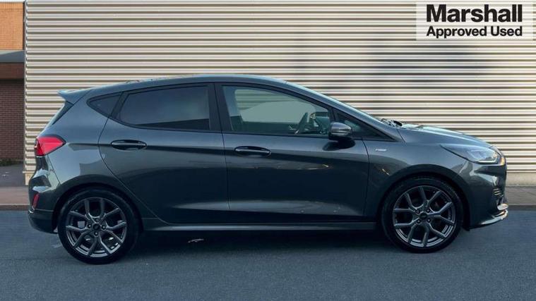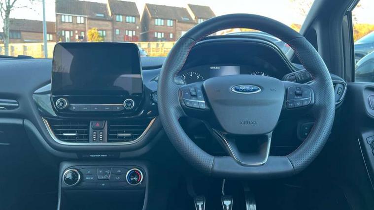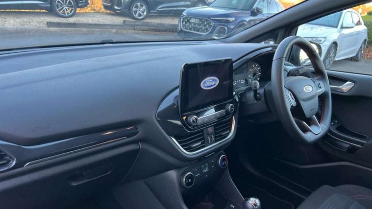 4.2" Colour TFT Ice blue illumination analogue cluster, Driver alert system, Electric power steering, Ford easy fuel, Lane keep assist, Lane keeping aid, Rear parking distance sensors, Selectable drive modes (Normal, Sport, Track), Trip computer, Sports suspension, 3rd brake light, Auto high beam, Automatic headlights, Body colour bumpers, Body colour large rear spoiler, Body coloured electrically operated with side indicators, Electric front windows/one touch facility, Electric rear windows, Quickclear heated windscreen, Rain sensing wipers and auto dimming rear view mirror, Rear privacy glass, Rear side wing doors, Rear wiper, Unique ST-Line grille, full bodystyling kit and large body coloured rear spoiler, 3 rear headrests, 3 seat bench in 2nd row, Adjustable head restraints, Black headlining, Centre console with opening armrest, 2x cupholders, 12v and USB, Cloth upholstery with red stitching, Leather gear knob, Manual 2 way passenger seat adjust, Manual 4-way driver seat adjust, Manual air conditioning, Premium floor mats, Sensico wrapped steering wheel, Single front passenger seat, 3 point seatbelts on all rear seats, Electronic stability control with hill start assist, Front and rear seat belt warning, Manual child lock in rear doors, Tyre pressure monitoring system, Keyless start with 'Ford Power' starter button, MyKey system, Remote central locking, Thatcham alarm with power door dead locks, 17" 5x2 spoke alloy wheels with rock metallic finish,